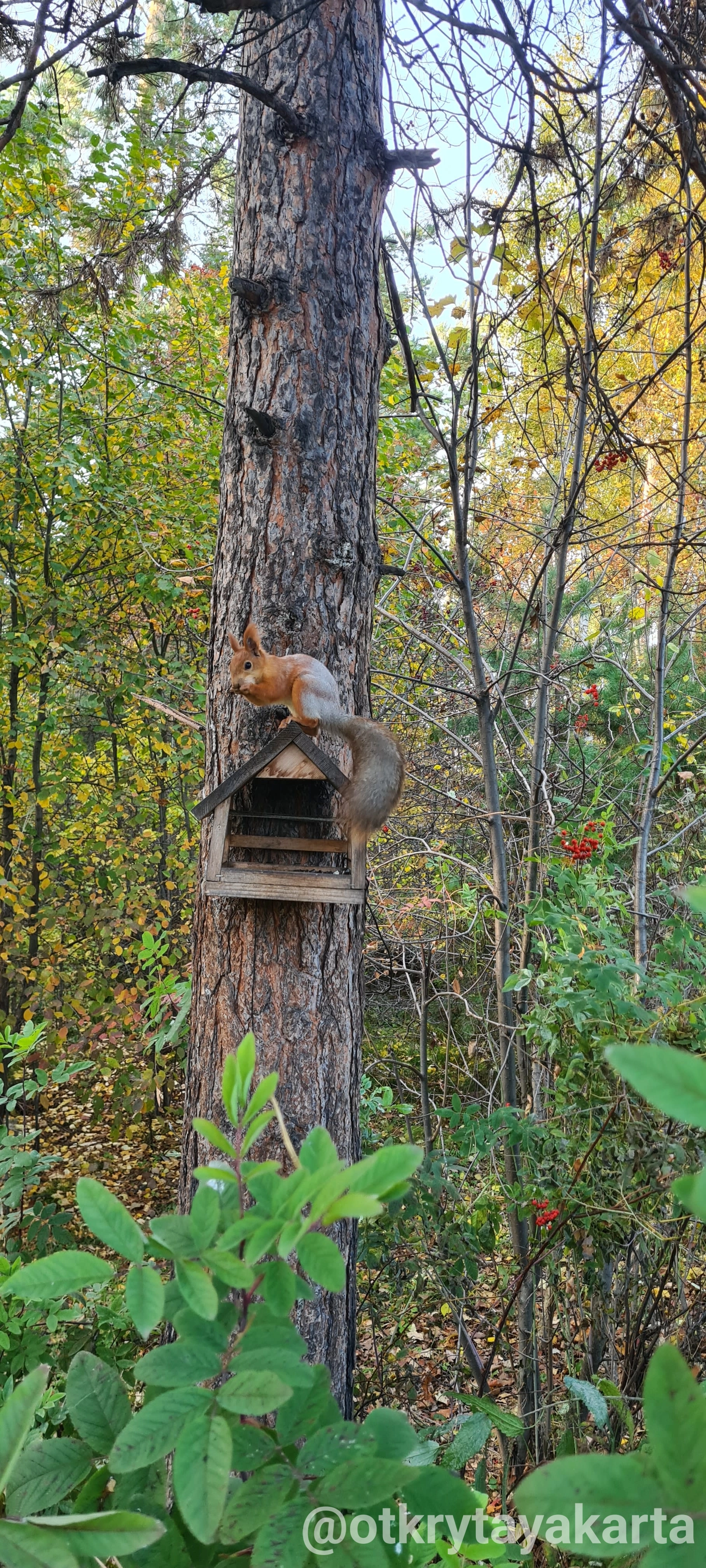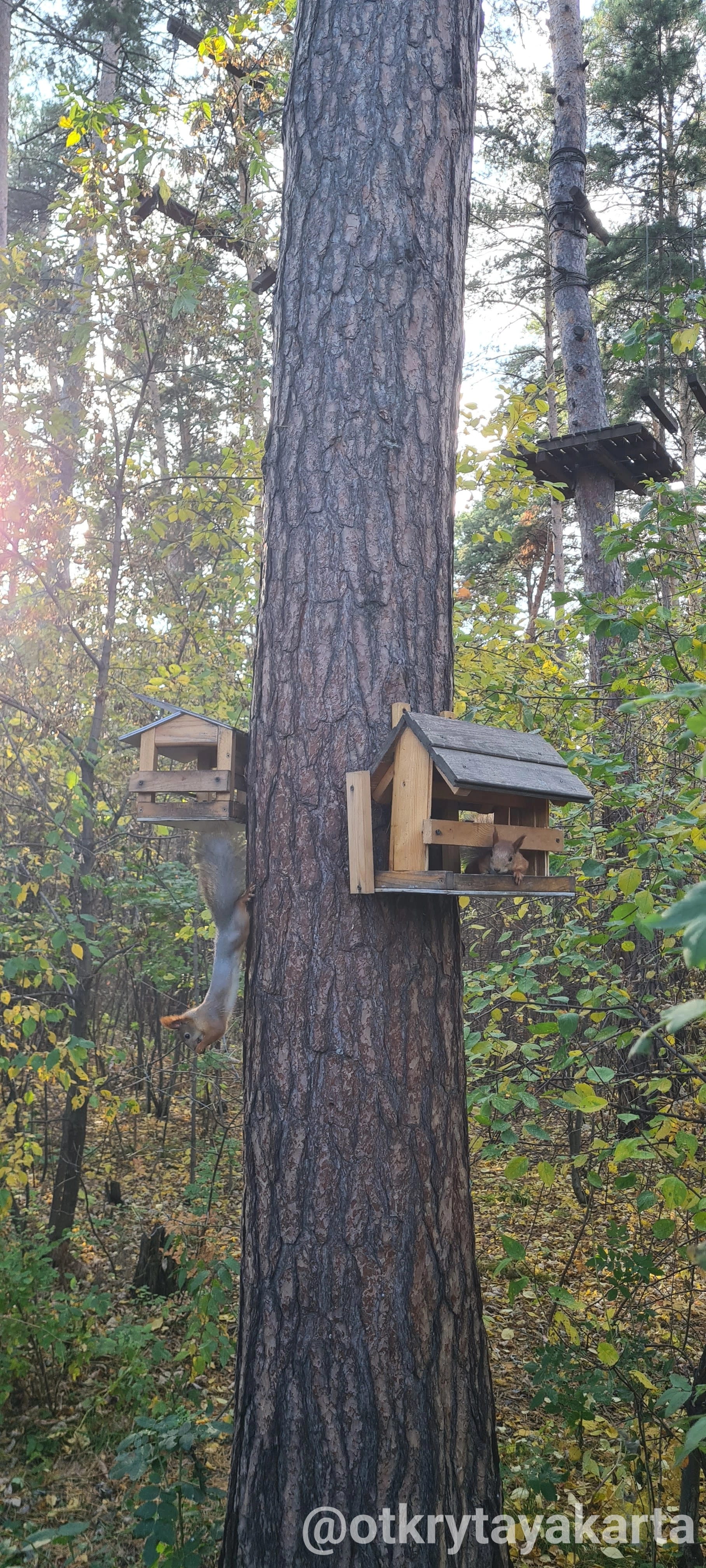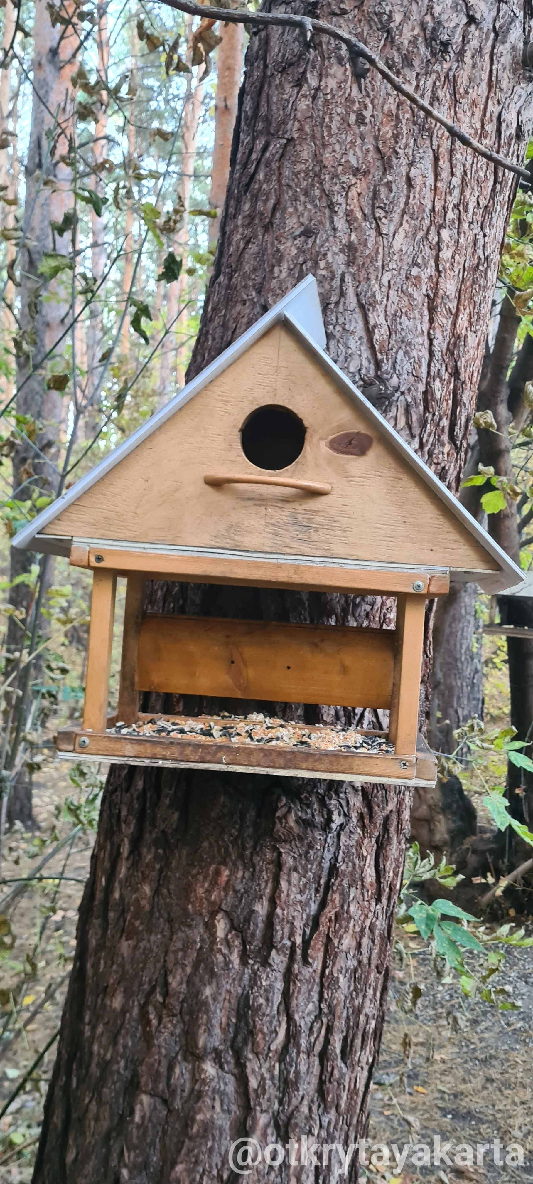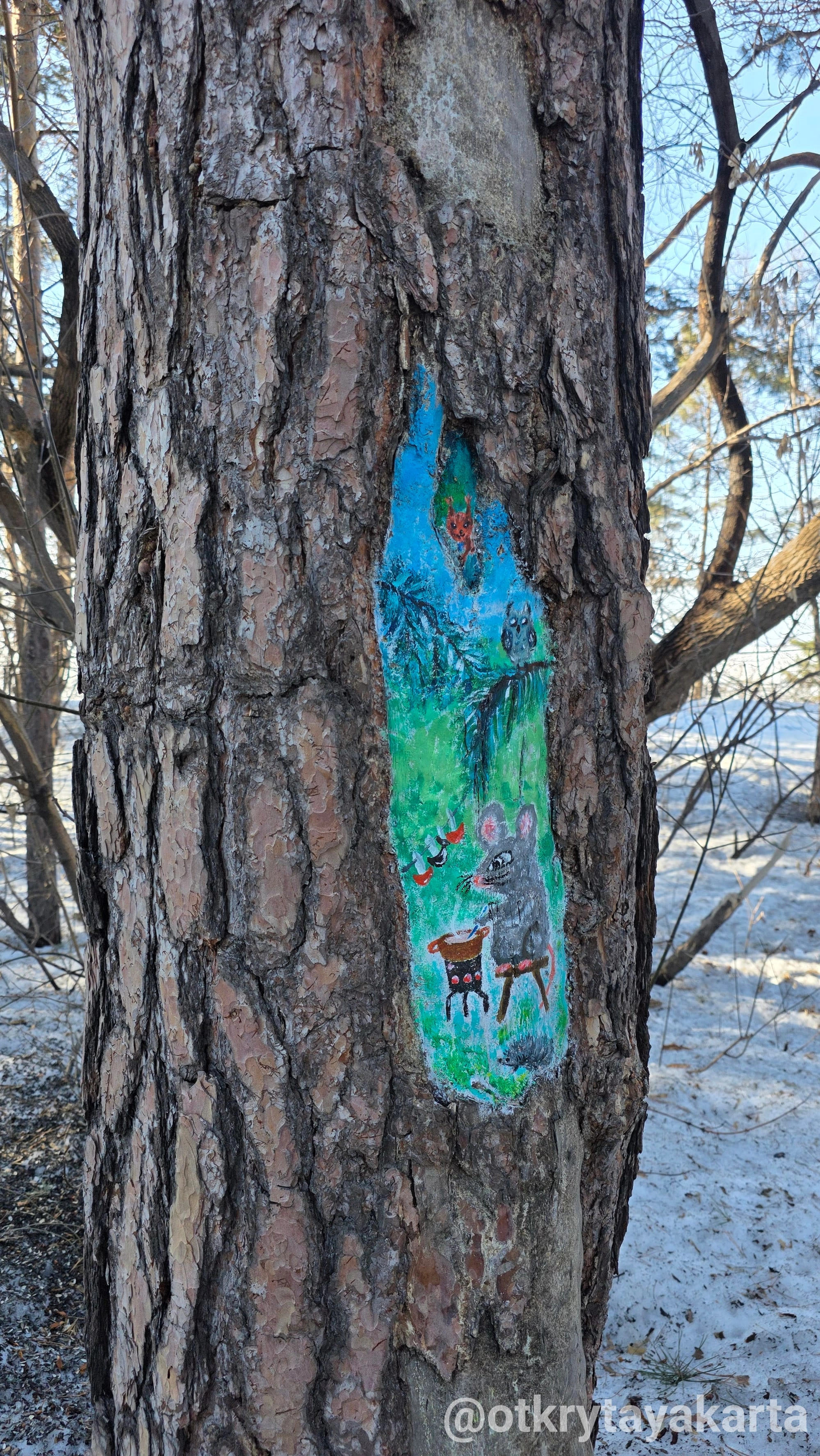 Встречаются рисунки и поделки на деревьях. Много разных кормушек для птиц и белок.