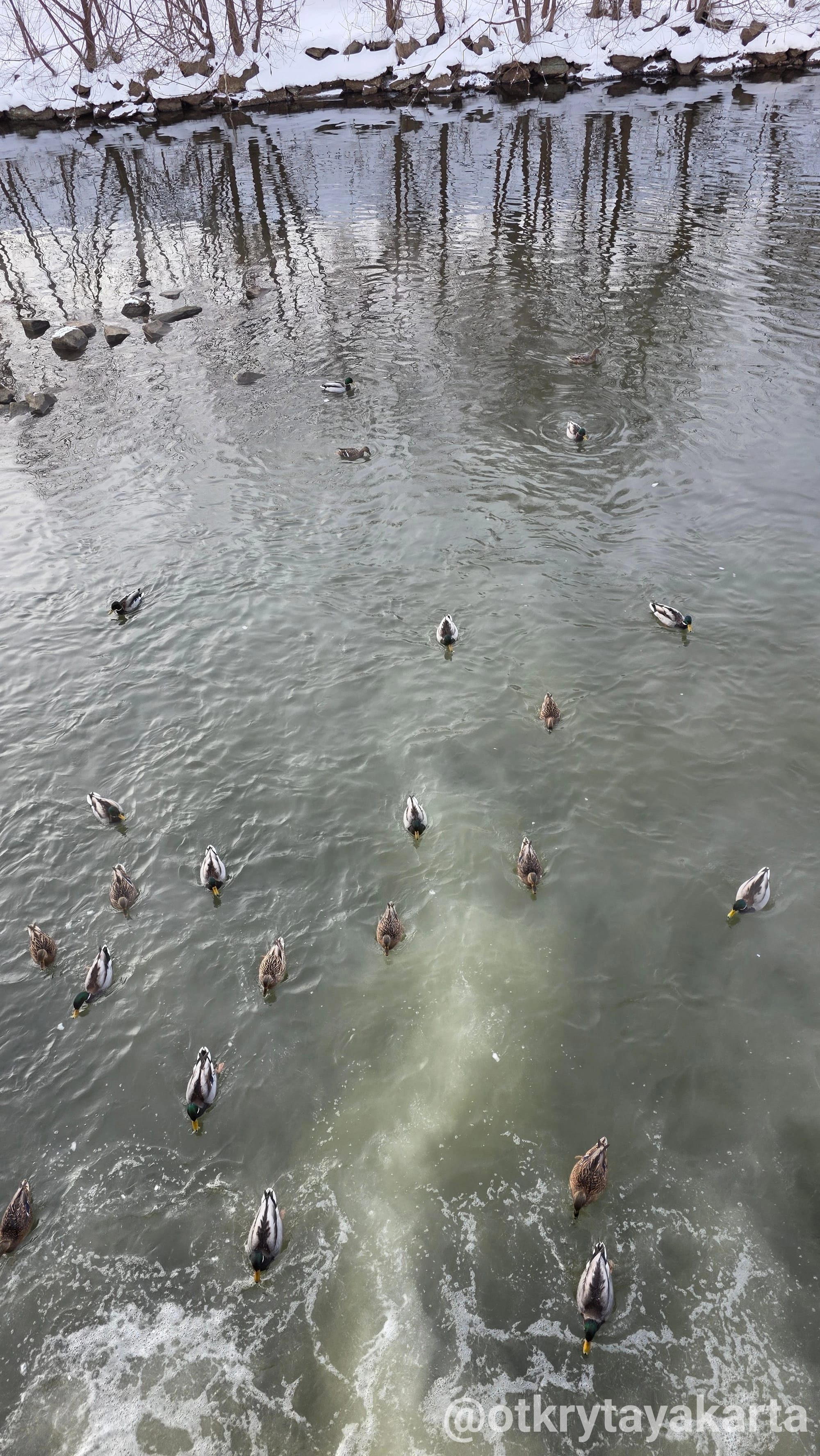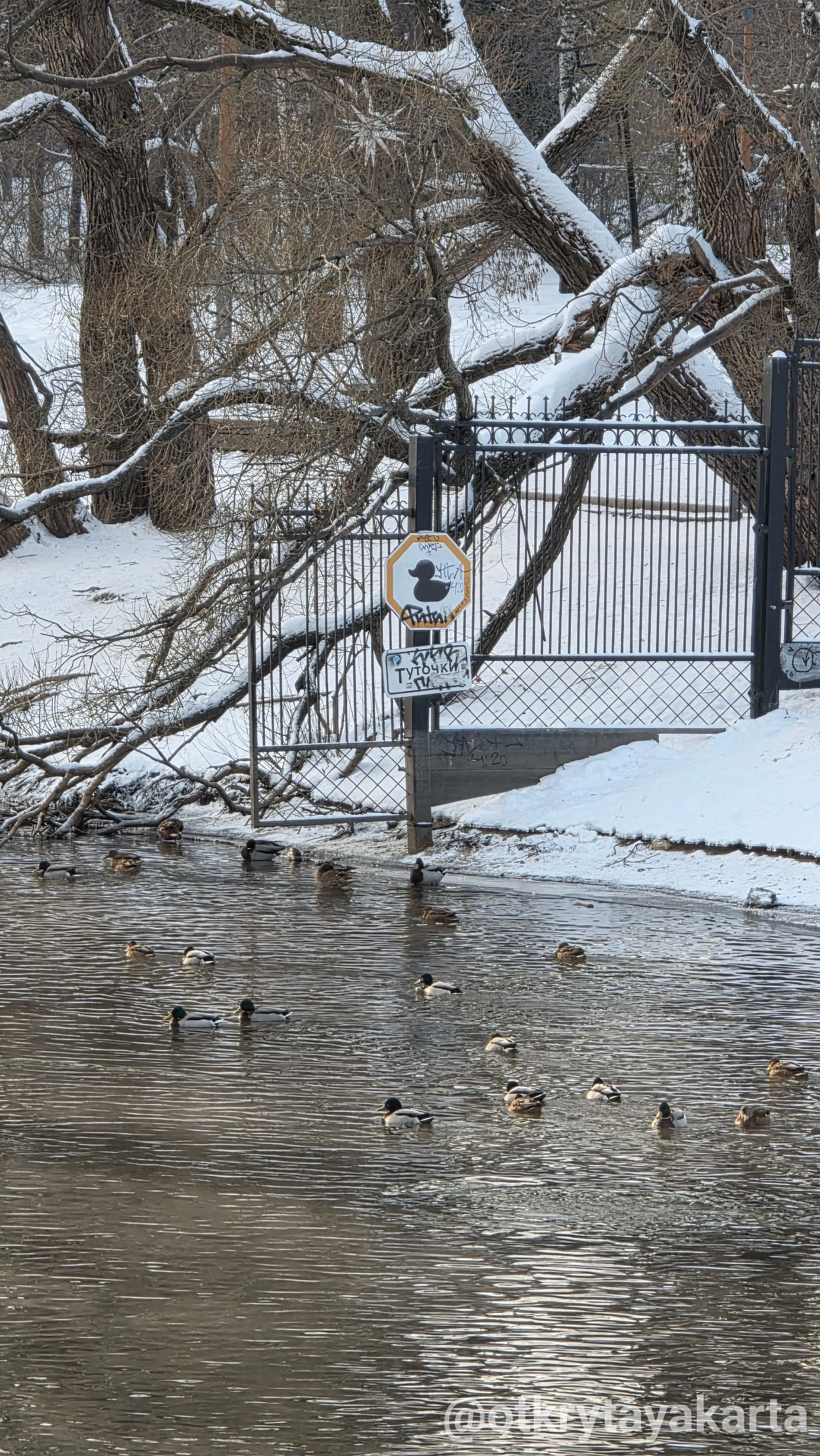 Вдоль реки есть и необычный знак "Туточки", и логово черепашек-ниндзя. А на самой реке ведут свою птичью жизнь утки. Много уток.