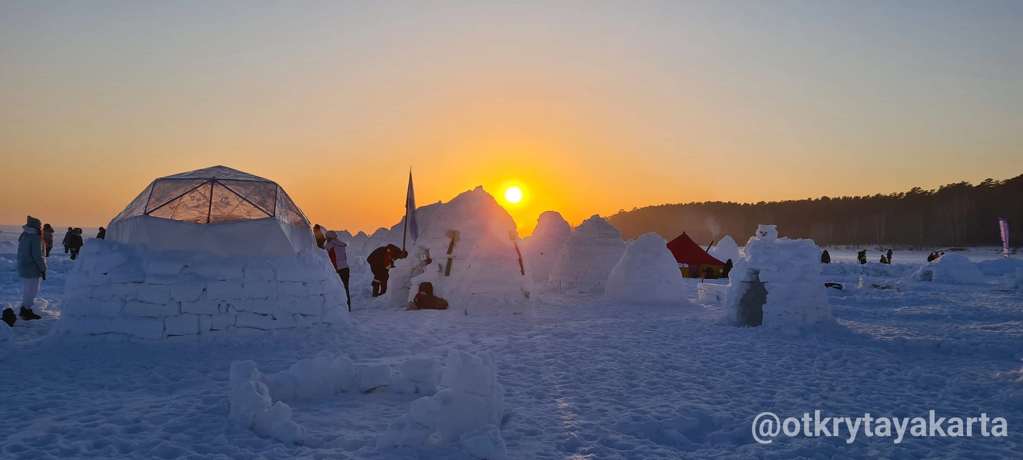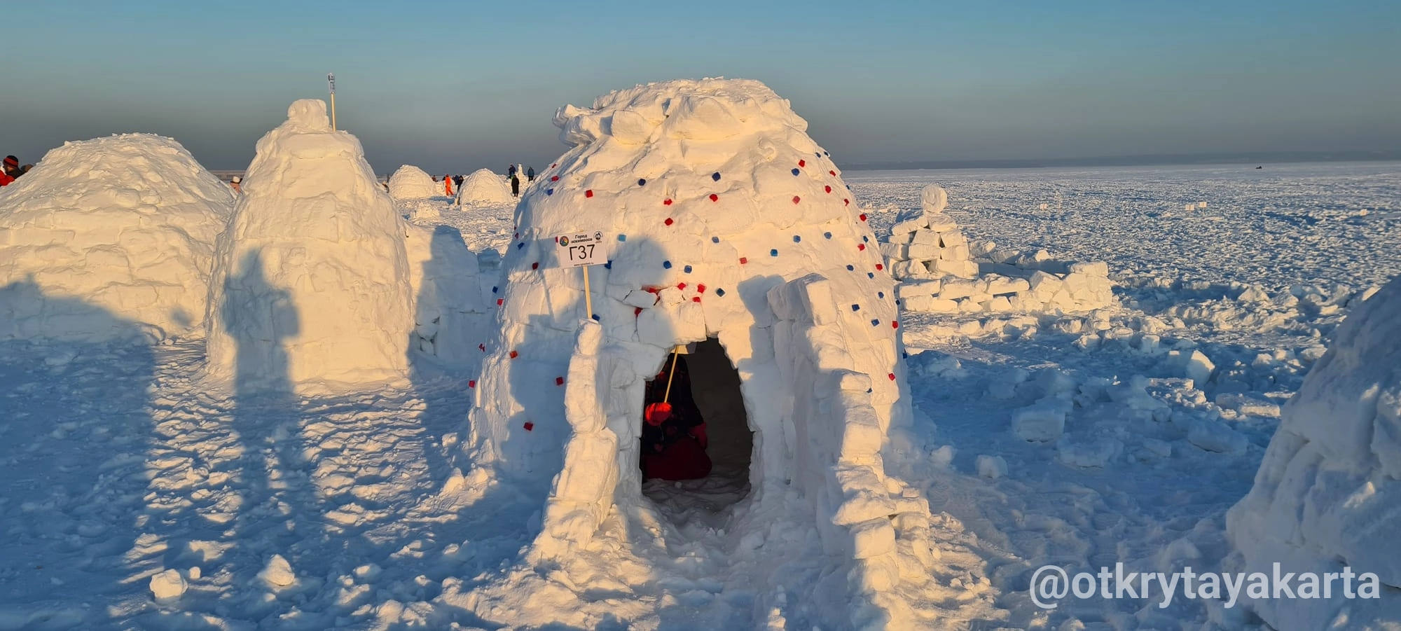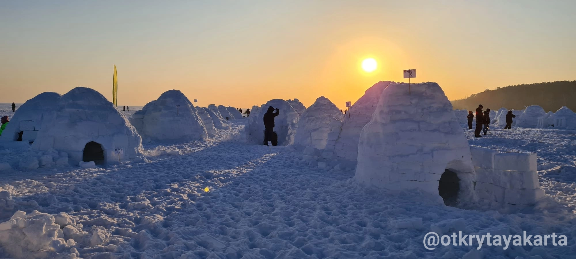 Были стол с замороженной продукцией, иглу в видео оперного театра (наверное), иглу с панорамной крышей. А в лучах заходящего солнца снежные строения выглядели особенно эффектно.
