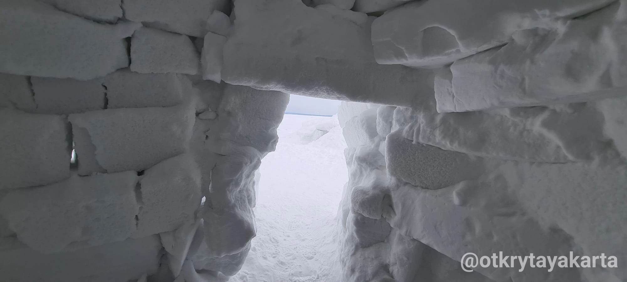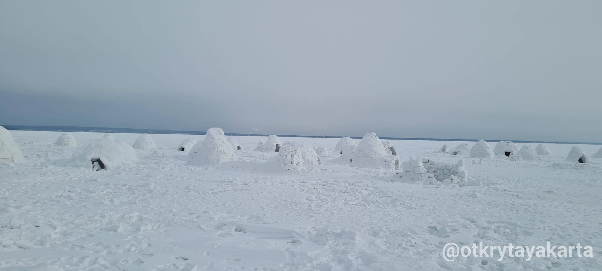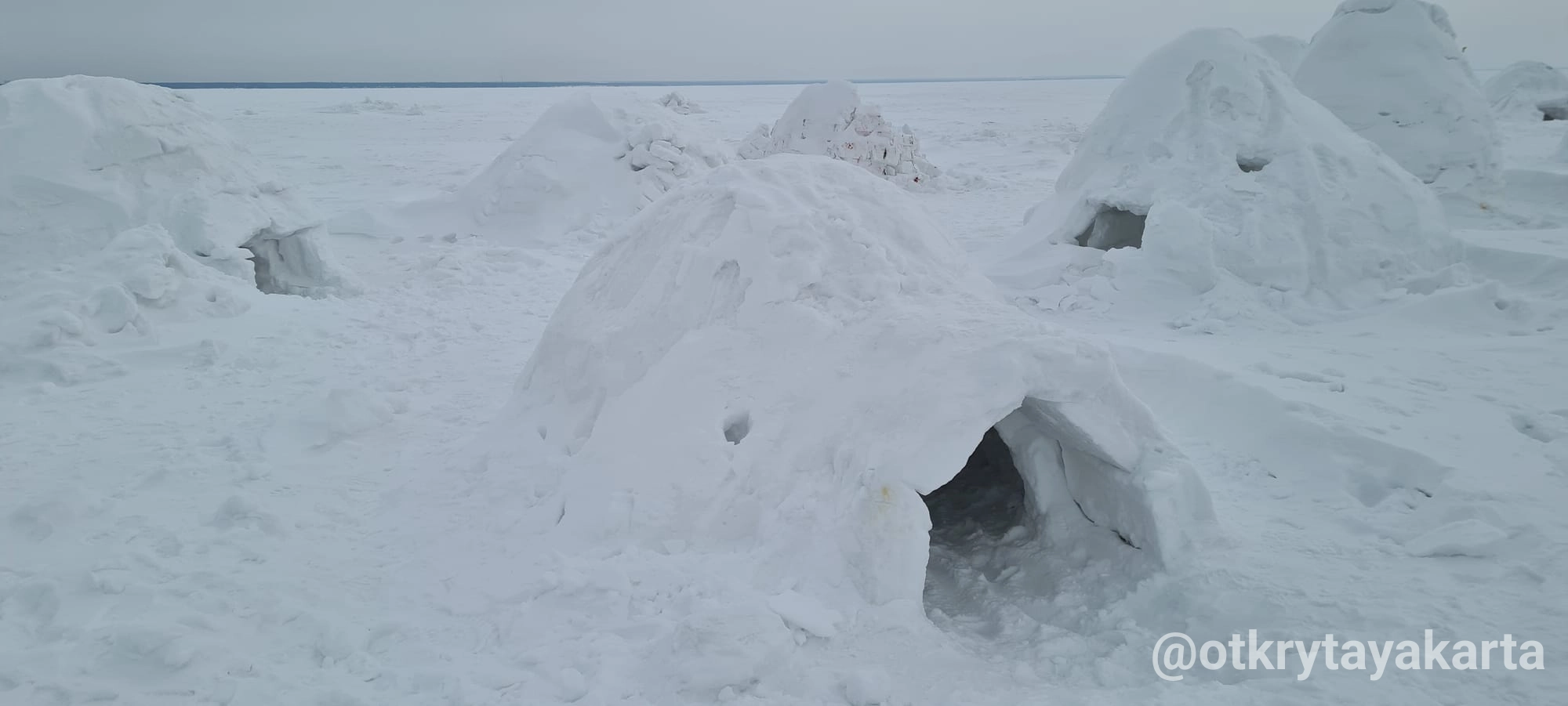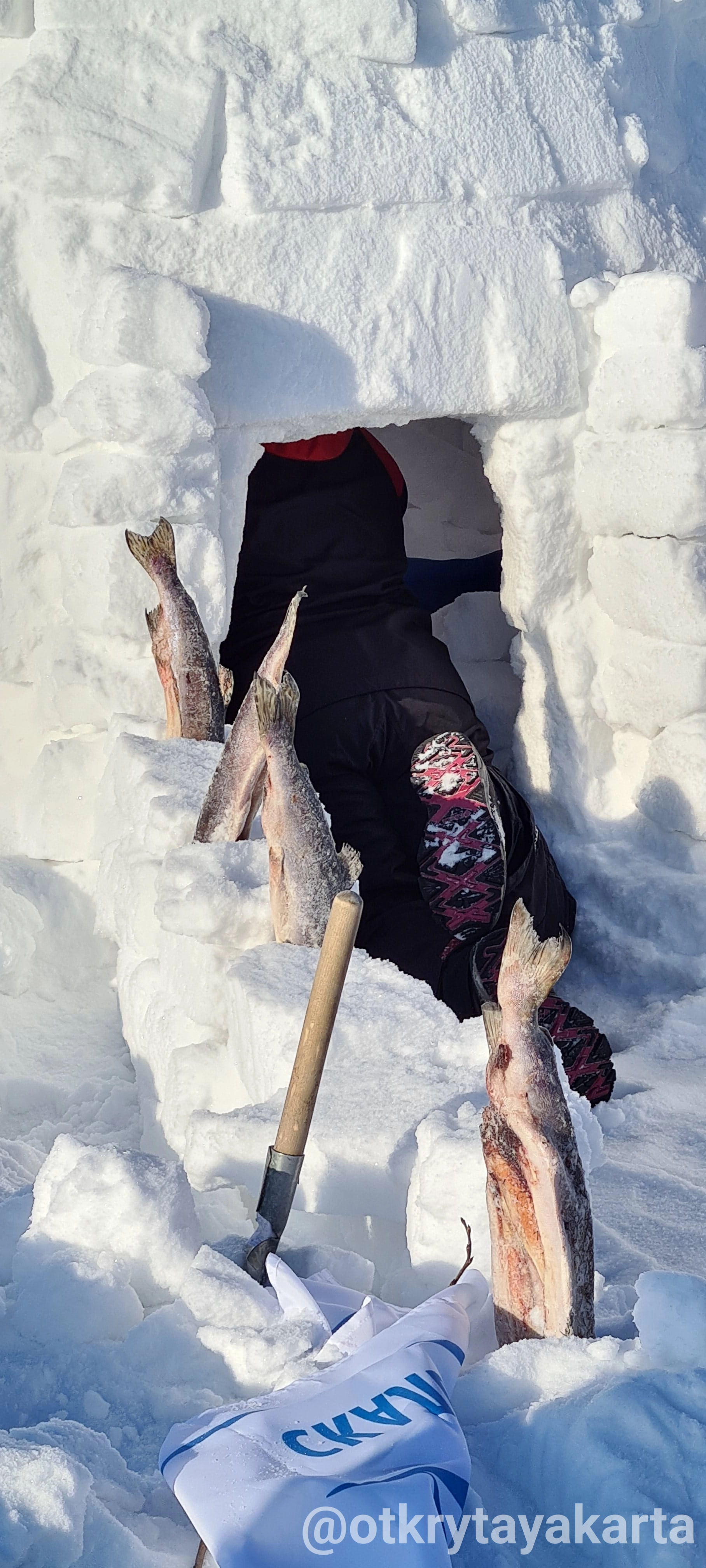Были стол с замороженной продукцией, иглу в видео оперного театра (наверное), иглу с панорамной крышей. А в лучах заходящего солнца снежные строения выглядели особенно эффектно.