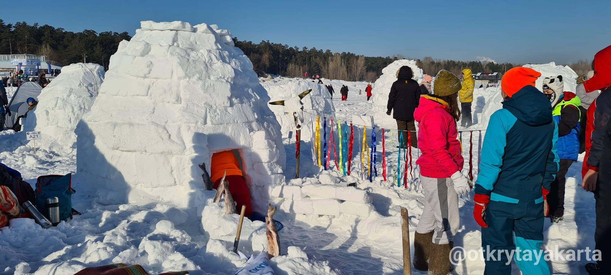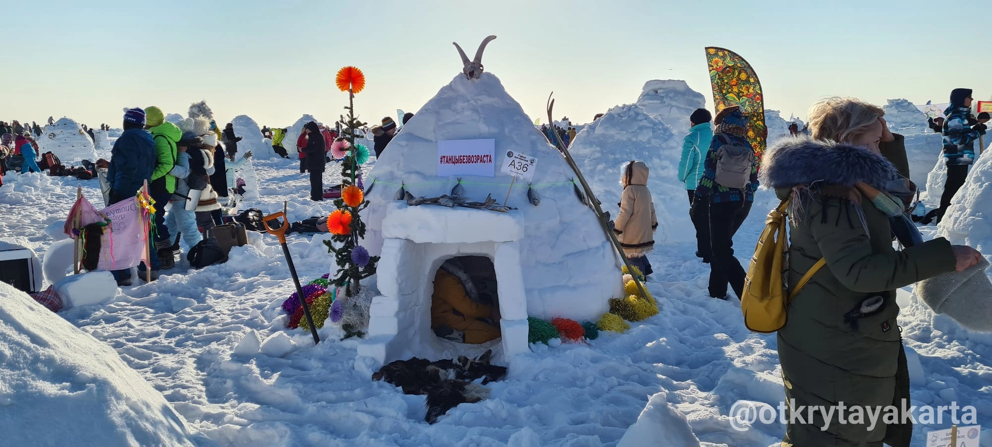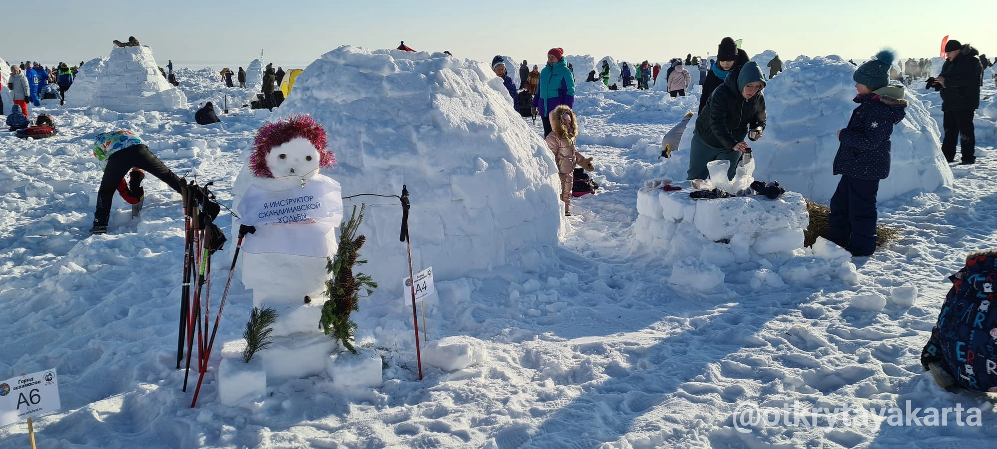 Ездовые собаки уже катали всех желающих. В украшениях иглу использовались кости и черепа животных, замороженная рыба. Сами строители в своих креативных костюмах и их питомцы северных пород так же украшали своим присутствием всё вокруг.