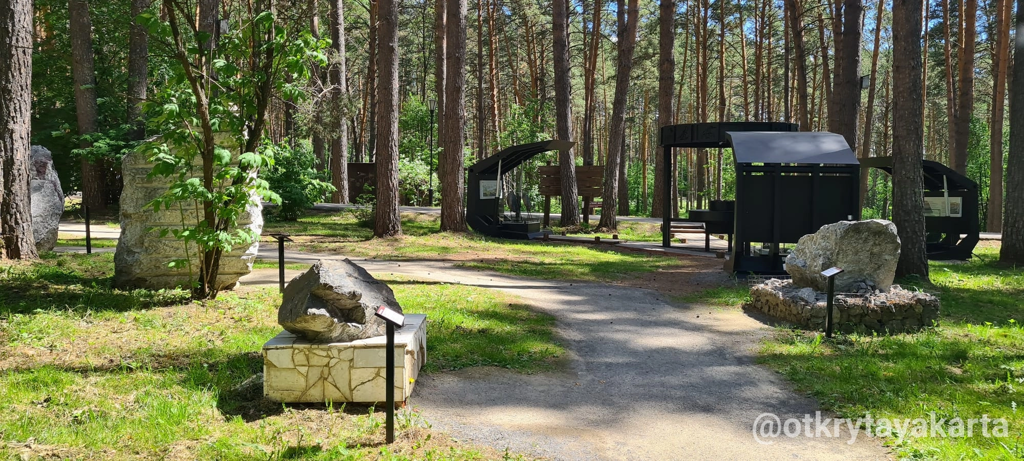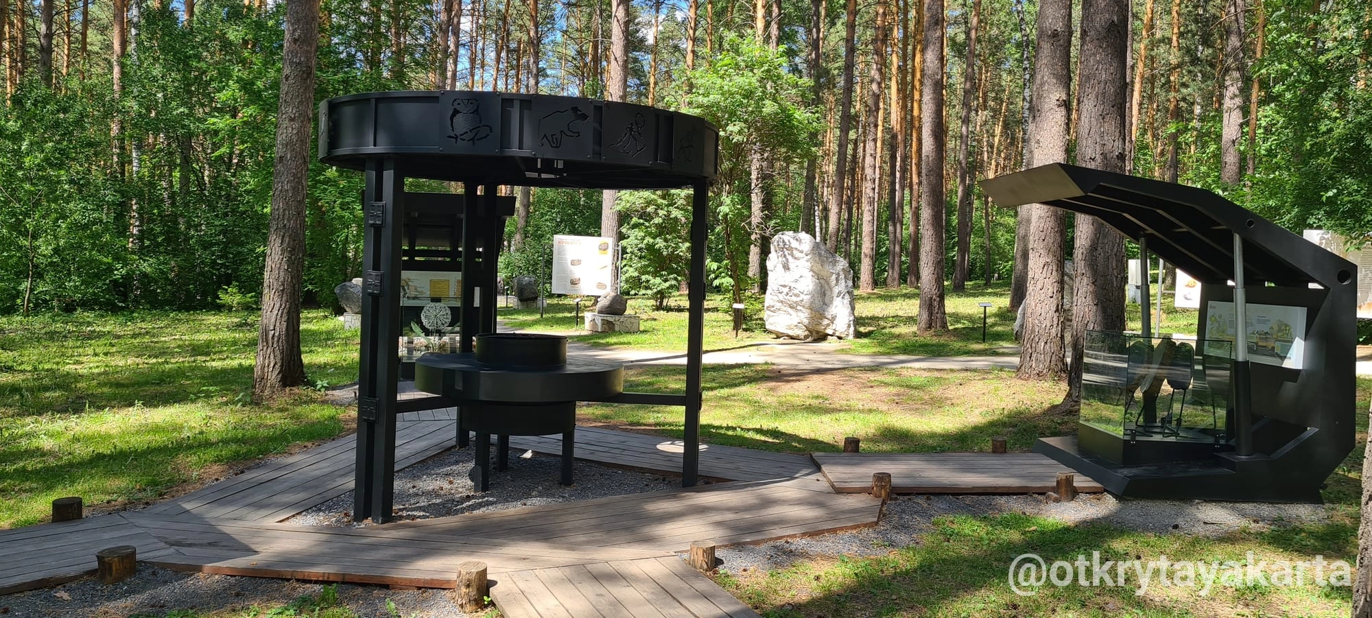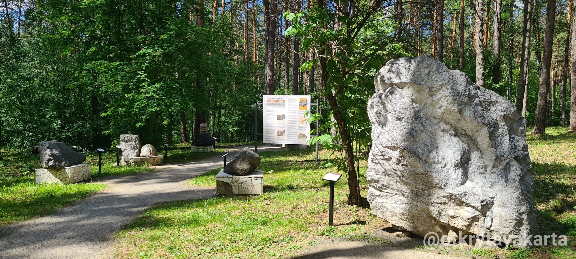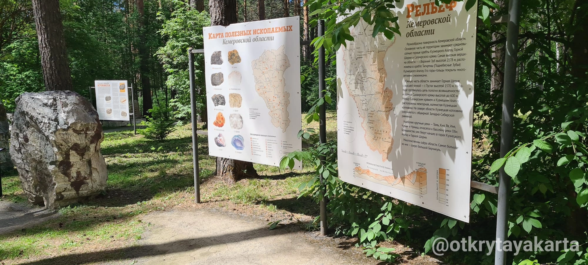 «Геология Кузбасса» — это каменный сад под открытым небом. Цветные мраморы, руды, горные породы, уголь разных марок. Прикасаешься к камню и понимаешь, какие богатства скрыты в недрах области. Рядом — скала с петроглифами, связывающая геологическую историю с человеческой.