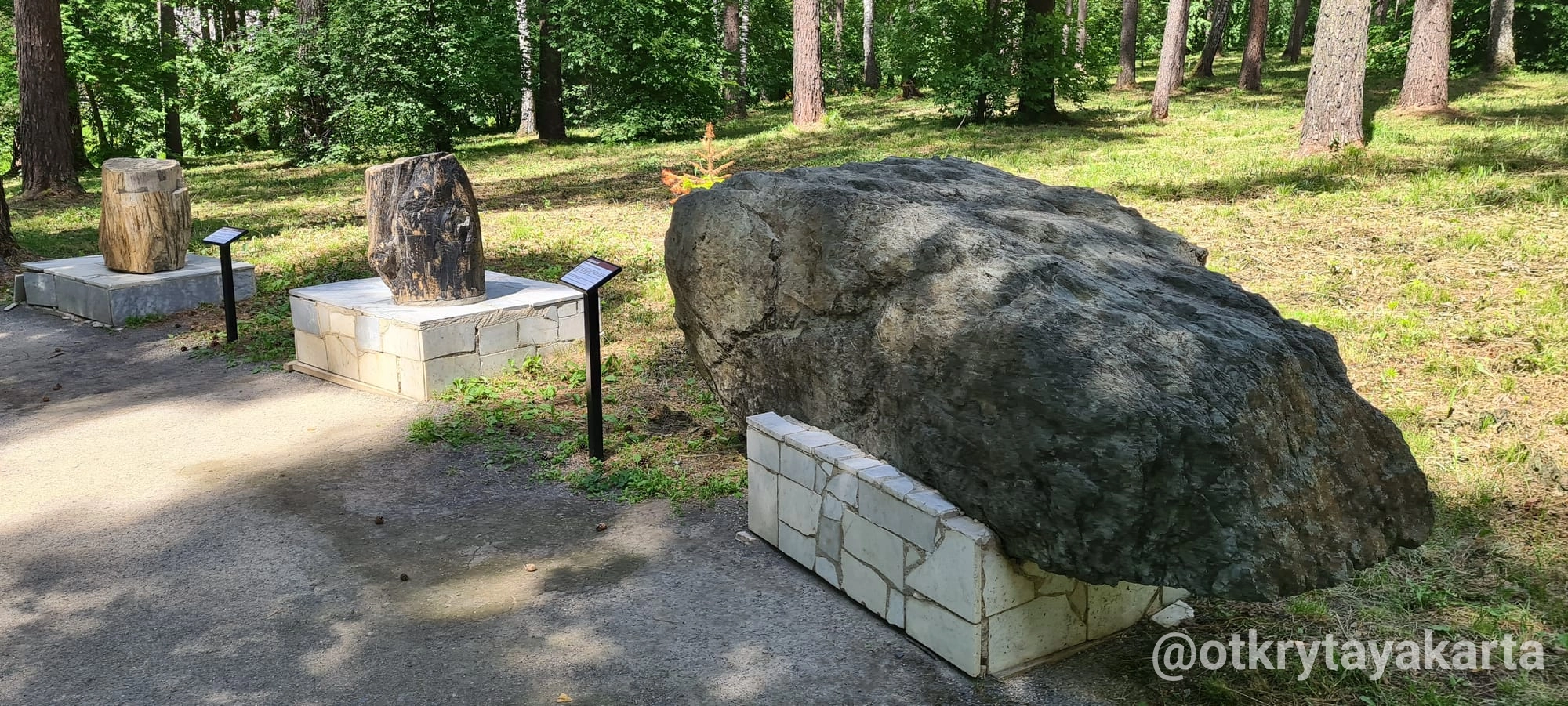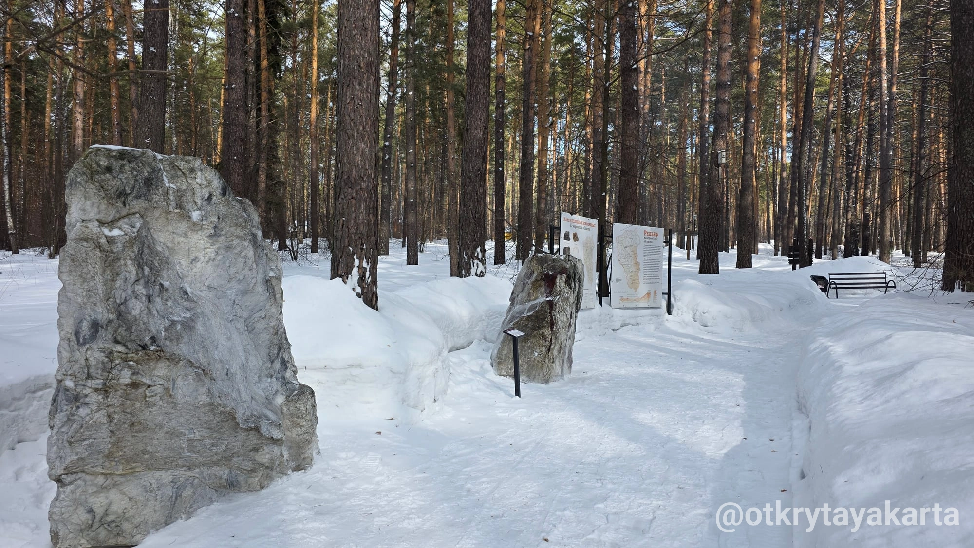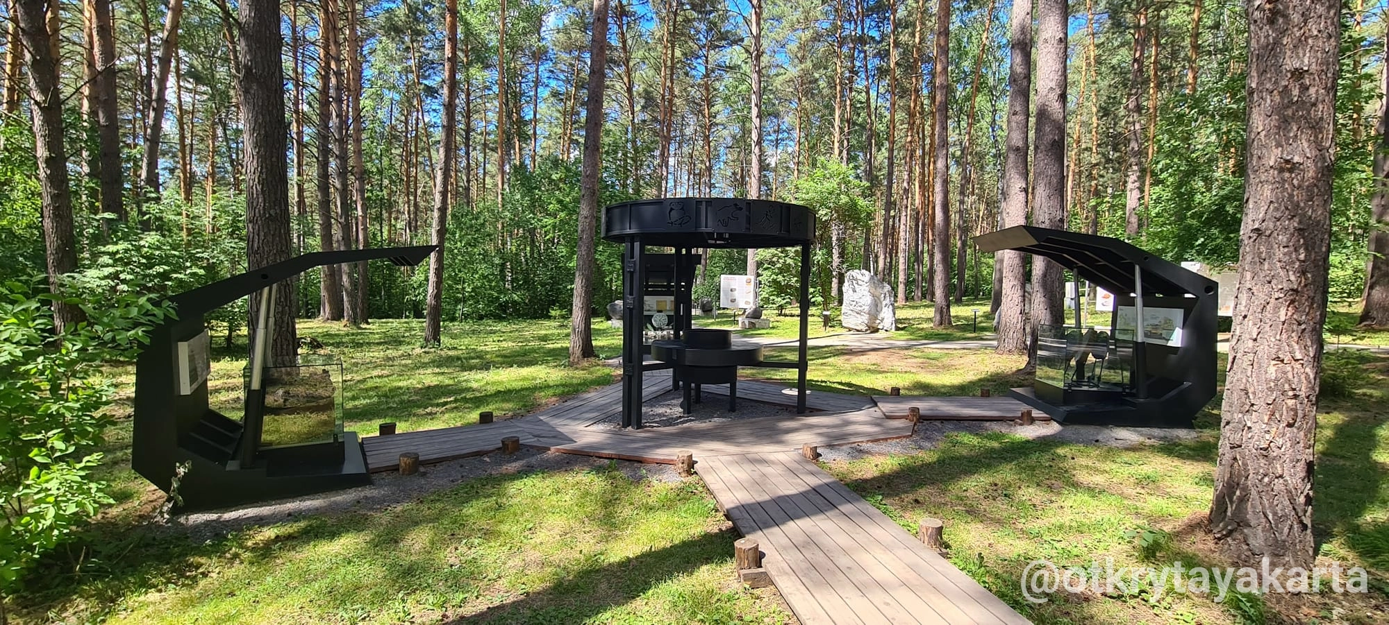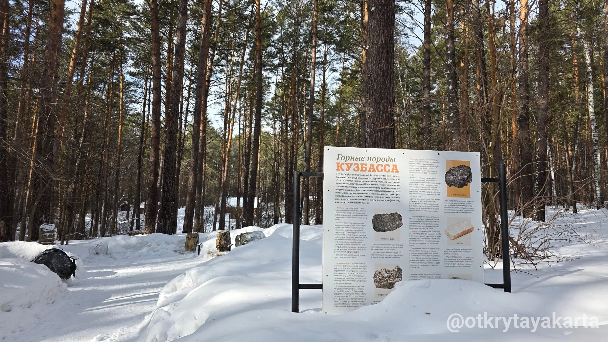 «Геология Кузбасса» — это каменный сад под открытым небом. Цветные мраморы, руды, горные породы, уголь разных марок. Прикасаешься к камню и понимаешь, какие богатства скрыты в недрах области. Рядом — скала с петроглифами, связывающая геологическую историю с человеческой.