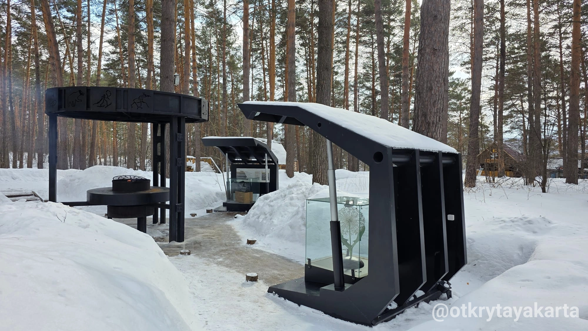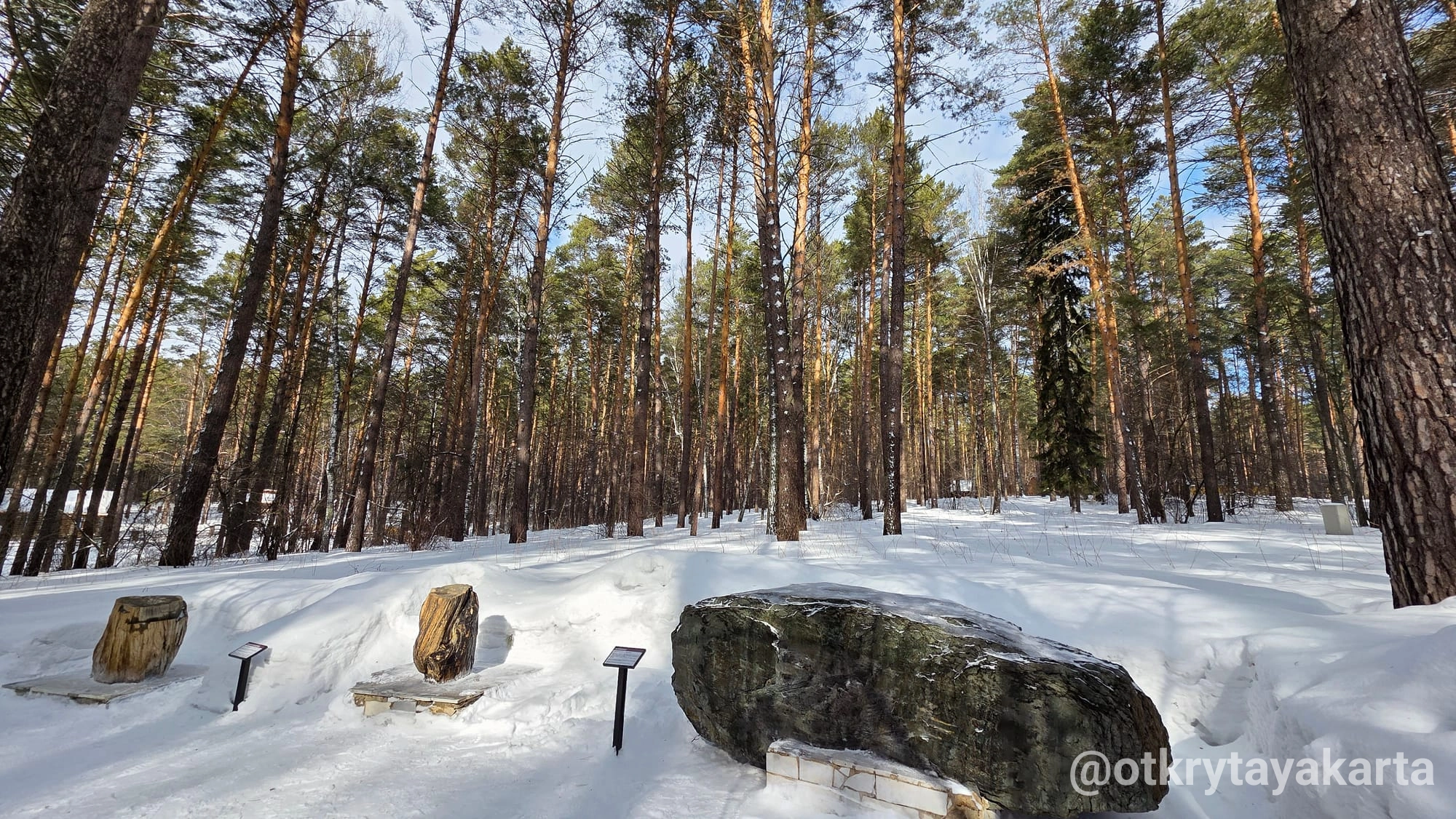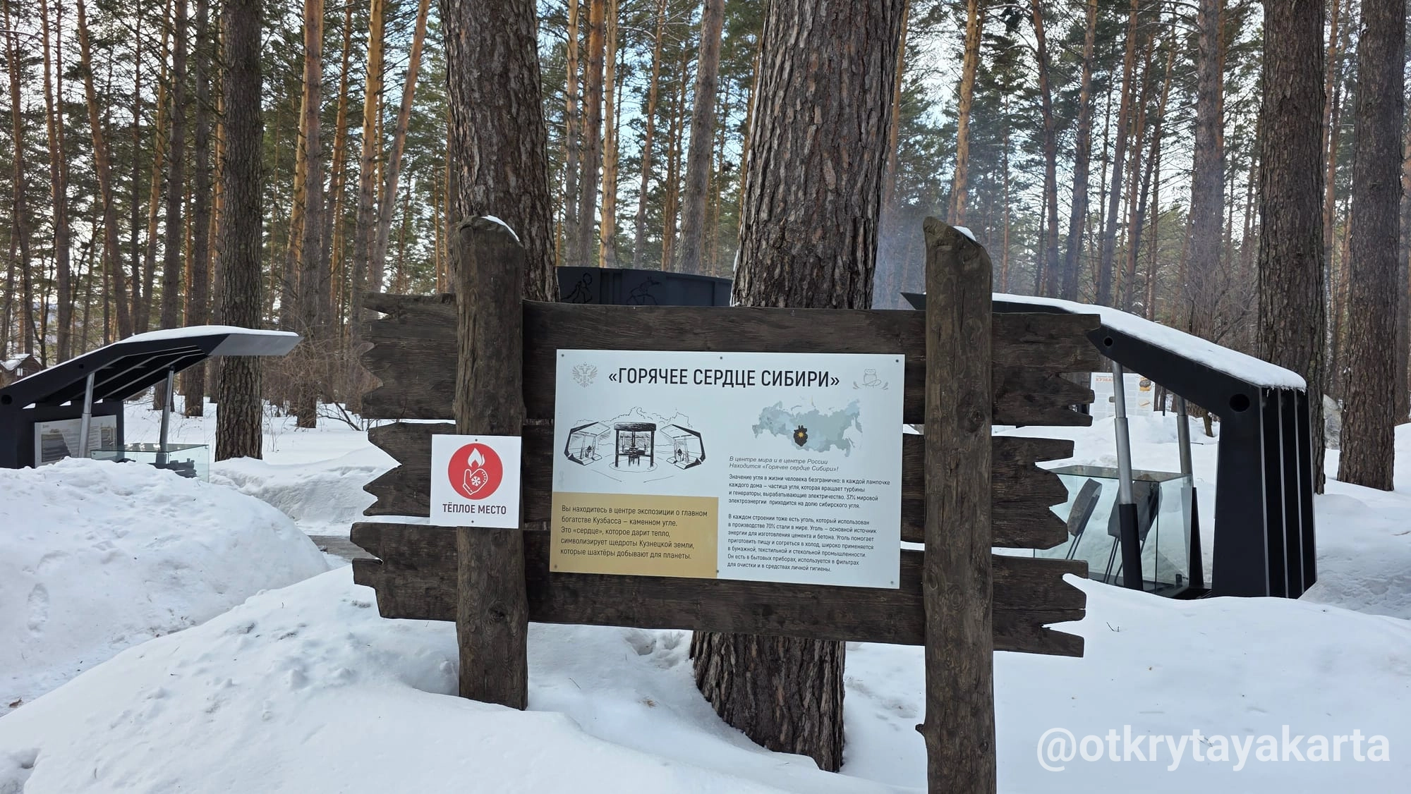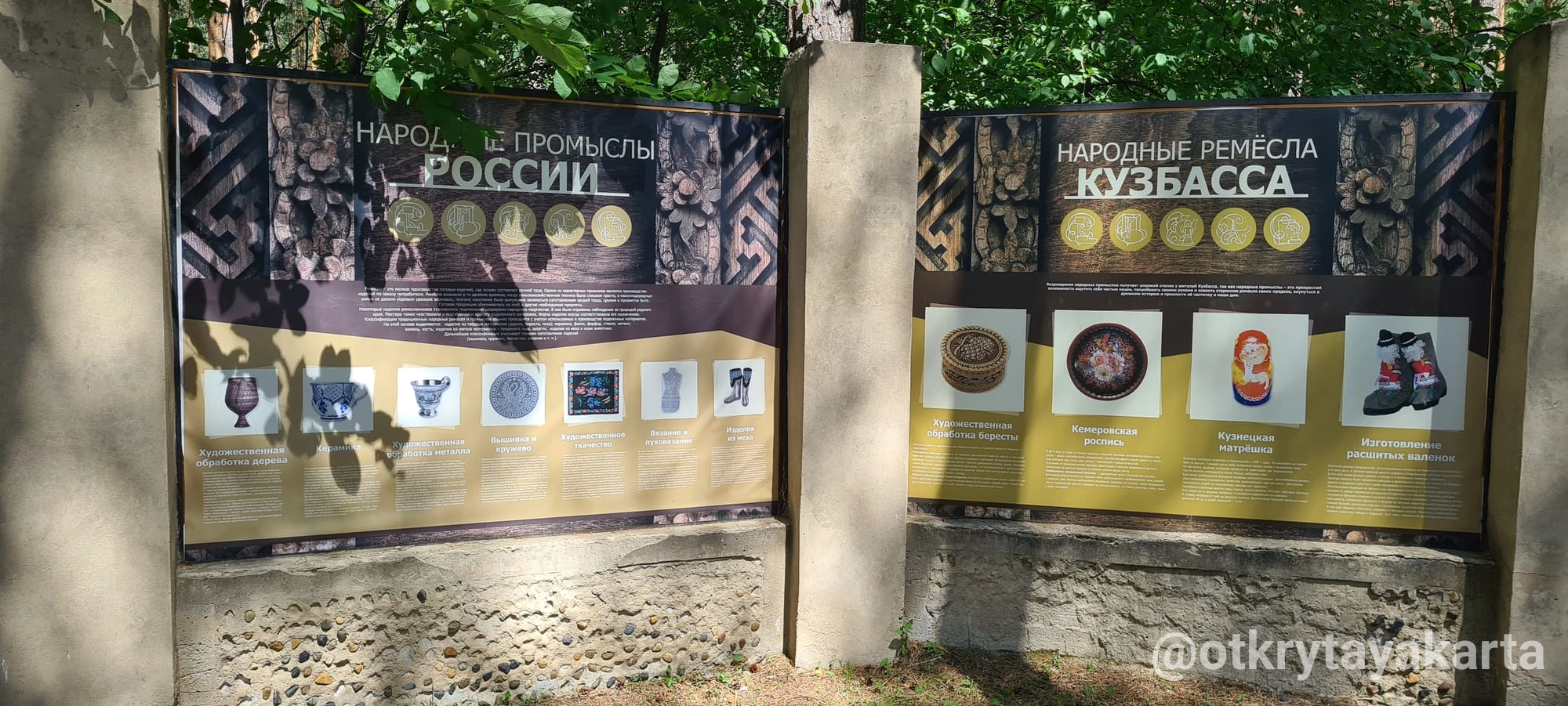 «Геология Кузбасса» — это каменный сад под открытым небом. Цветные мраморы, руды, горные породы, уголь разных марок. Прикасаешься к камню и понимаешь, какие богатства скрыты в недрах области. Рядом — скала с петроглифами, связывающая геологическую историю с человеческой.