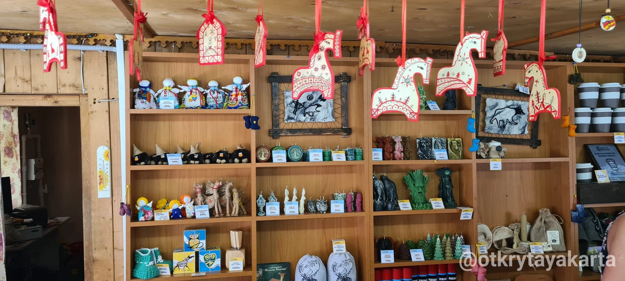 На центральной аллее работает сувенирная лавка с более чем 100 уникальными изделиями. Стильная одежда и аксессуары, декор и украшения, предметы для дома, творческие наборы и подарочные комплекты — в каждом сувенире частичка сибирской культуры. Особую ценность представляют работы местных мастеров, например, свечи Елены Муравьевой.