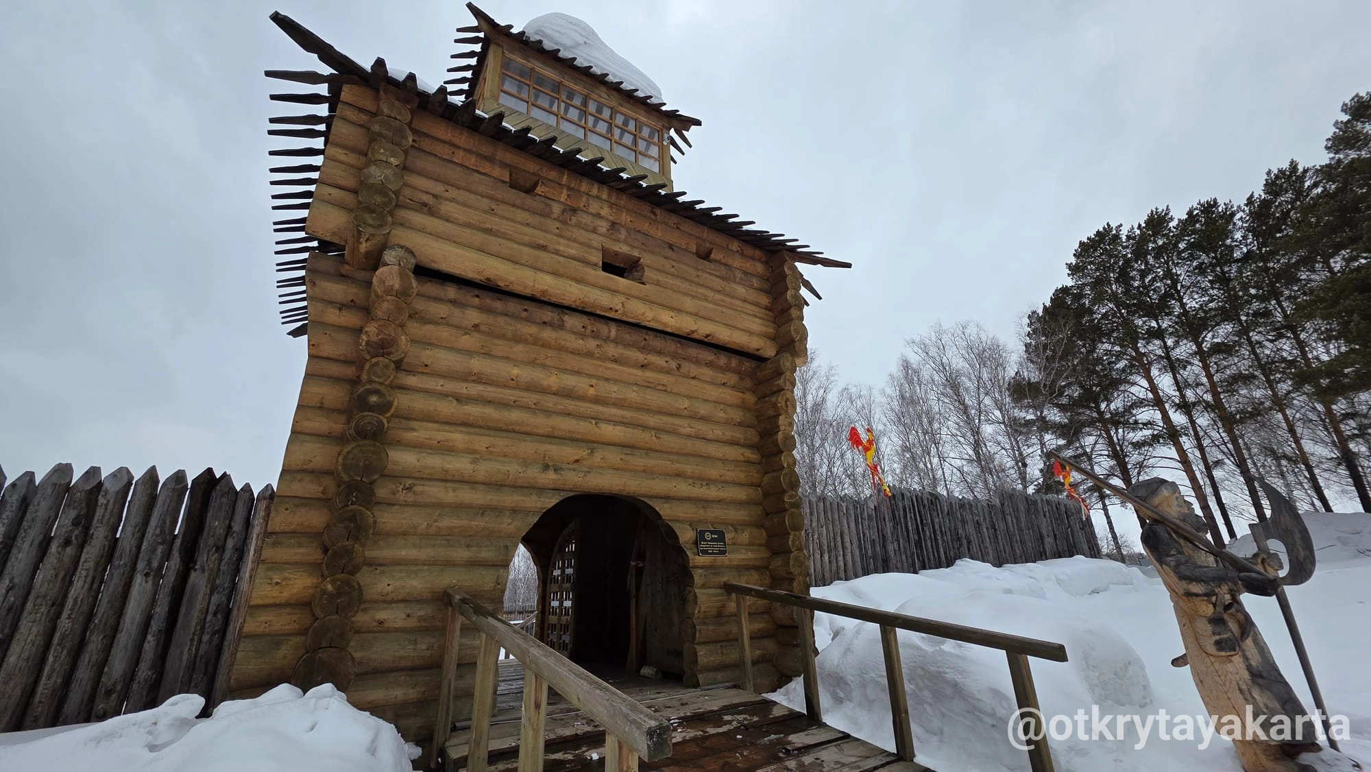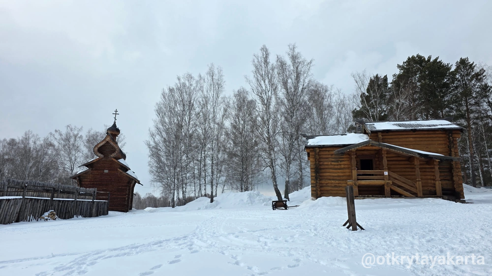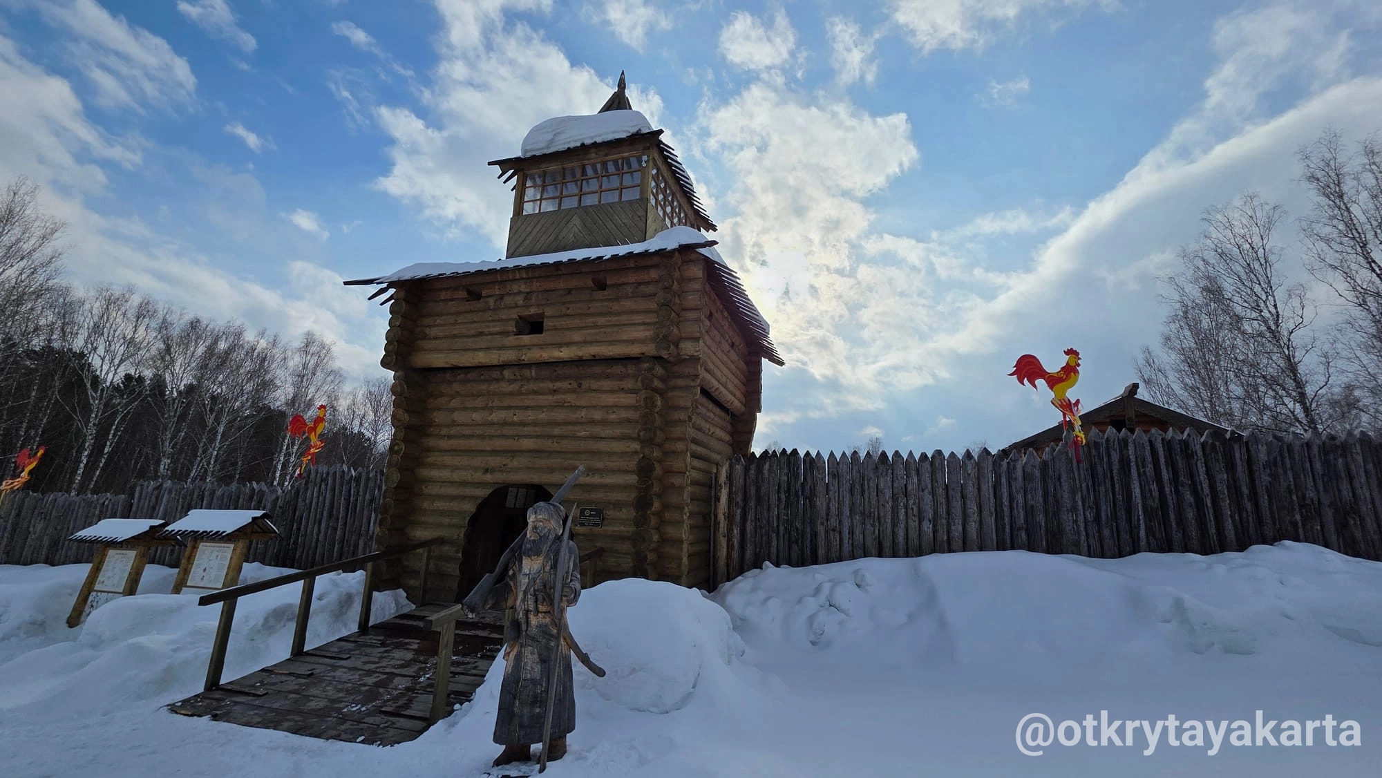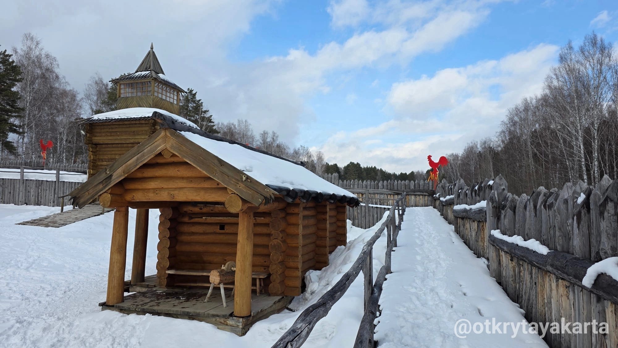 «Сибирский острог» — собирательный образ форпостов, которые ставили служилые люди, продвигаясь вглубь Сибири. Проездная башня, угловая башня, тыновая ограда, изба приказчика. Заходишь внутрь — и будто переносишься во времена первых воевод.
