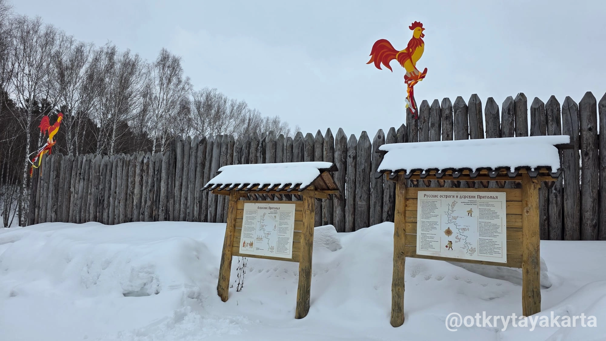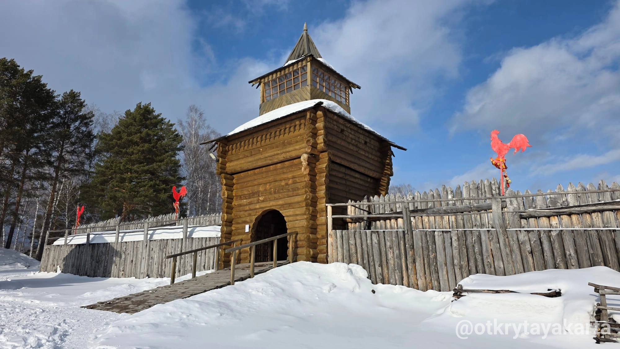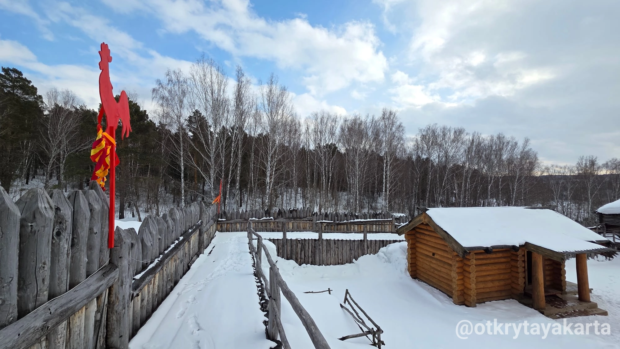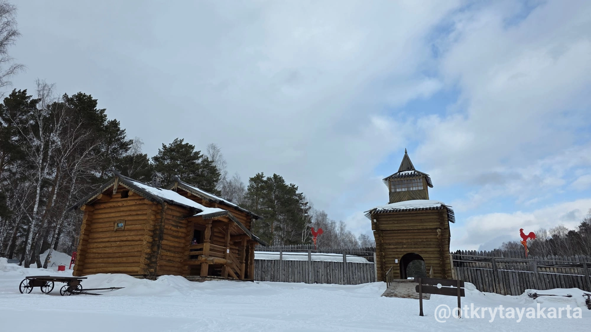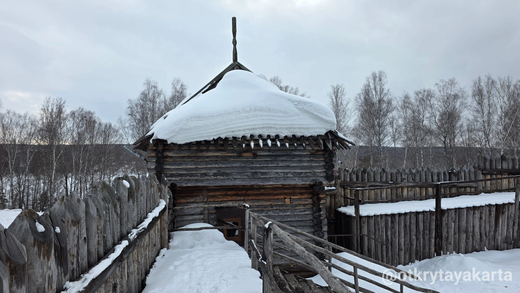 «Сибирский острог» — собирательный образ форпостов, которые ставили служилые люди, продвигаясь вглубь Сибири. Проездная башня, угловая башня, тыновая ограда, изба приказчика. Заходишь внутрь — и будто переносишься во времена первых воевод.