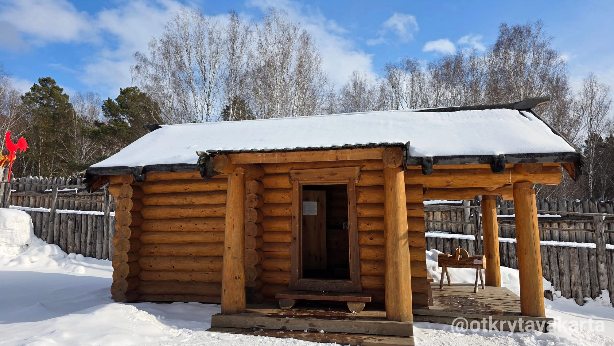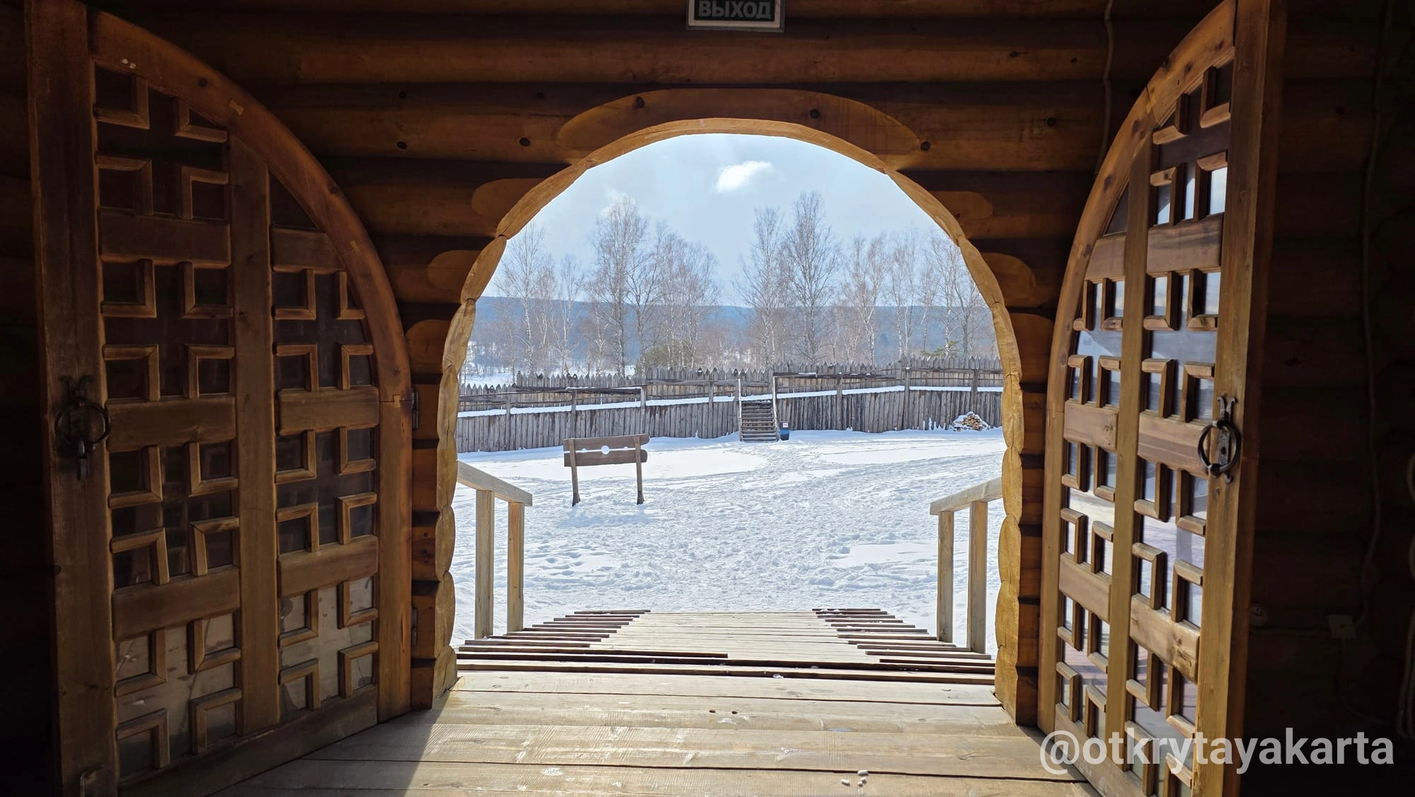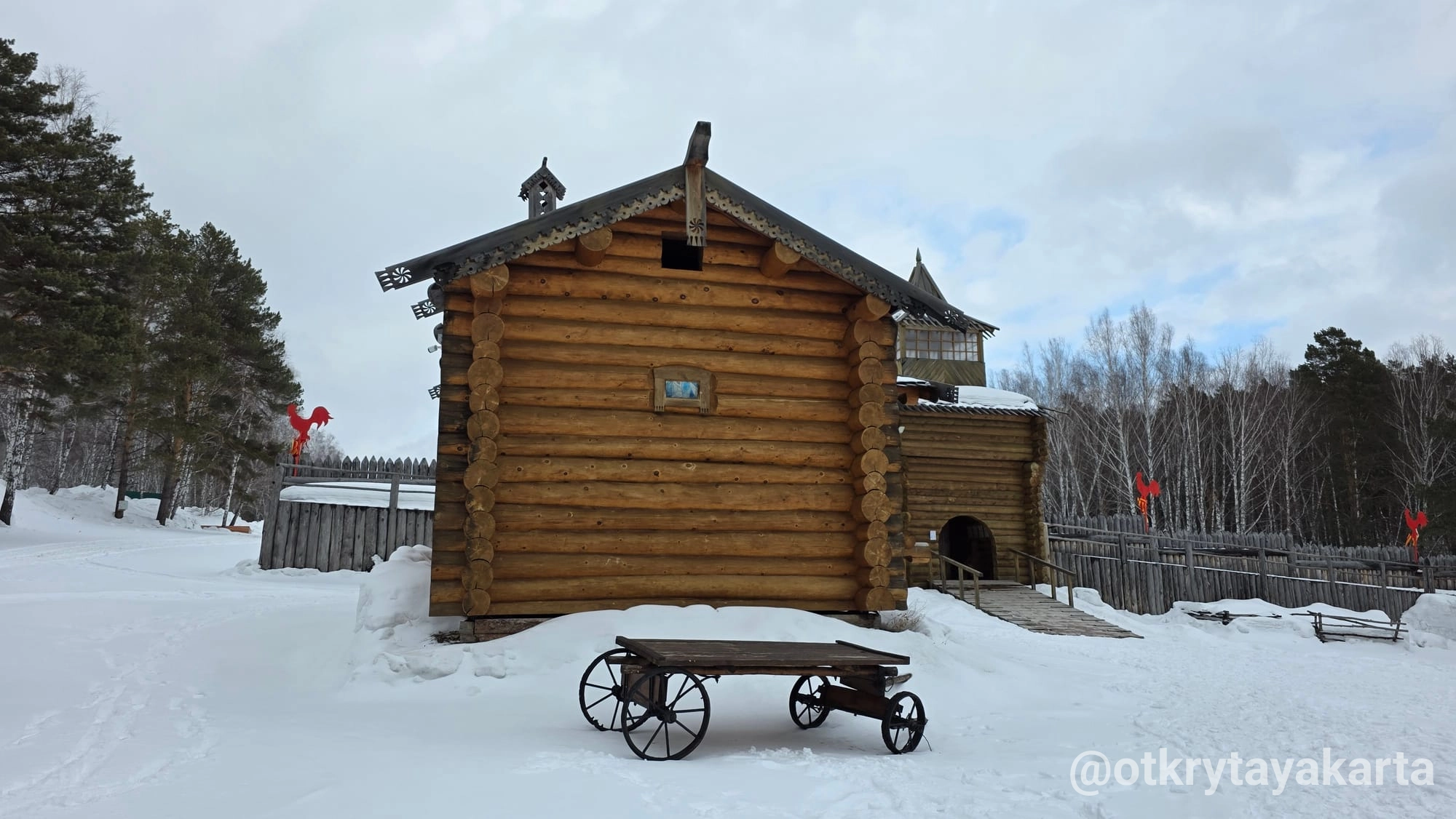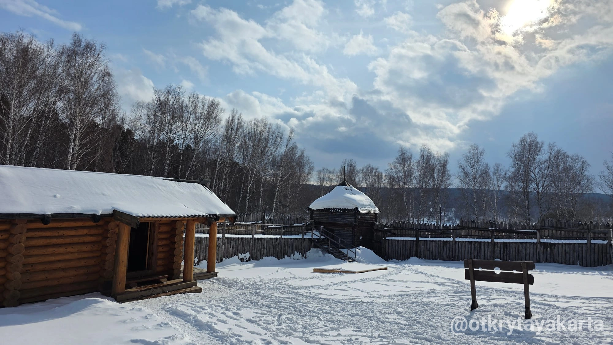 «Сибирский острог» — собирательный образ форпостов, которые ставили служилые люди, продвигаясь вглубь Сибири. Проездная башня, угловая башня, тыновая ограда, изба приказчика. Заходишь внутрь — и будто переносишься во времена первых воевод.
