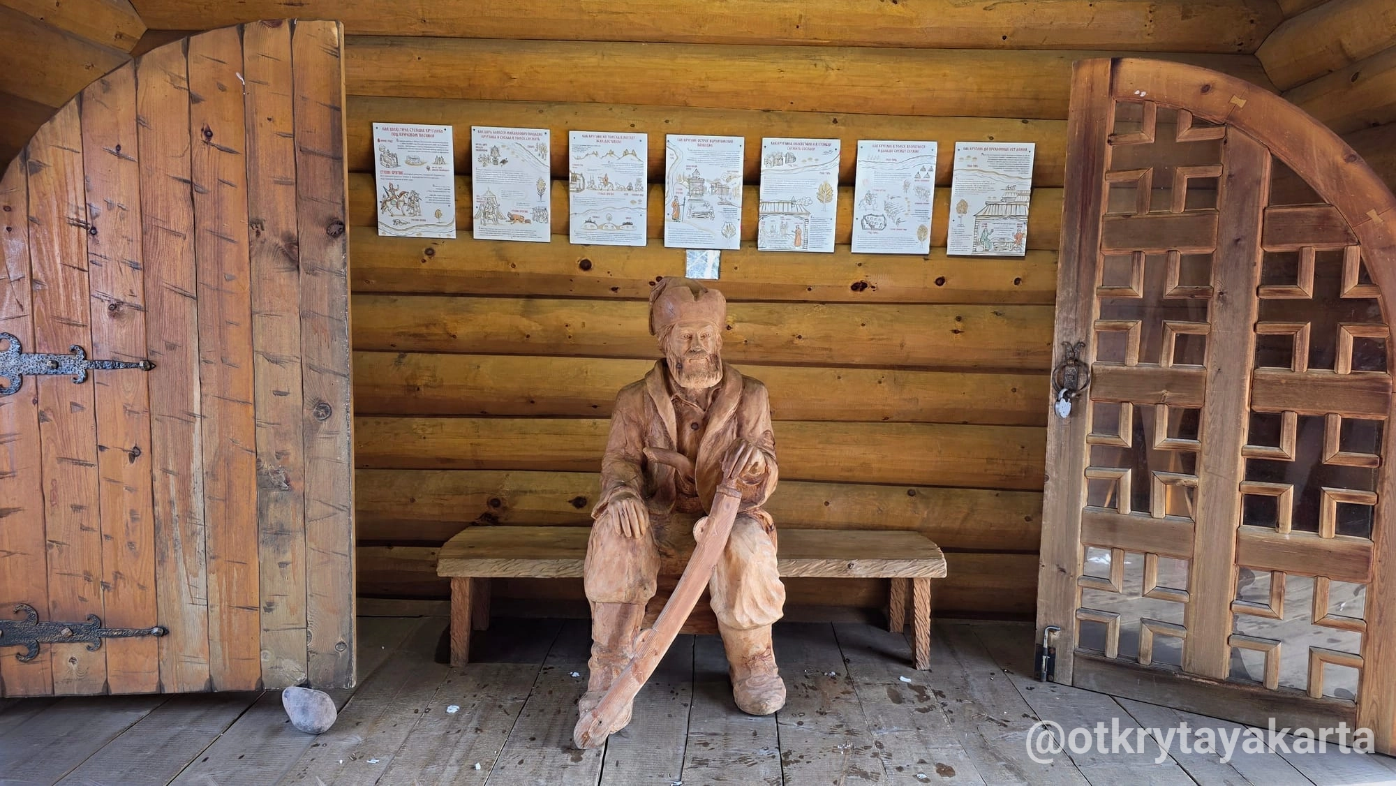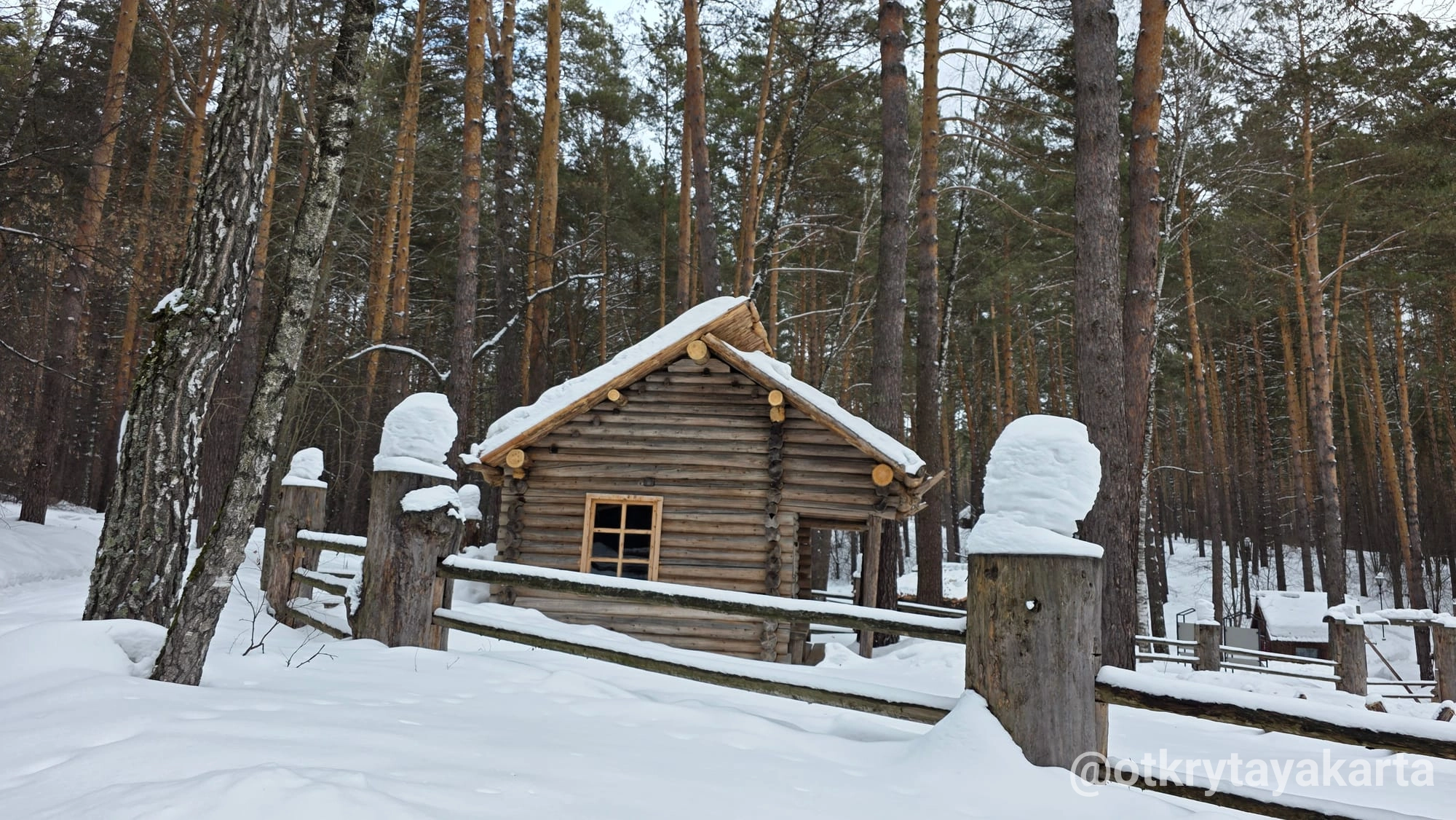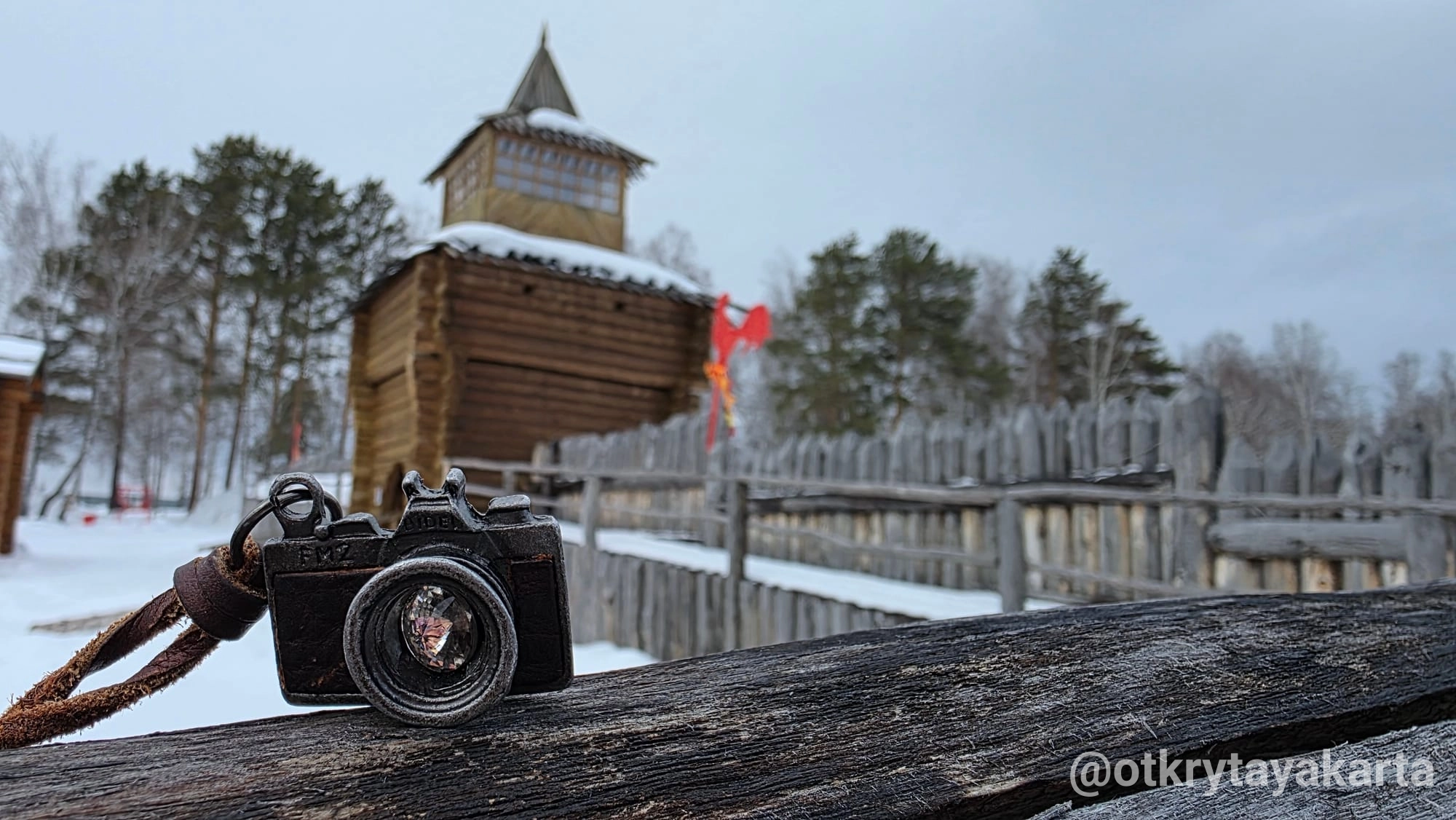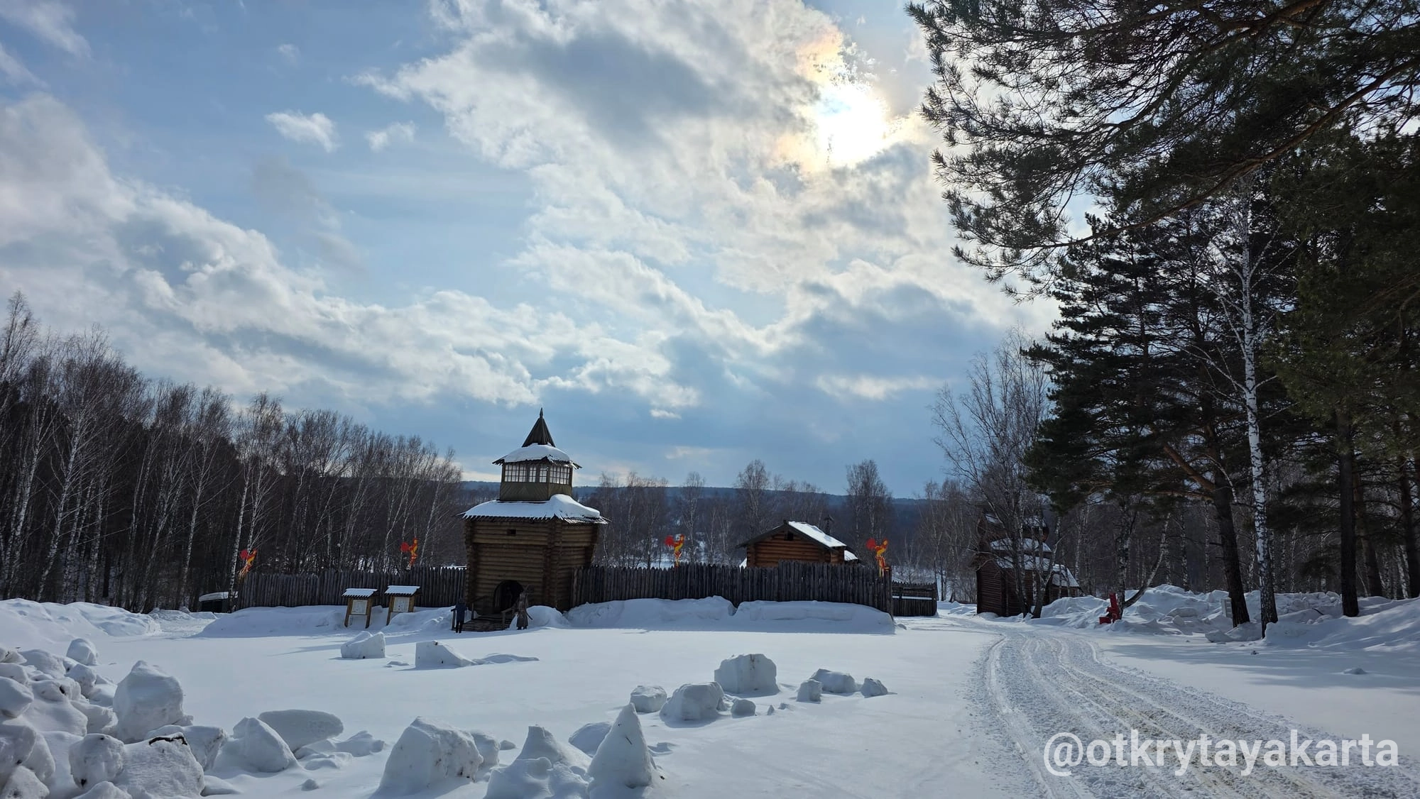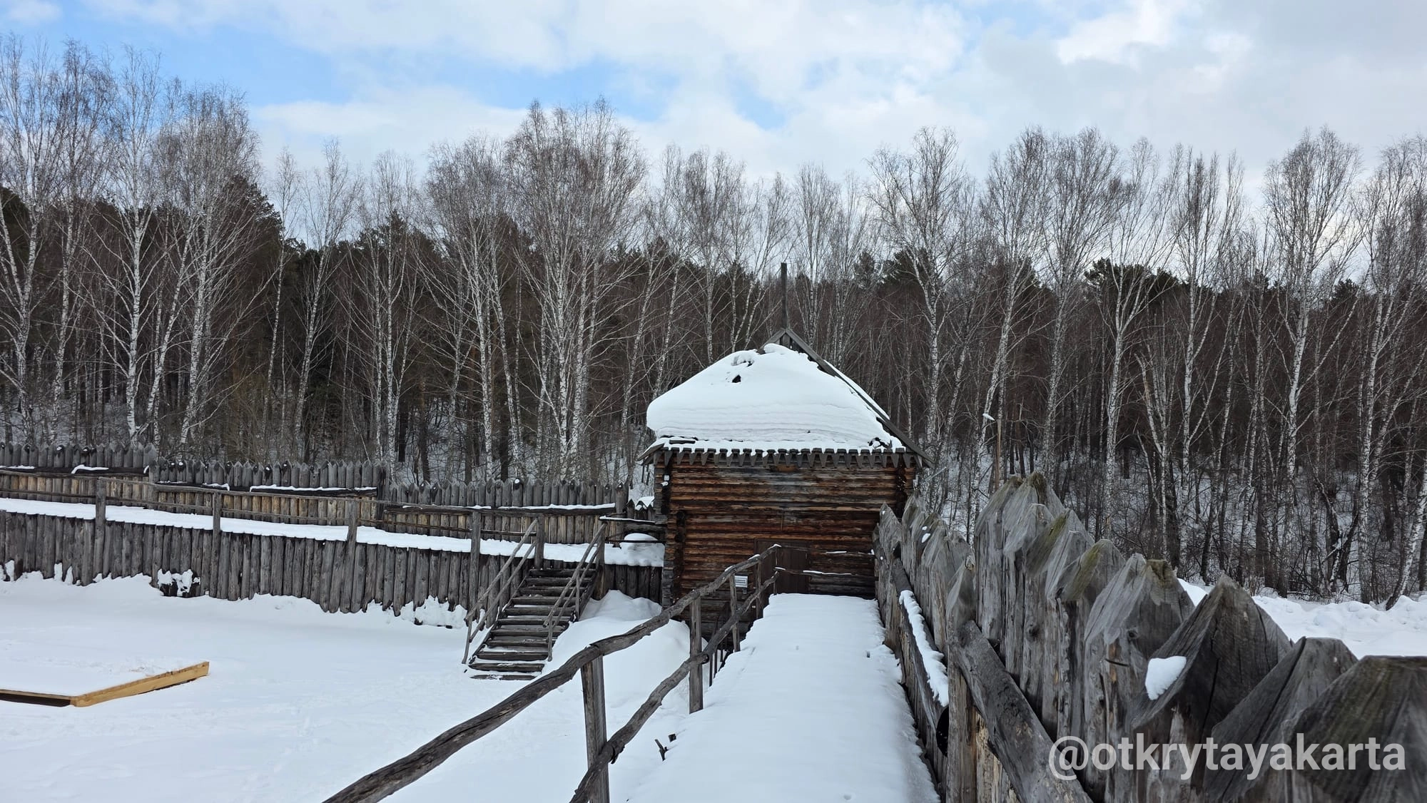«Сибирский острог» — собирательный образ форпостов, которые ставили служилые люди, продвигаясь вглубь Сибири. Проездная башня, угловая башня, тыновая ограда, изба приказчика. Заходишь внутрь — и будто переносишься во времена первых воевод.