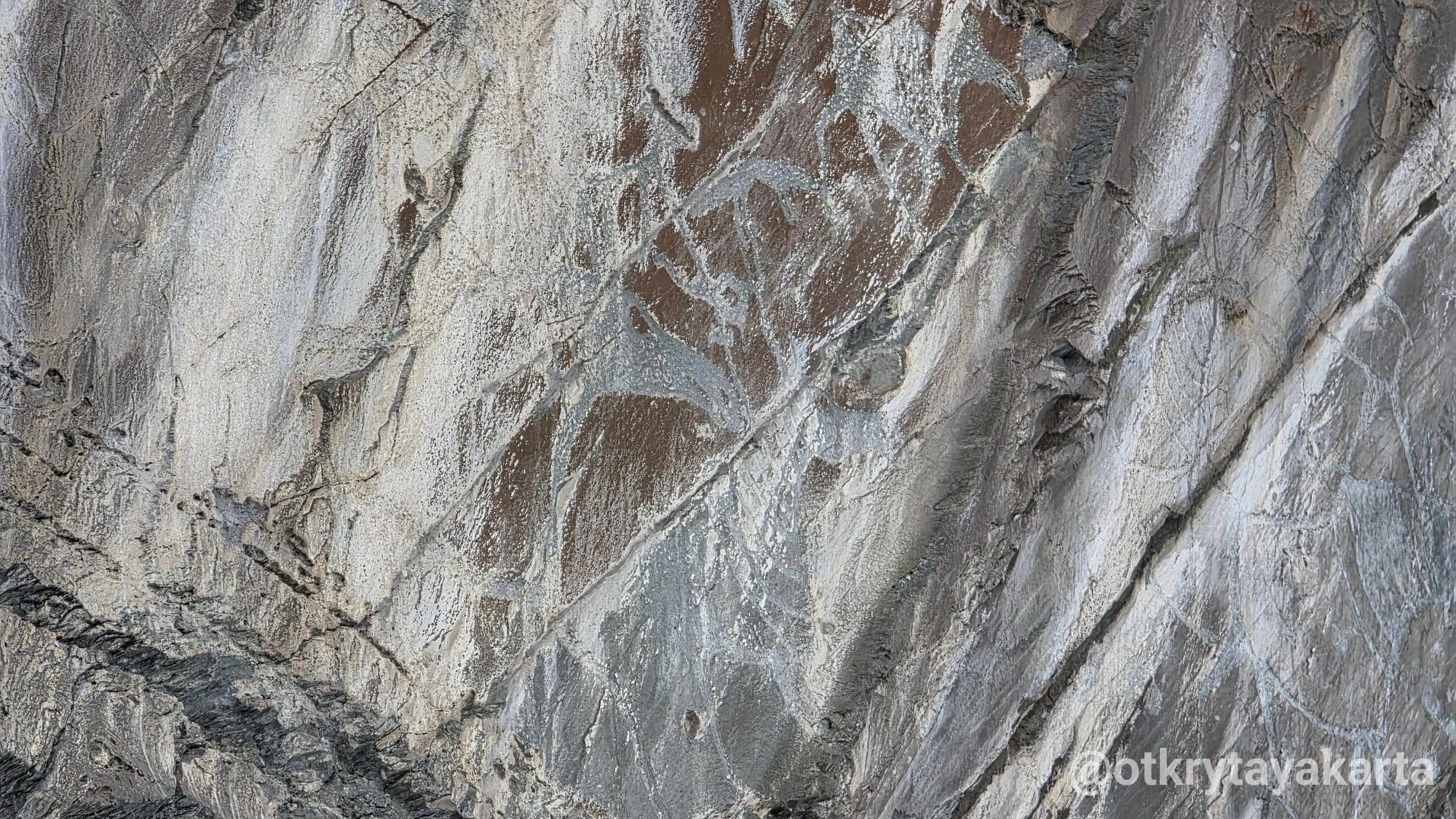На скальном массиве сохранилось около 300 изображений. Они разные: одни выбиты грубым контуром, другие прочерчены тончайшими линиями, третьи когда-то были покрыты охрой. Исследователи до сих пор спорят о значении многих символов. Меня же заинтересовало, как вообще древние люди могли держаться на этой отвесной скале и тем более делать петроглифы.