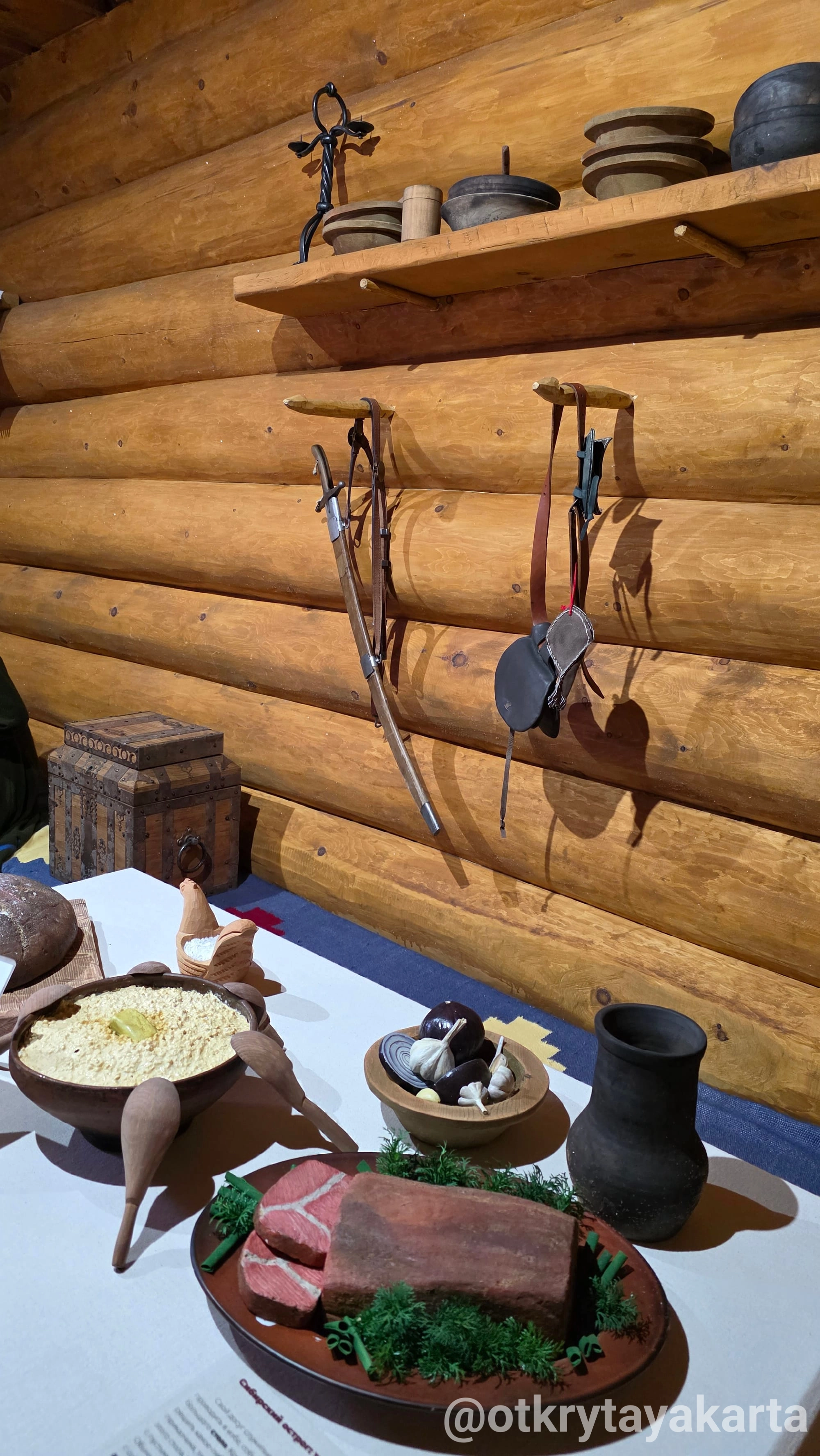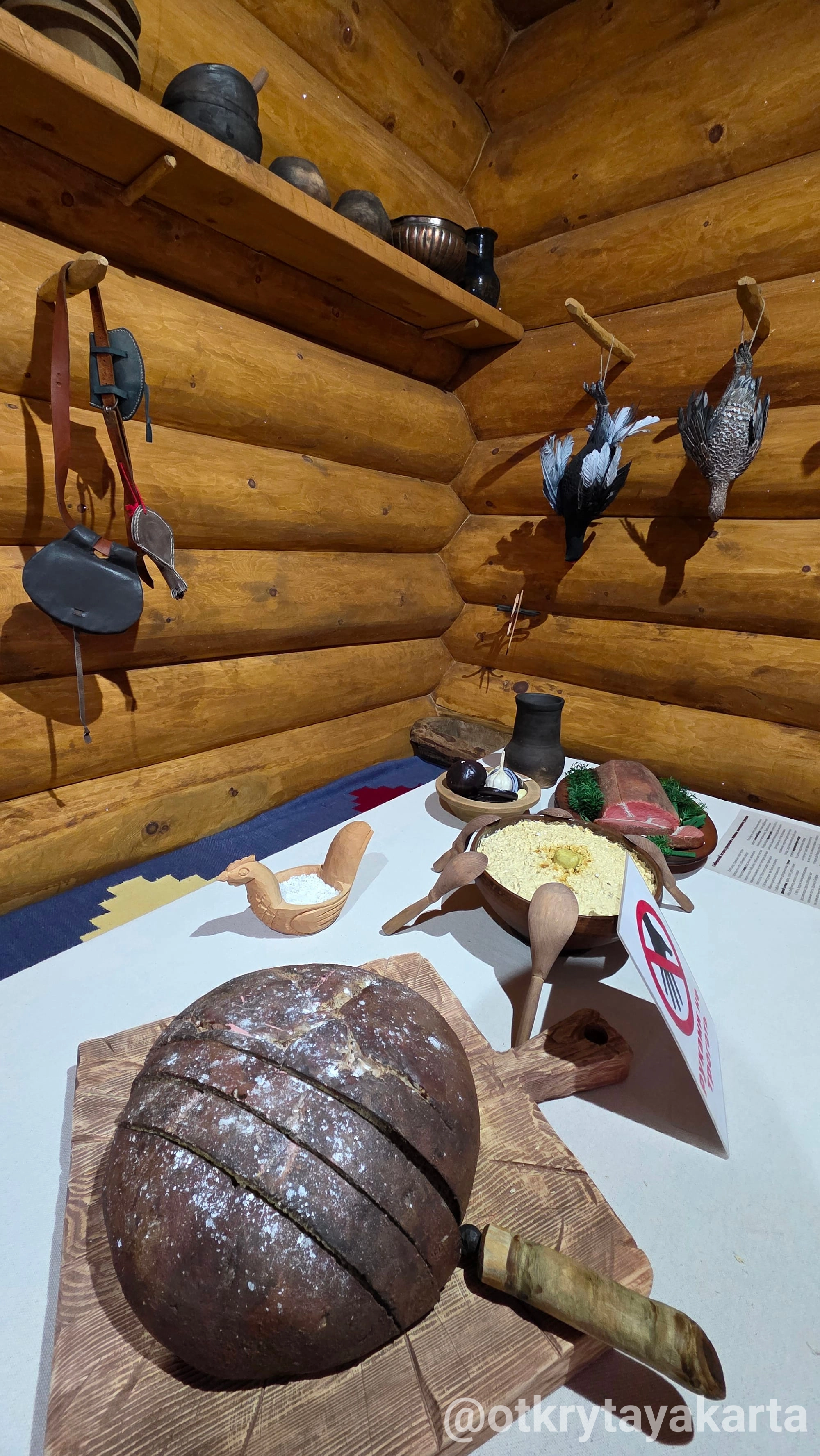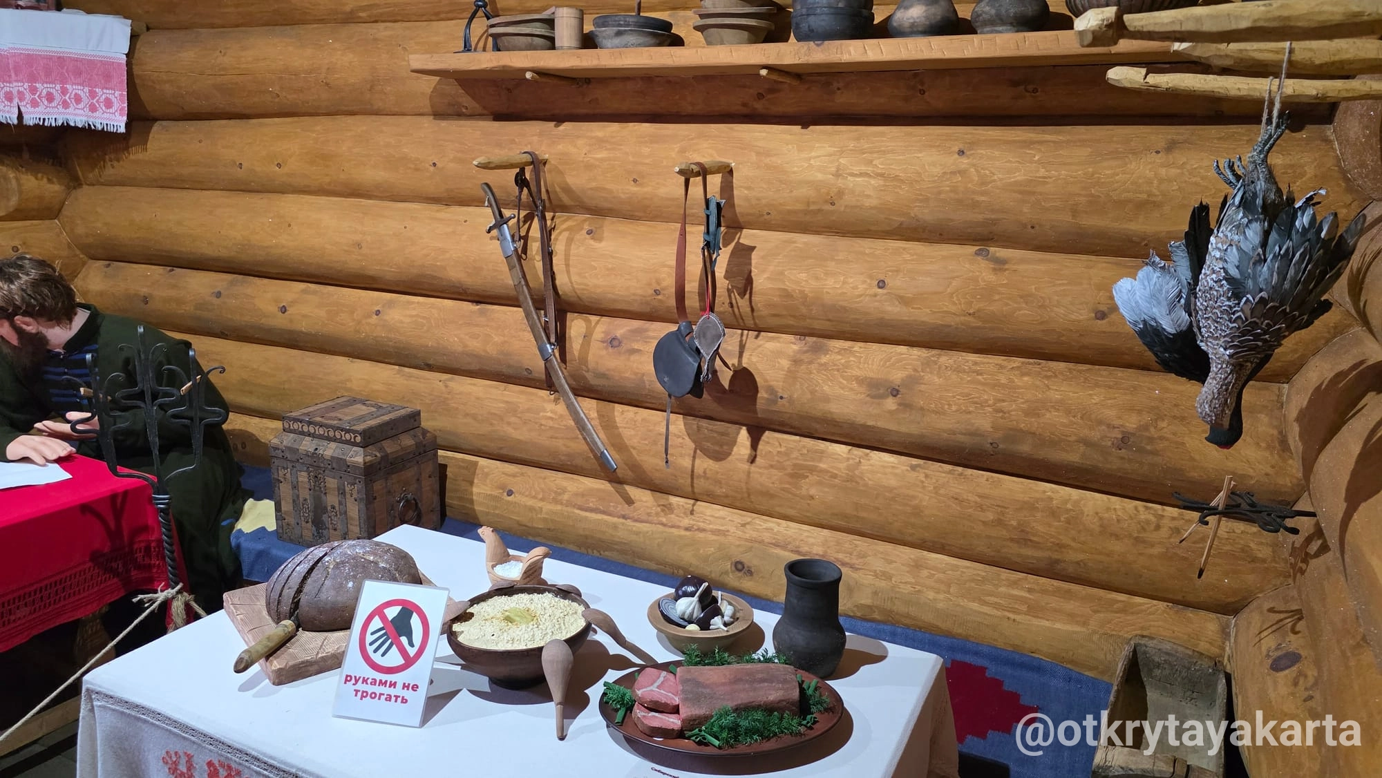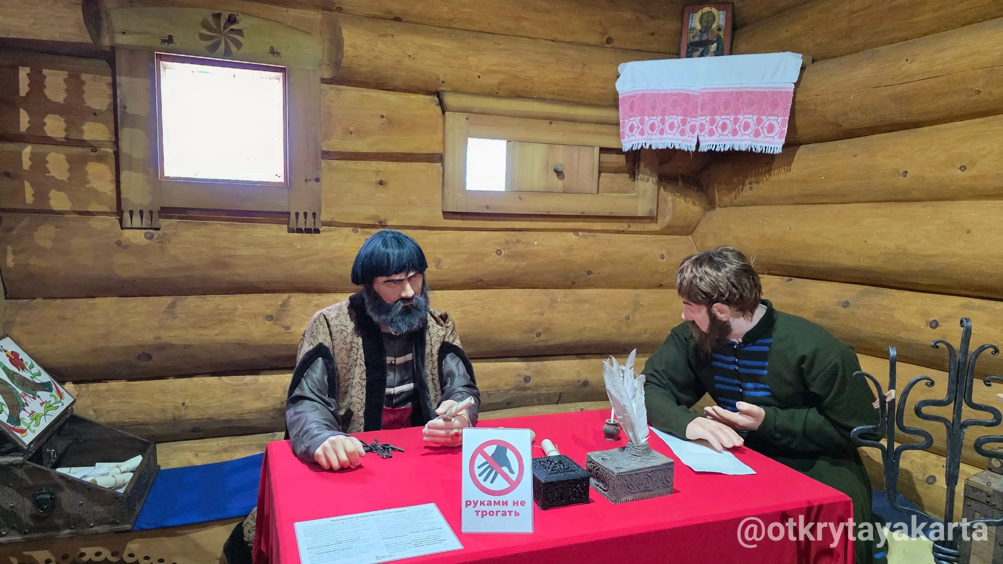 В избе восстановлен интерьер: стол, лавки, утварь, документы. Кажется, что хозяин только что вышел и сейчас вернется. Еда выглядит очень реалистично, руки посетителей так и тянутся.