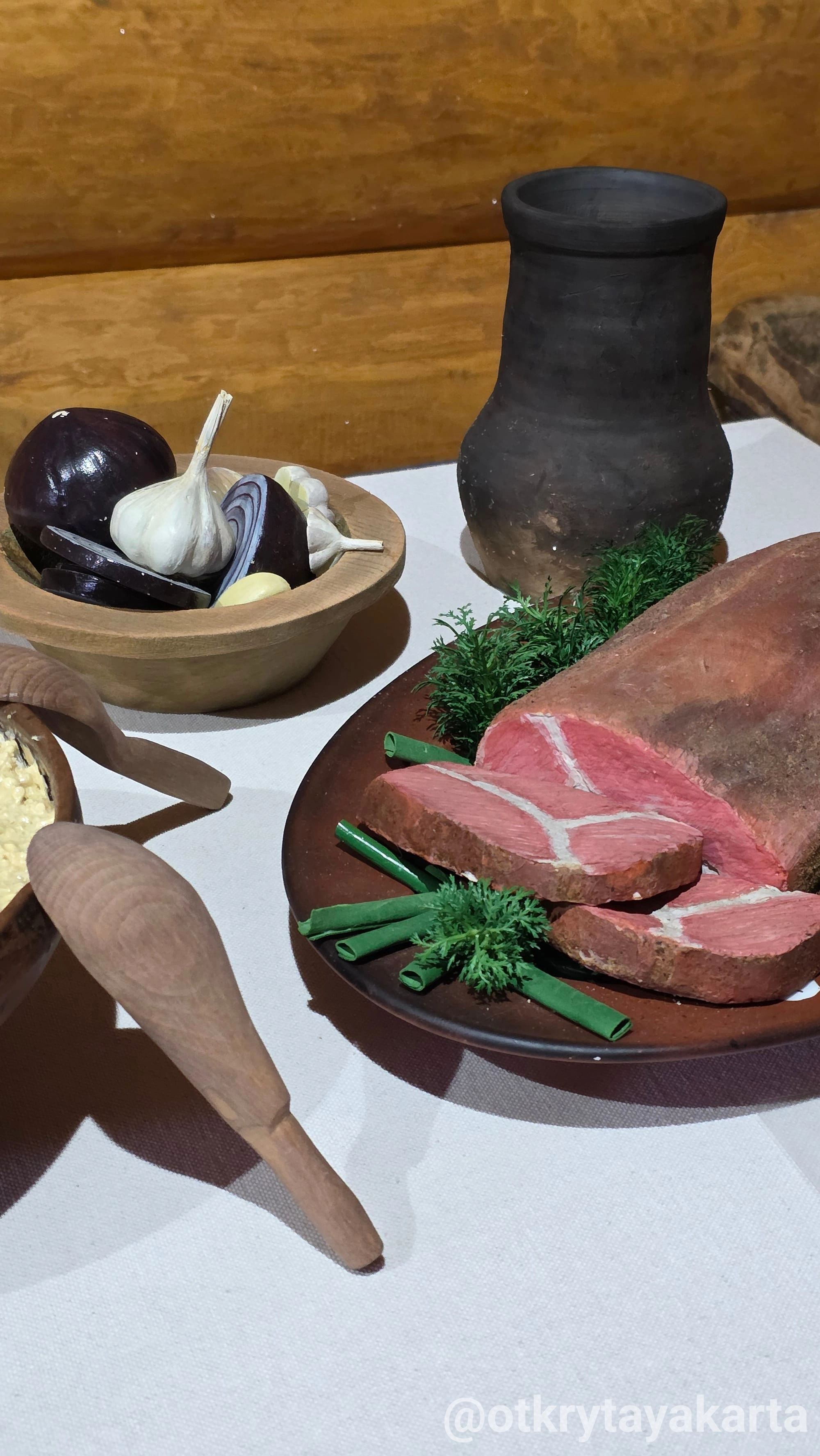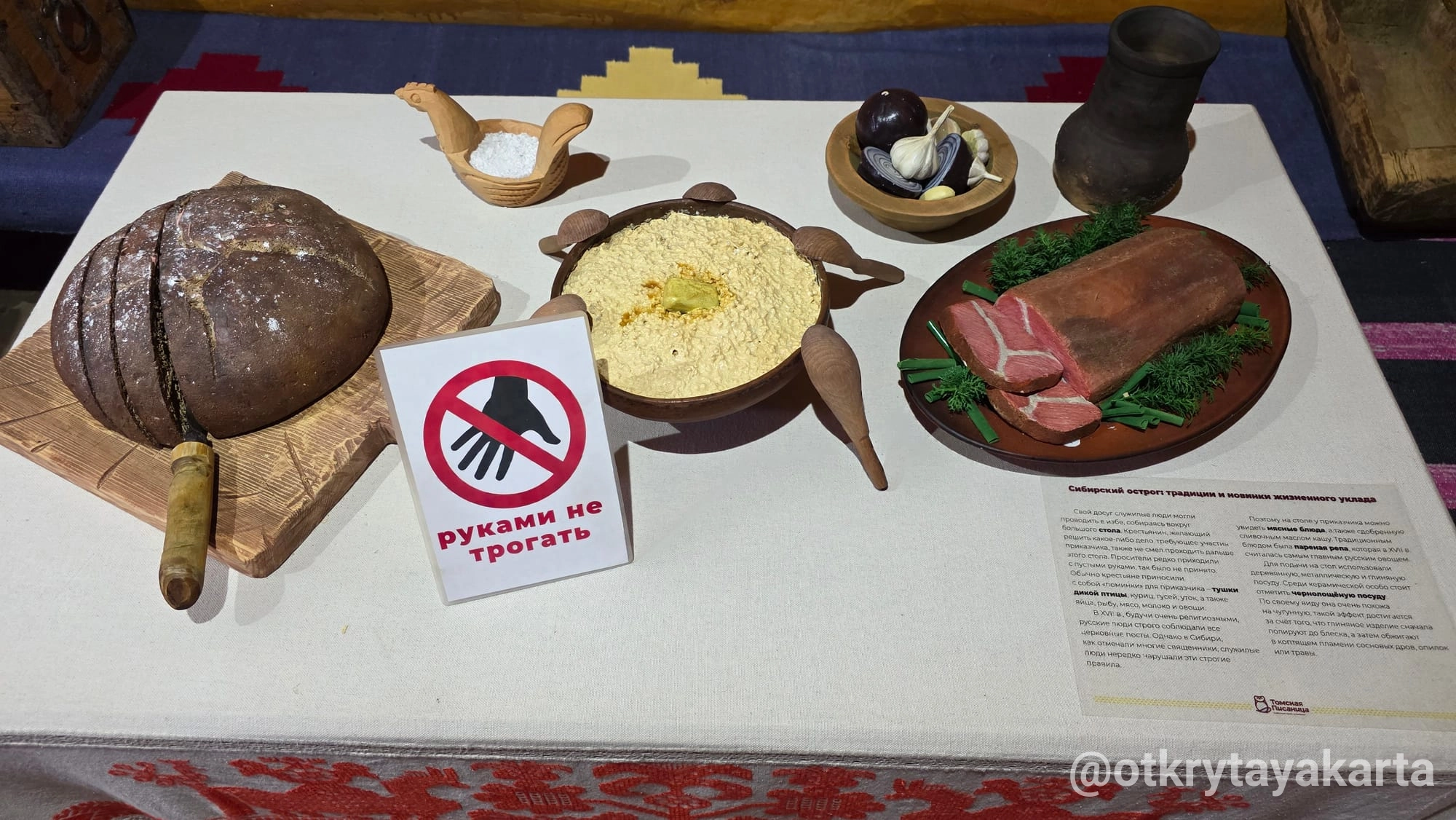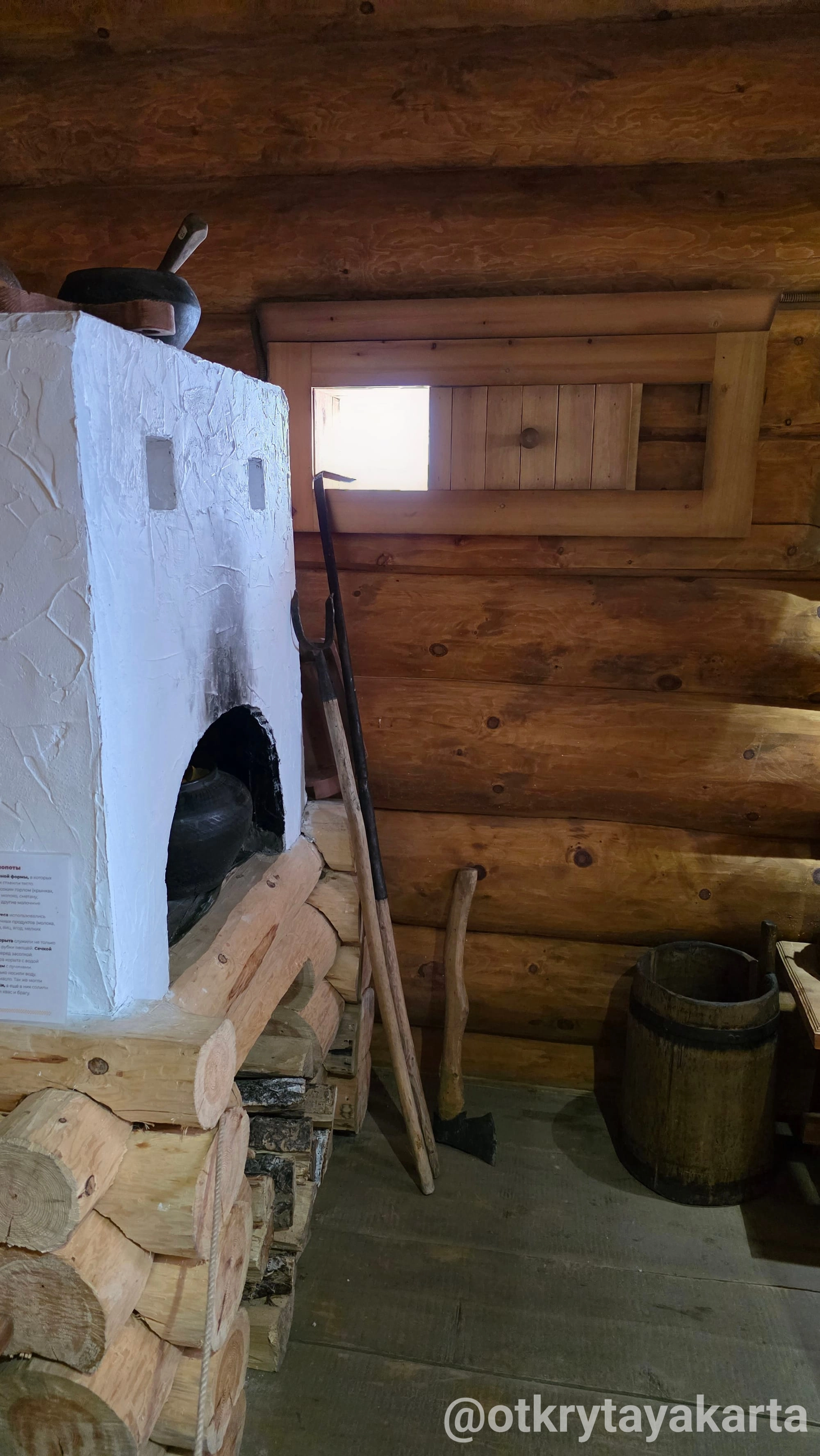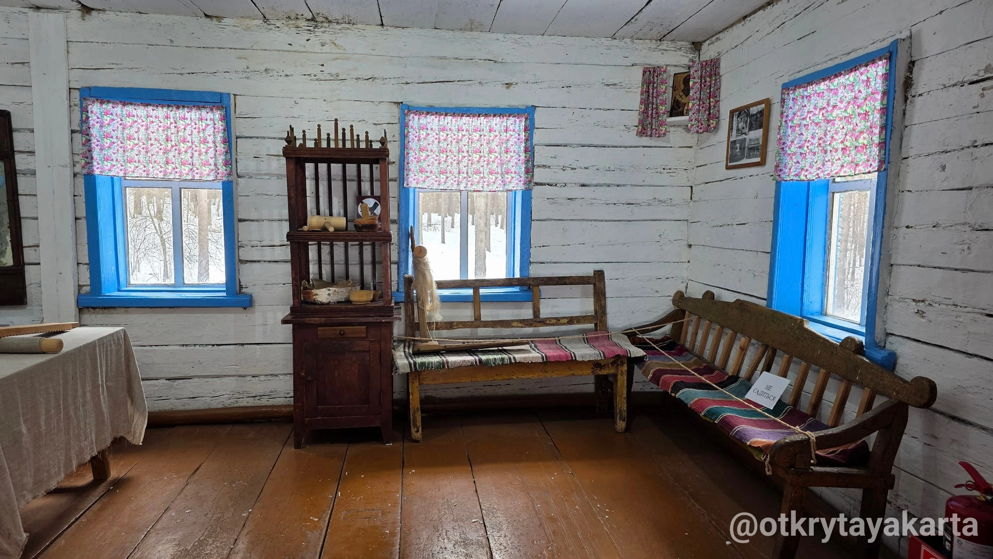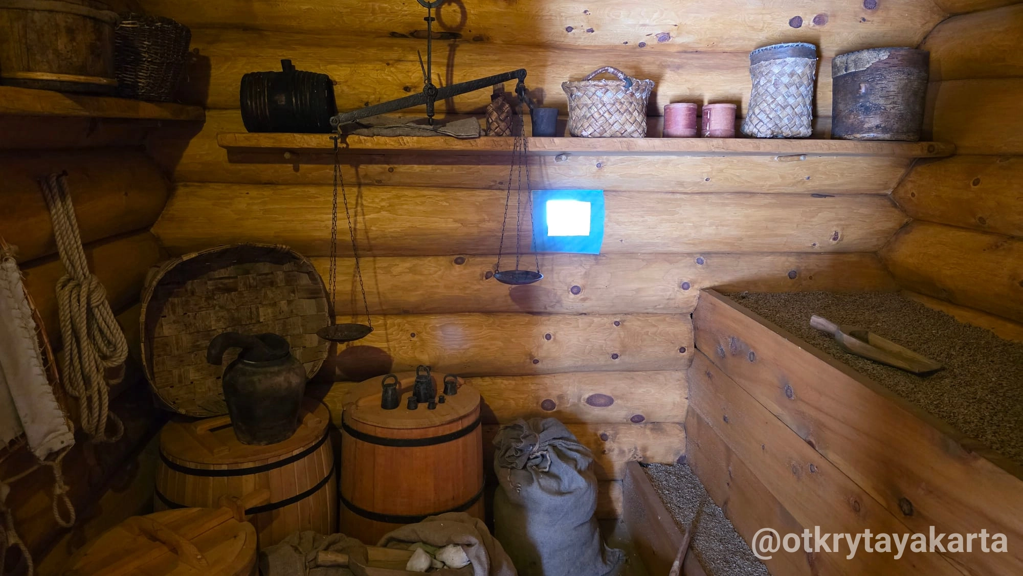 В избе восстановлен интерьер: стол, лавки, утварь, документы. Кажется, что хозяин только что вышел и сейчас вернется. Еда выглядит очень реалистично, руки посетителей так и тянутся.