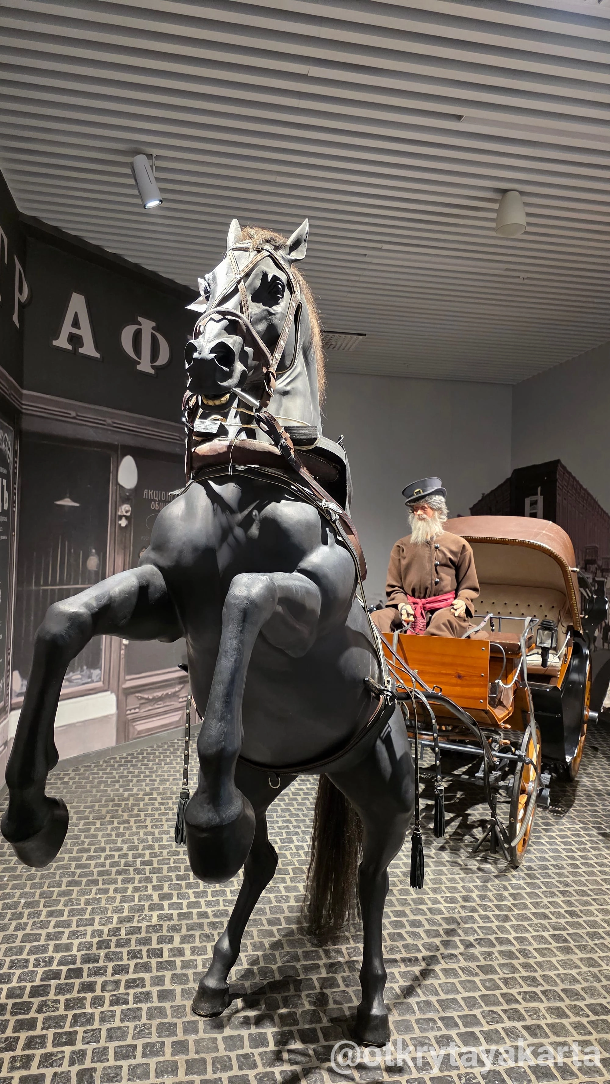 На входе посетителей встречает такая фотозона. С лошадью, кучером и каретой. Рядом висят головные уборы и плащи, для создания полного образа той эпохи.