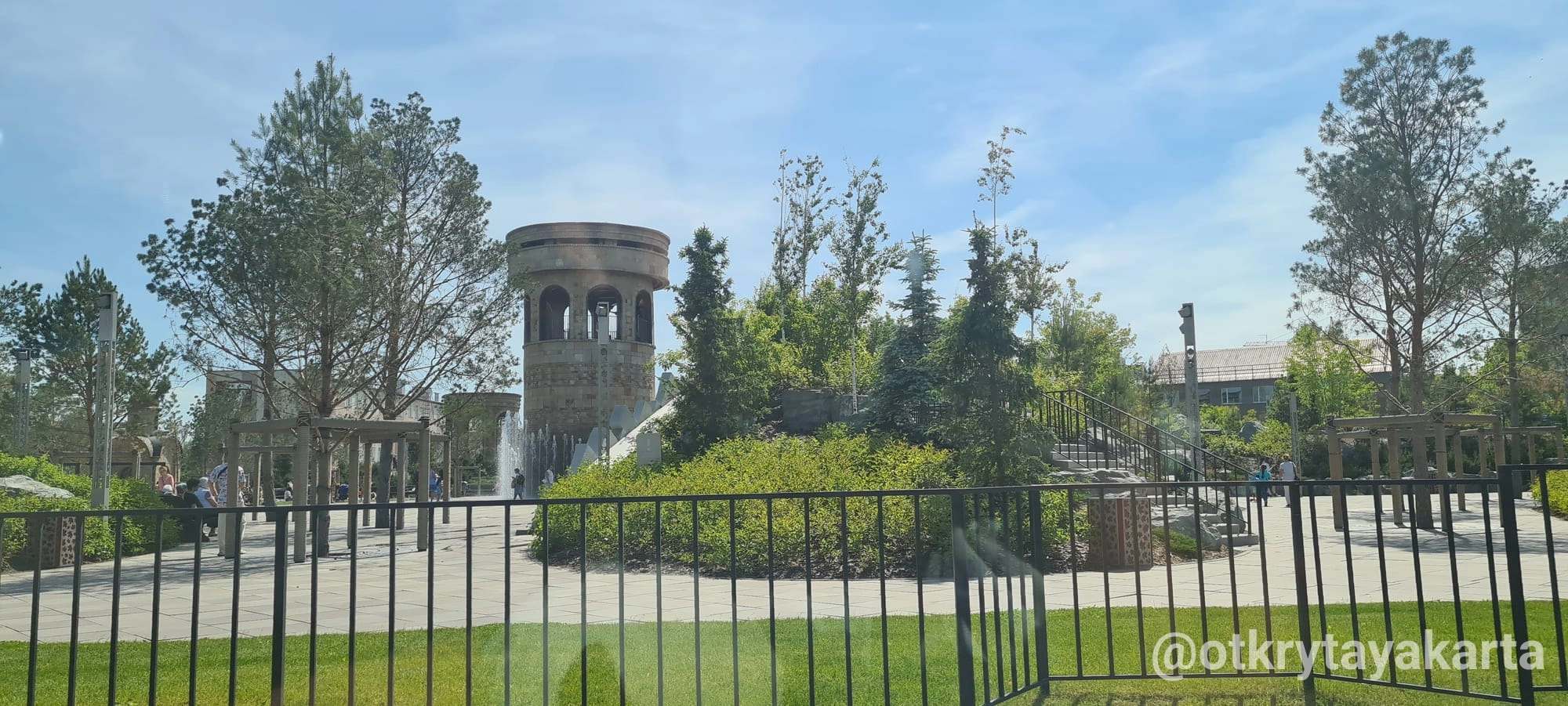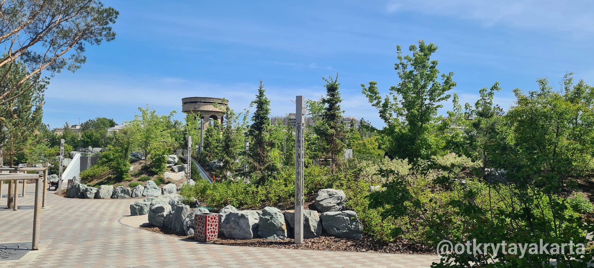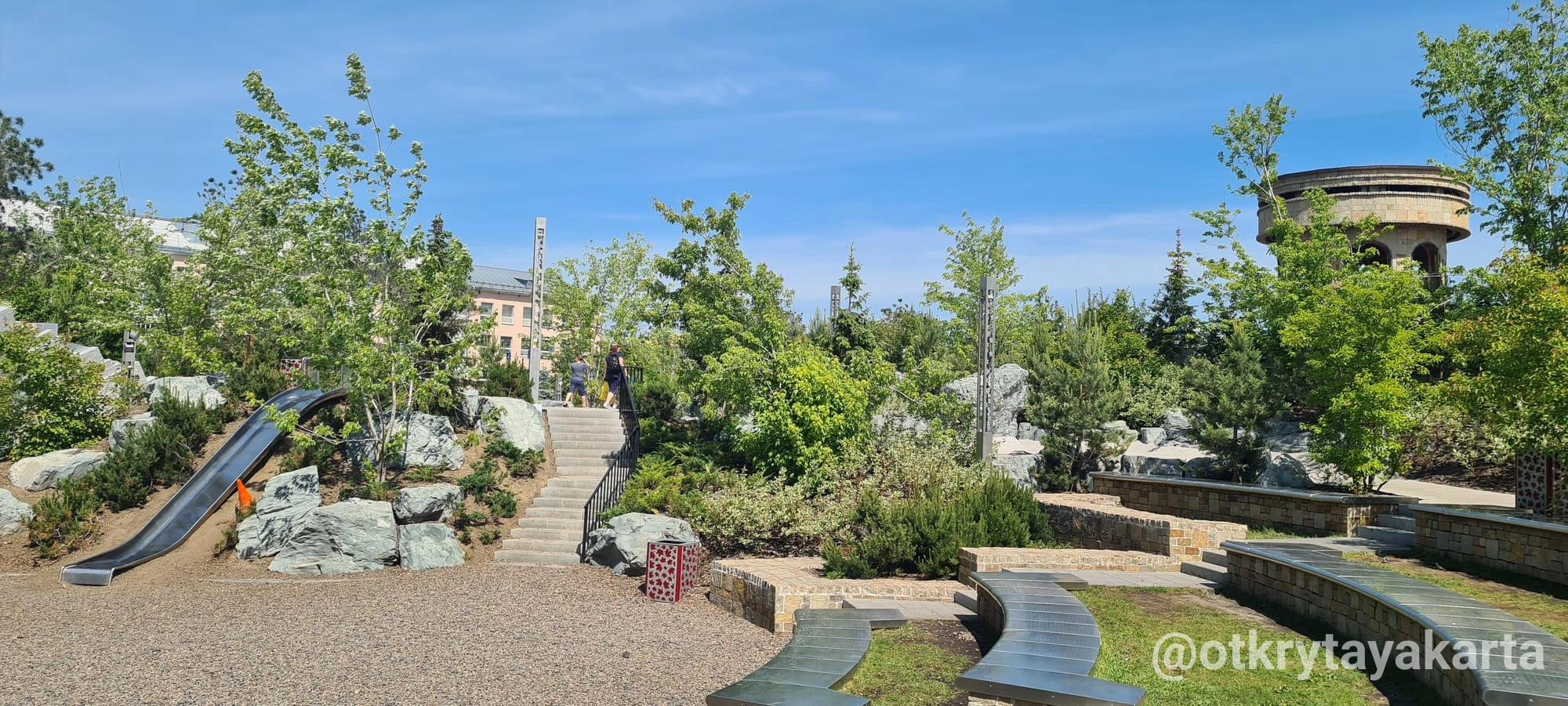 В центре — музыкальный фонтан с терапевтической акустикой, а под холмом спрятано здание с тёплой зоной, санузлами и комнатой матери и ребёнка, что делает место удобным для детей и семей.