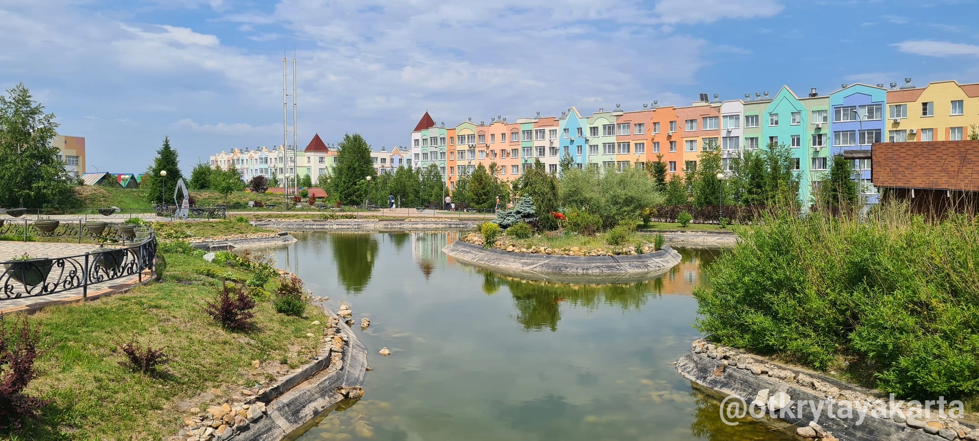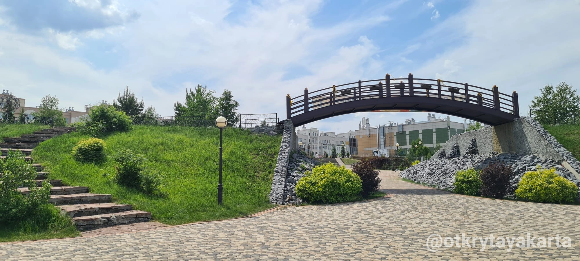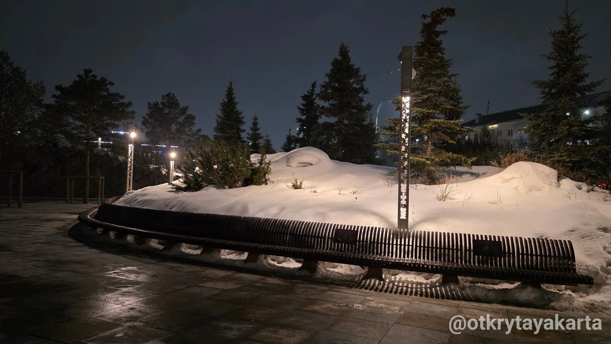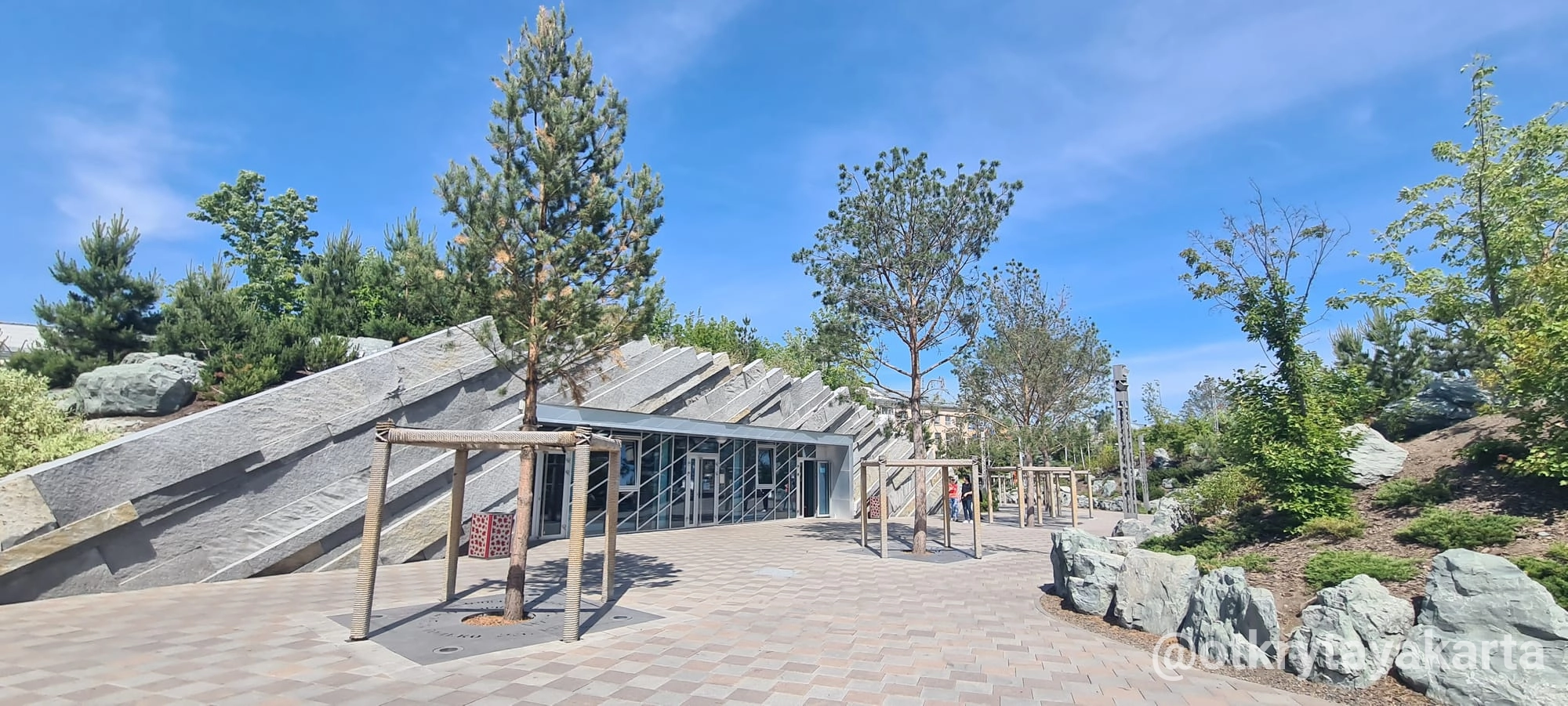 В центре — музыкальный фонтан с терапевтической акустикой, а под холмом спрятано здание с тёплой зоной, санузлами и комнатой матери и ребёнка, что делает место удобным для детей и семей.