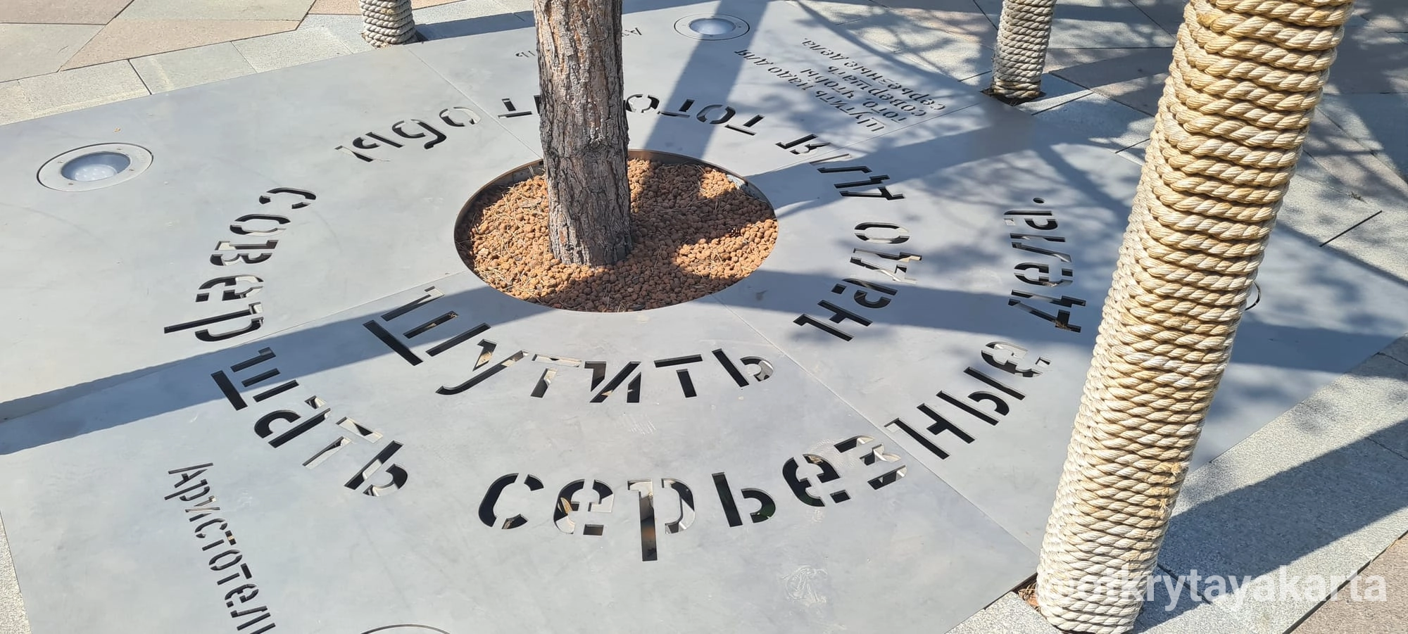 В центре площади — три входных аркады: «Кемерово», «Москва» и «Новокузнецк», символизирующие связь трёх городов‑союзников. Отсюда открывается выход на новую набережную, которая продолжает Притомский пешеходный маршрут и визуально превращает берег Томи в единое городское пространство.