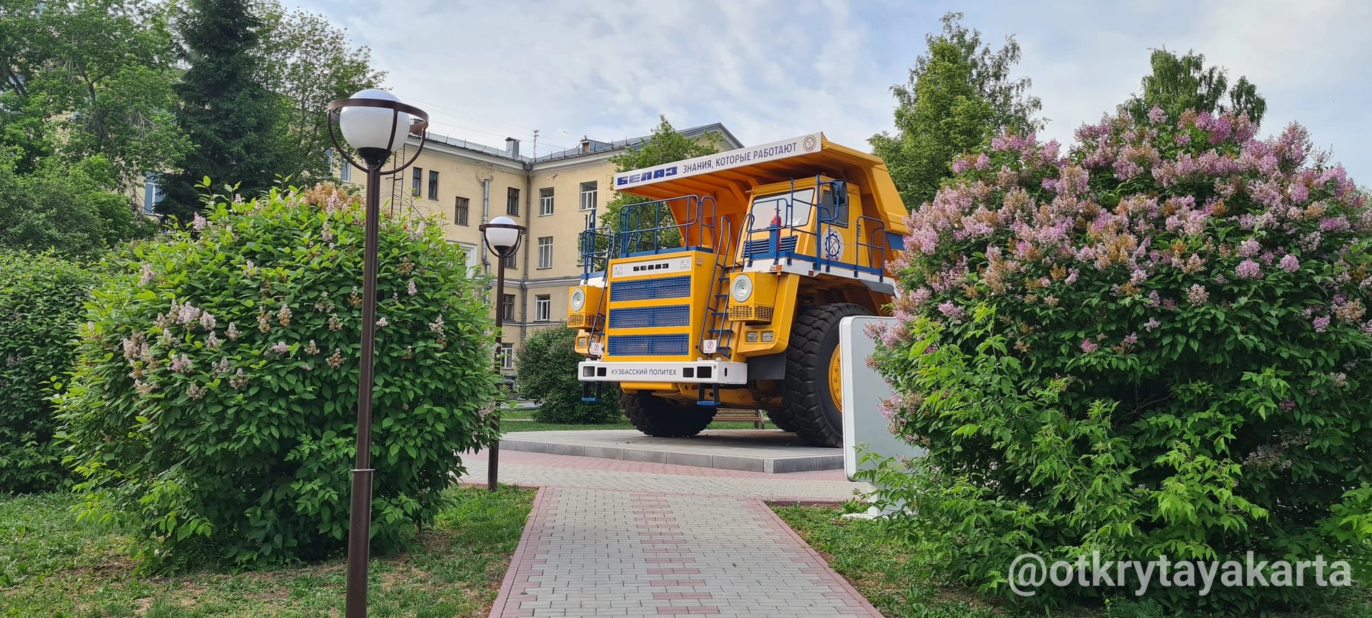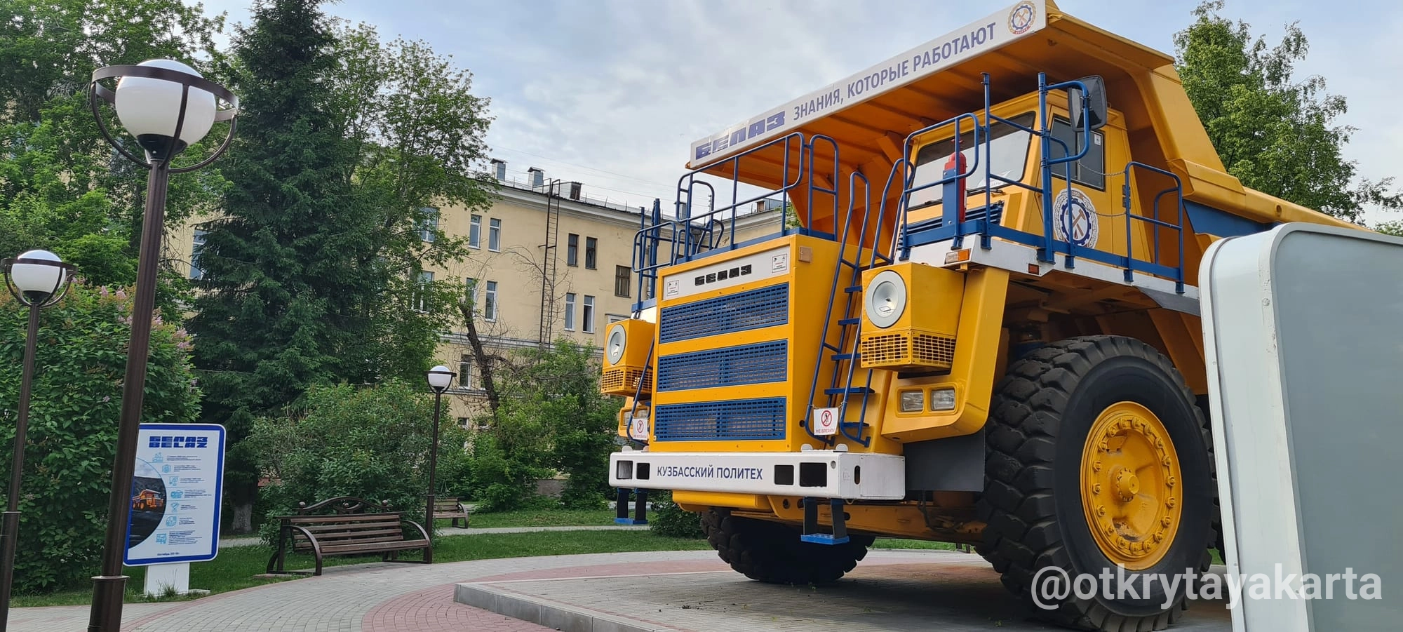 В центре сквера, на бетонном подиуме, установлен настоящий карьерный самосвал «БелАЗ» грузоподъёмностью 90 тонн. Эта машина уже отработала свой срок на угольных разрезах Кузбасса, но теперь обрела вторую жизнь в качестве учебно-выставочного объекта. Рядом размещены информационные стенды, где можно познакомиться с историей КузГТУ и БелАЗа, а также проследить, как складывалось многолетнее сотрудничество вуза и завода.