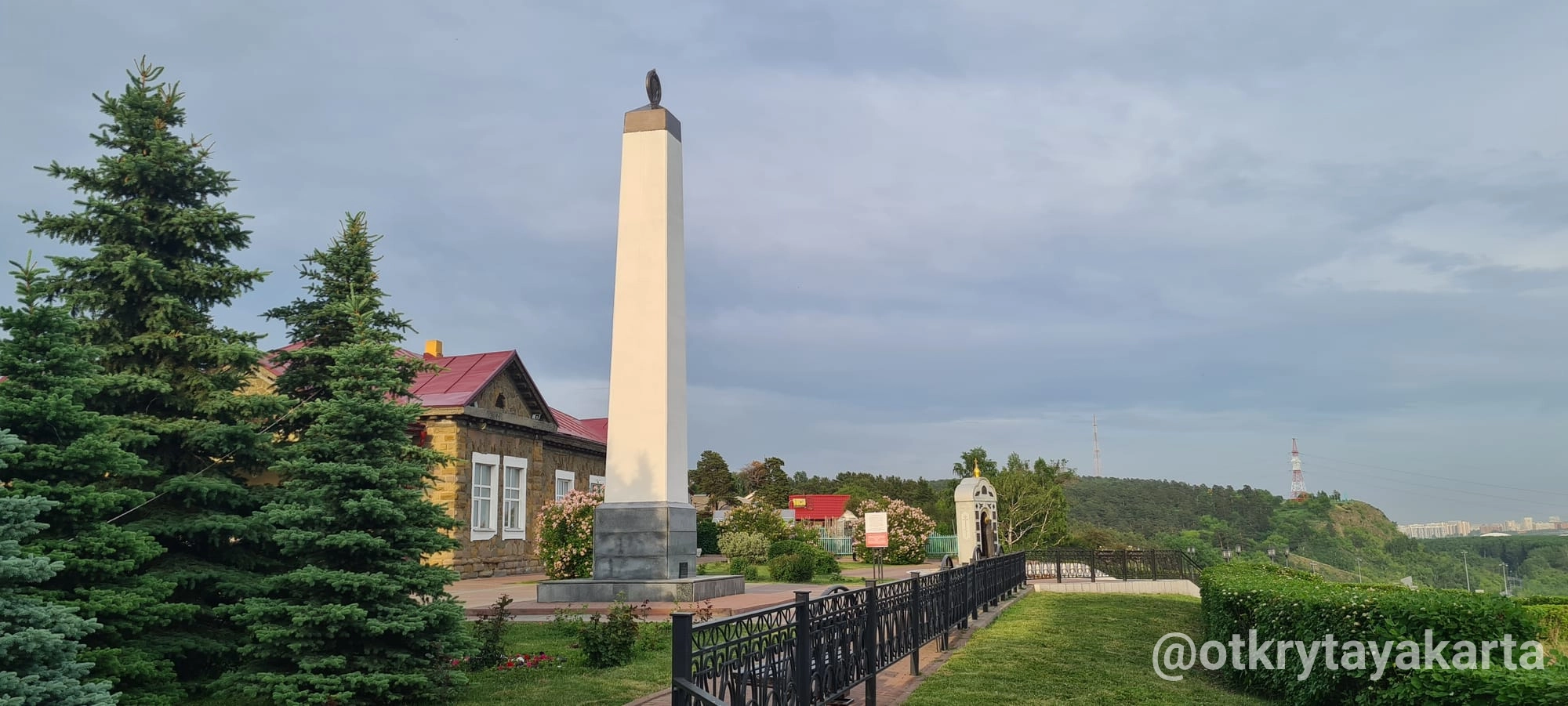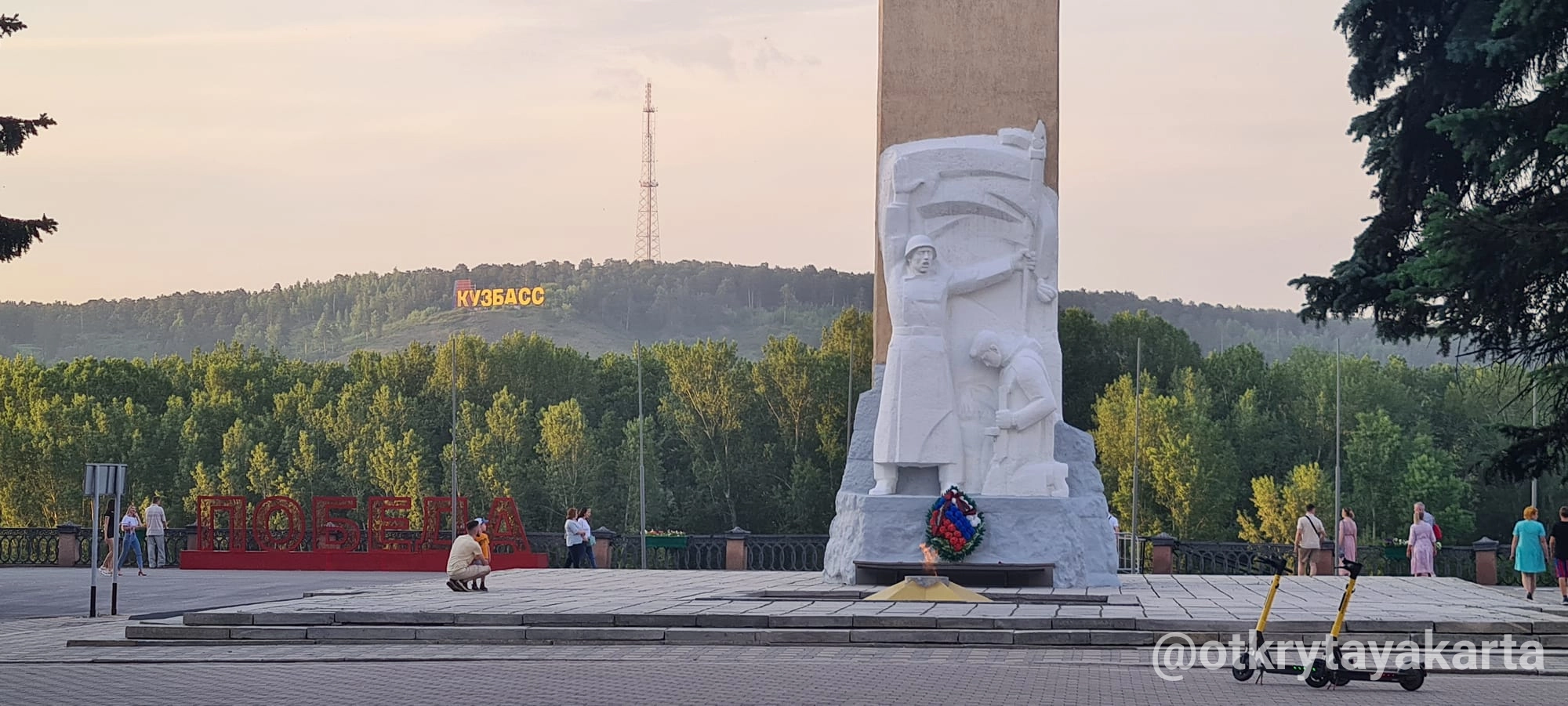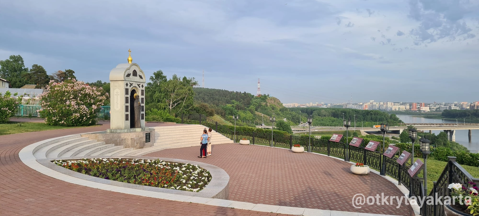 Мемориал стоит на возвышении, и рядом с ним оборудована просторная смотровая площадка. С неё открывается панорама на Томь, Кузнецкий мост и Заводской район — отличное место, чтобы увидеть город с высоты.