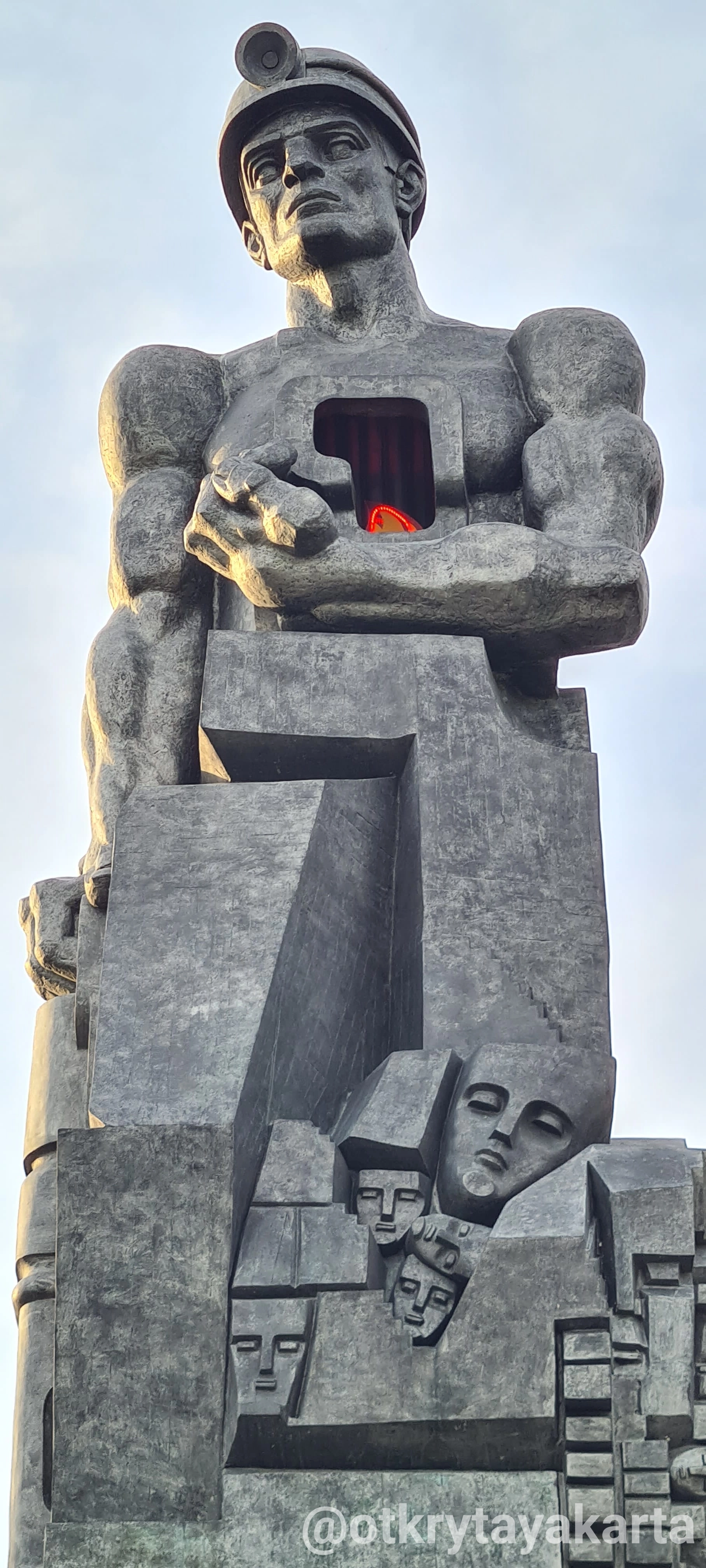 Бронзовая фигура шахтёра высотой 7 метров установлена на 4-метровом гранитном постаменте. В правой руке герой держит отбойный молоток, в левой — кусок угля. Внутри монумента смонтирована подсветка: в районе сердца встроена лампа, которая светит красным, символизируя и горячее сердце горняка, и пульс недр. Скульптура выполнена в характерной для Неизвестного манере — мощный сплав символизма, кубизма и экспрессии.