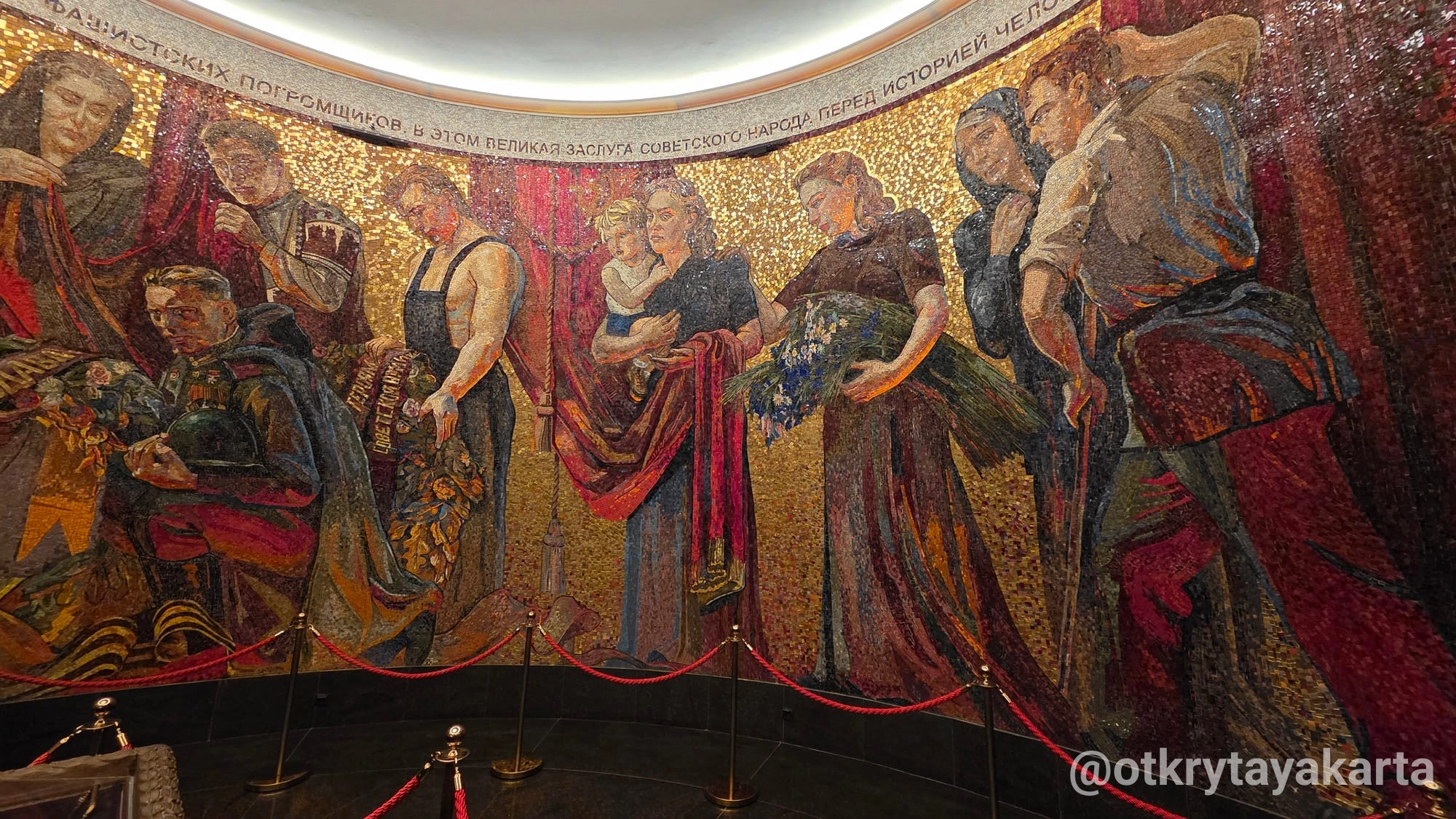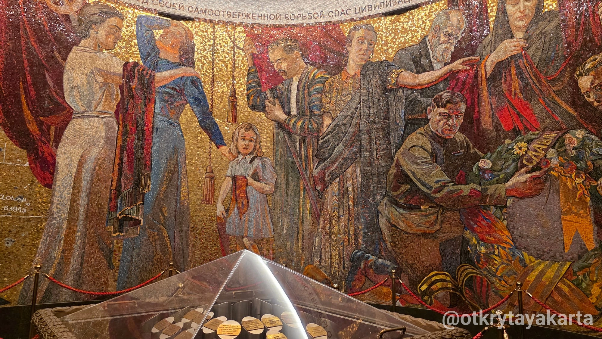 - Мозаичное панно внутри постамента — копия мозаики из Трептов-парка с двумя новыми сюжетами. На панно — труженики тыла, Родина-мать и фигура Масалова на фоне рейхстага.