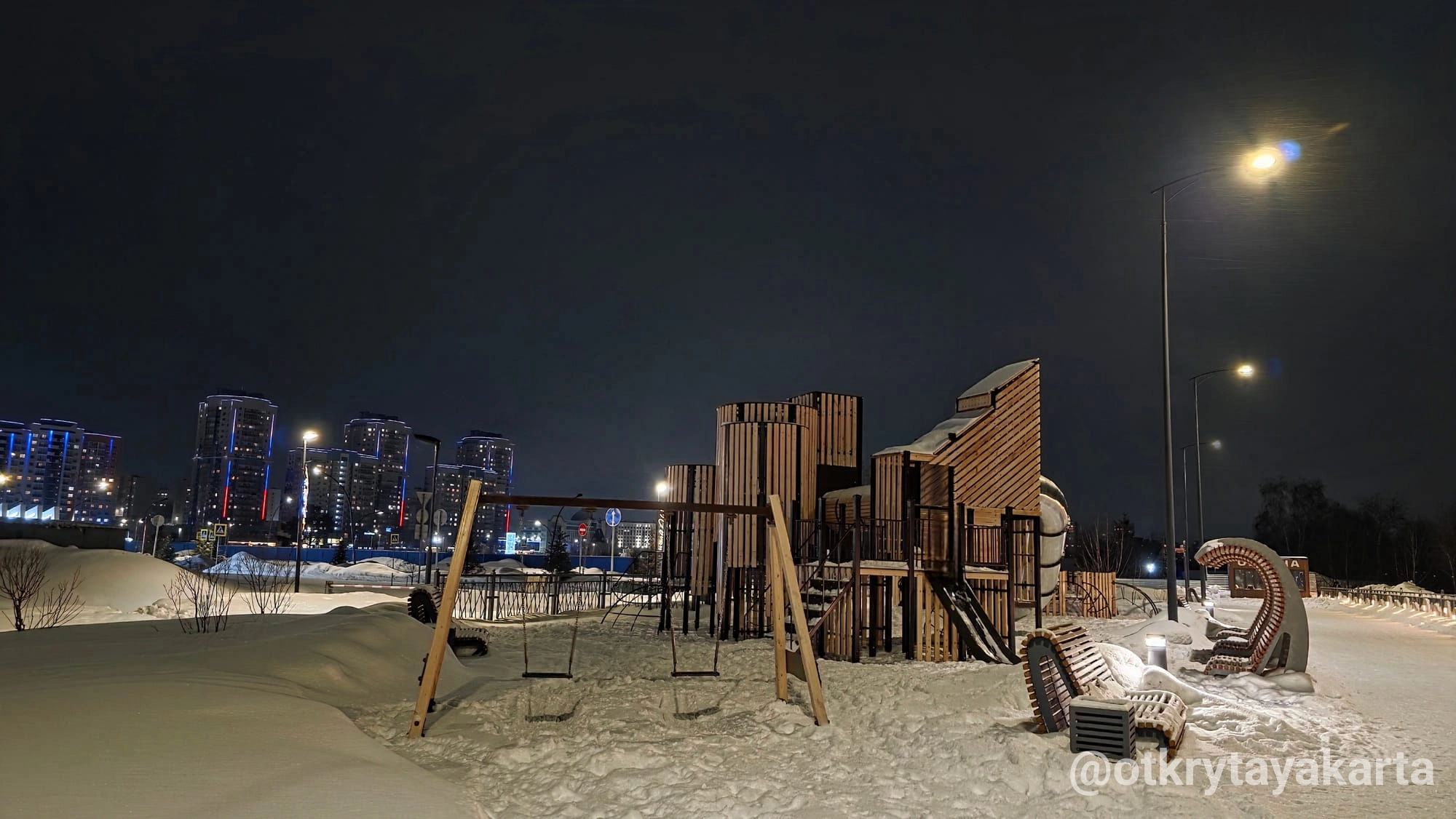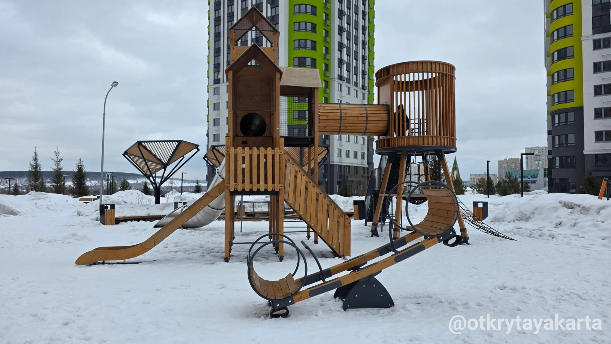 - Детские игровые зоны с нестандартным дизайном — дерево, металл, никаких ярких пластиковых форм, всё выдержано в единой стилистике.