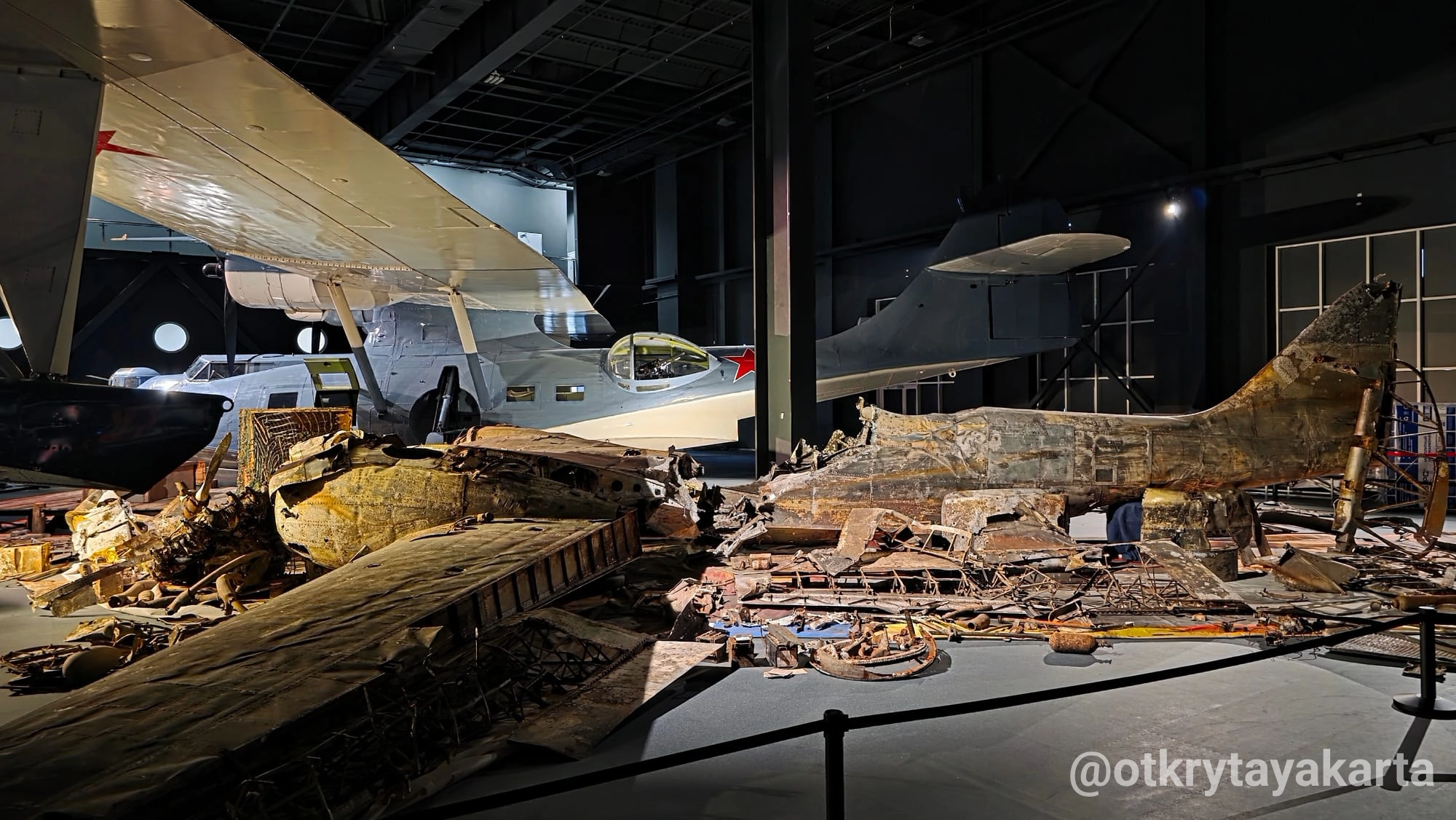Пространство организовано вокруг подлинных фрагментов самолета: они не просто лежат за стеклом, а работают как архитектура зала, зонируя экспозицию.