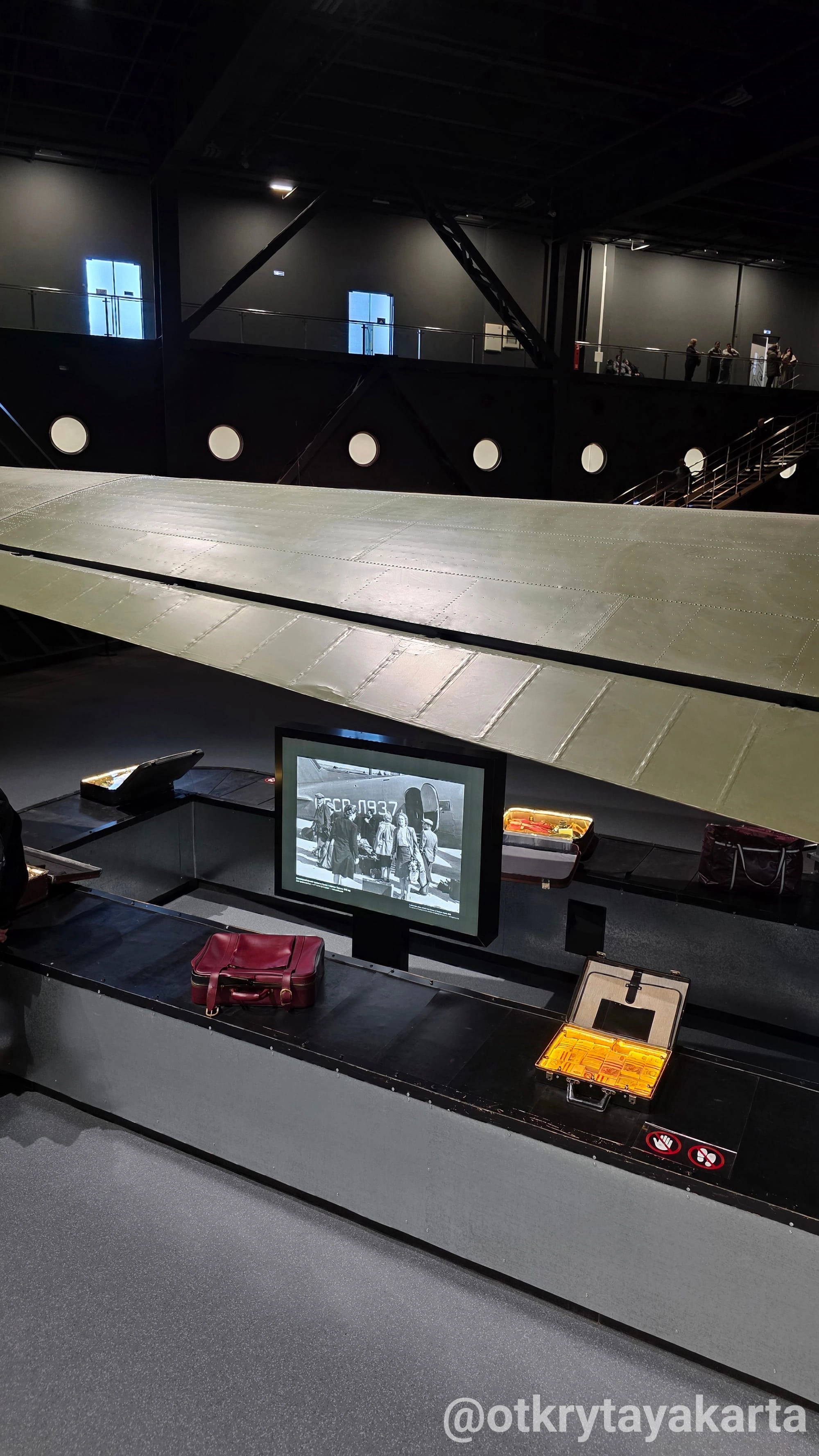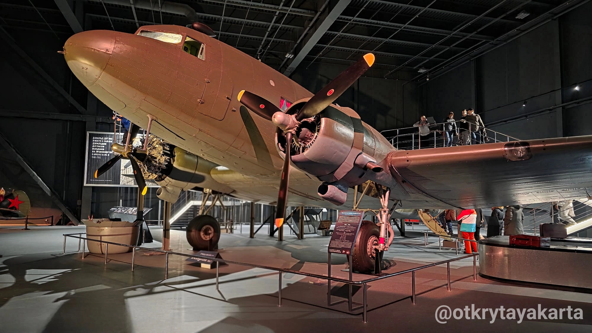 Отдельная гордость коллекции — транспортный Douglas DC-3. Это не просто редкий экспонат, а настоящая кинозвезда. Вокруг легендарного DC-3 построили настоящий ретроаэропорт: перекидное табло, багажная лента с винтажными чемоданами, плакаты «Аэрофлота». Здесь можно не только узнать историю самолета, но и услышать звук его мотора в наушниках.