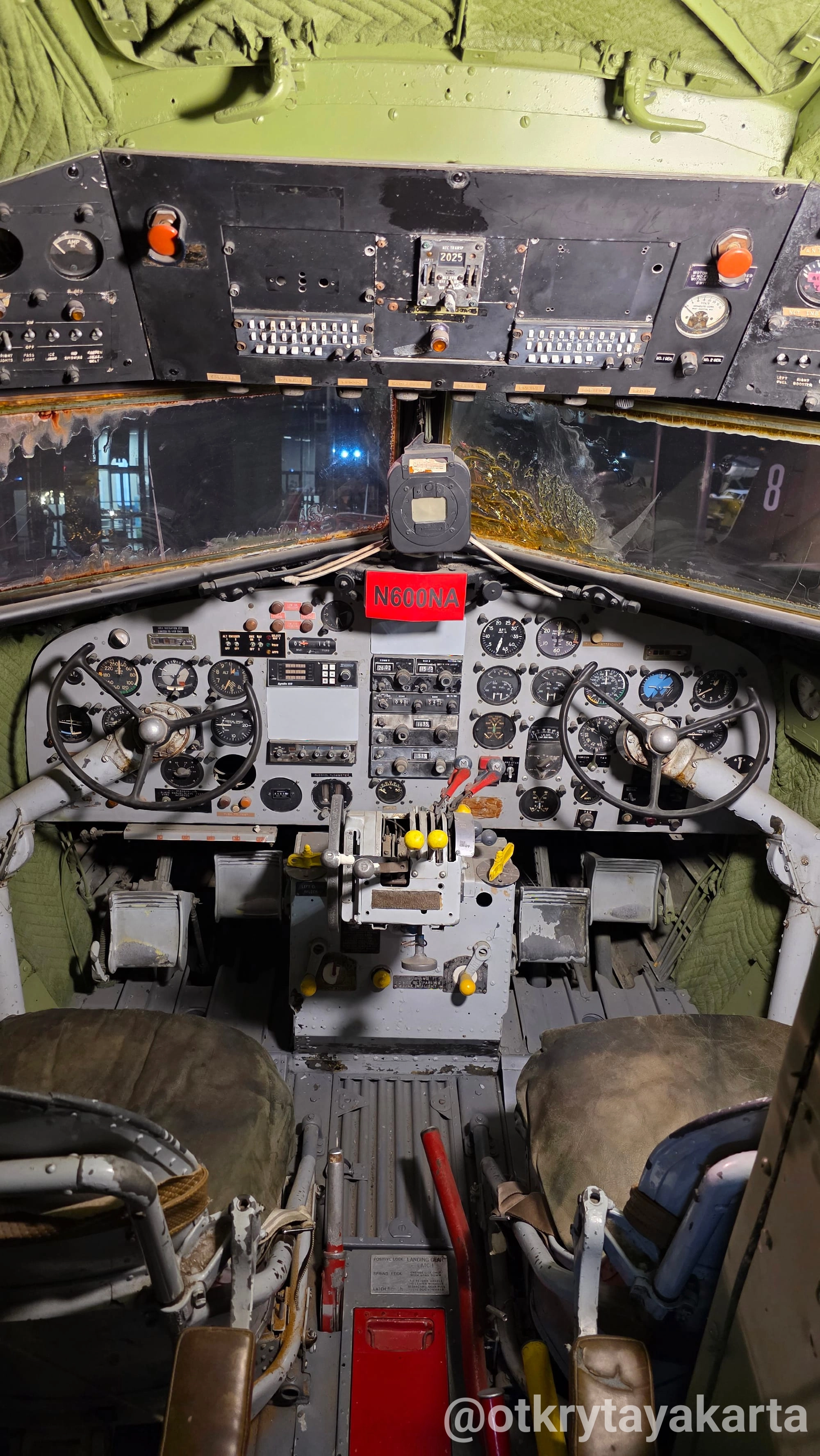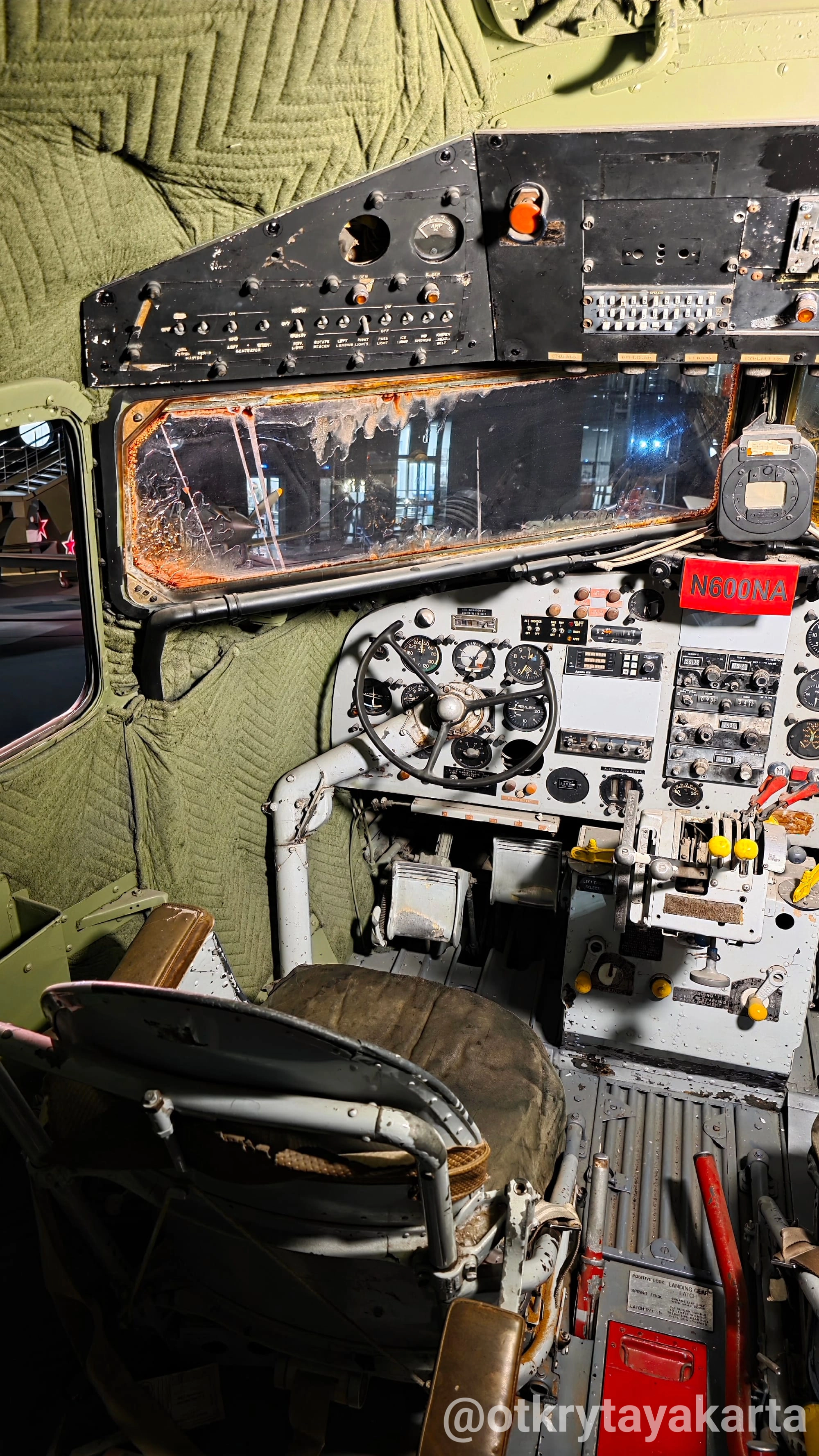 Этот борт сошел с конвейера в 1940 году и летал 63 года. Возил пассажиров в Венесуэле и США, был летающим аттракционом, снимался в Голливуде с Уиллом Смитом, а за штурвалом сидел Джон Траволта. Над самолетом построили панорамную площадку — можно рассмотреть двигатели и винты сверху. А главное — теперь гостей приглашают внутрь: сесть в кресла 1940-х, заглянуть в кабину пилота и сделать фото.