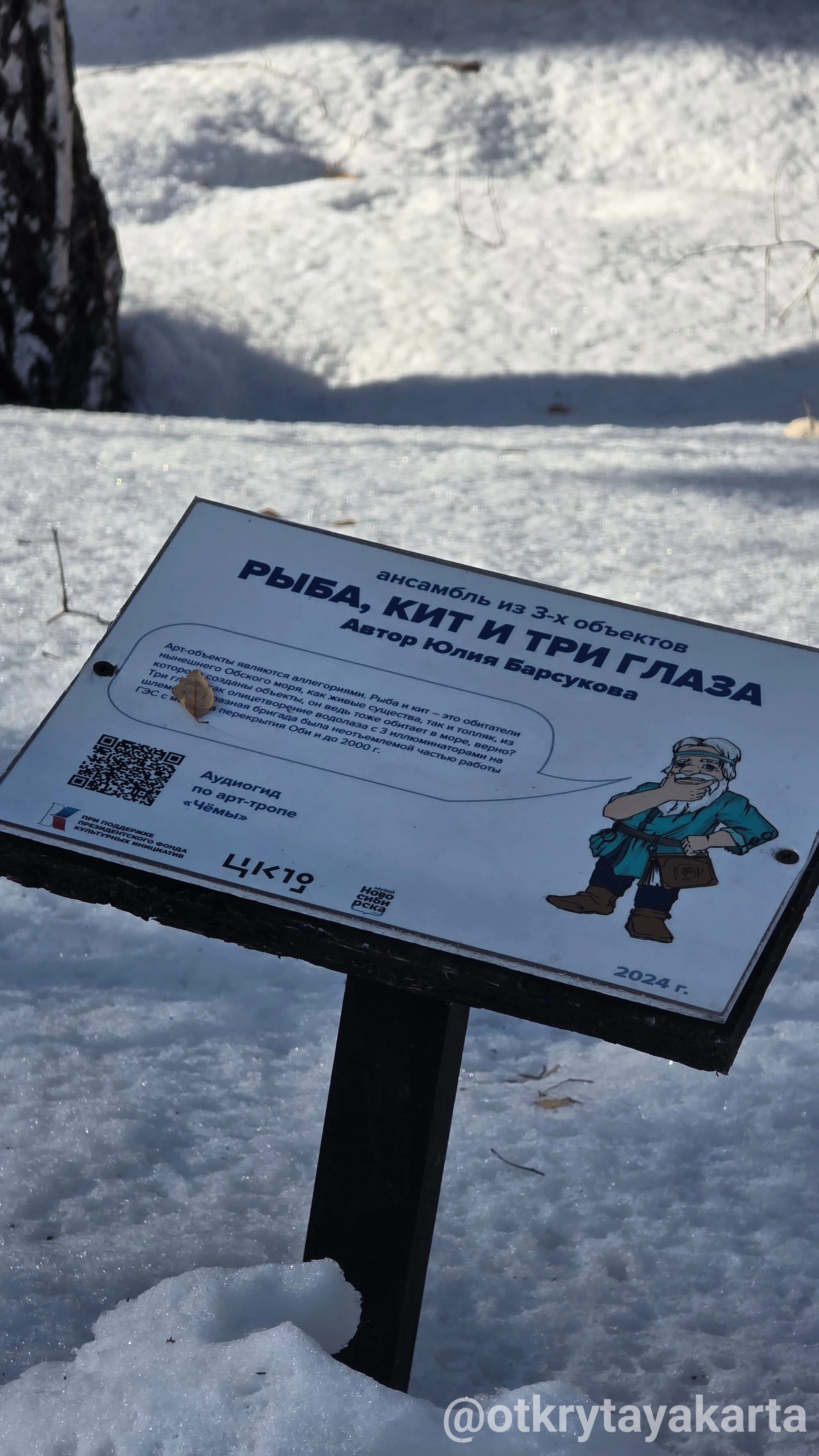 У каждой фигуры на тропе есть своя табличка с QR-кодом. Наводите камеру — и аудиогид голосом методиста музея Марьям Гулиевой рассказывает альтернативную историю Новосибирска.