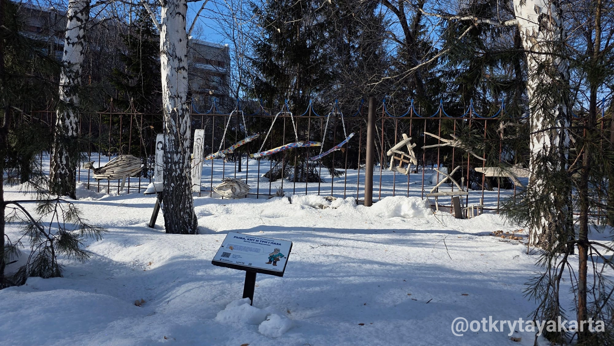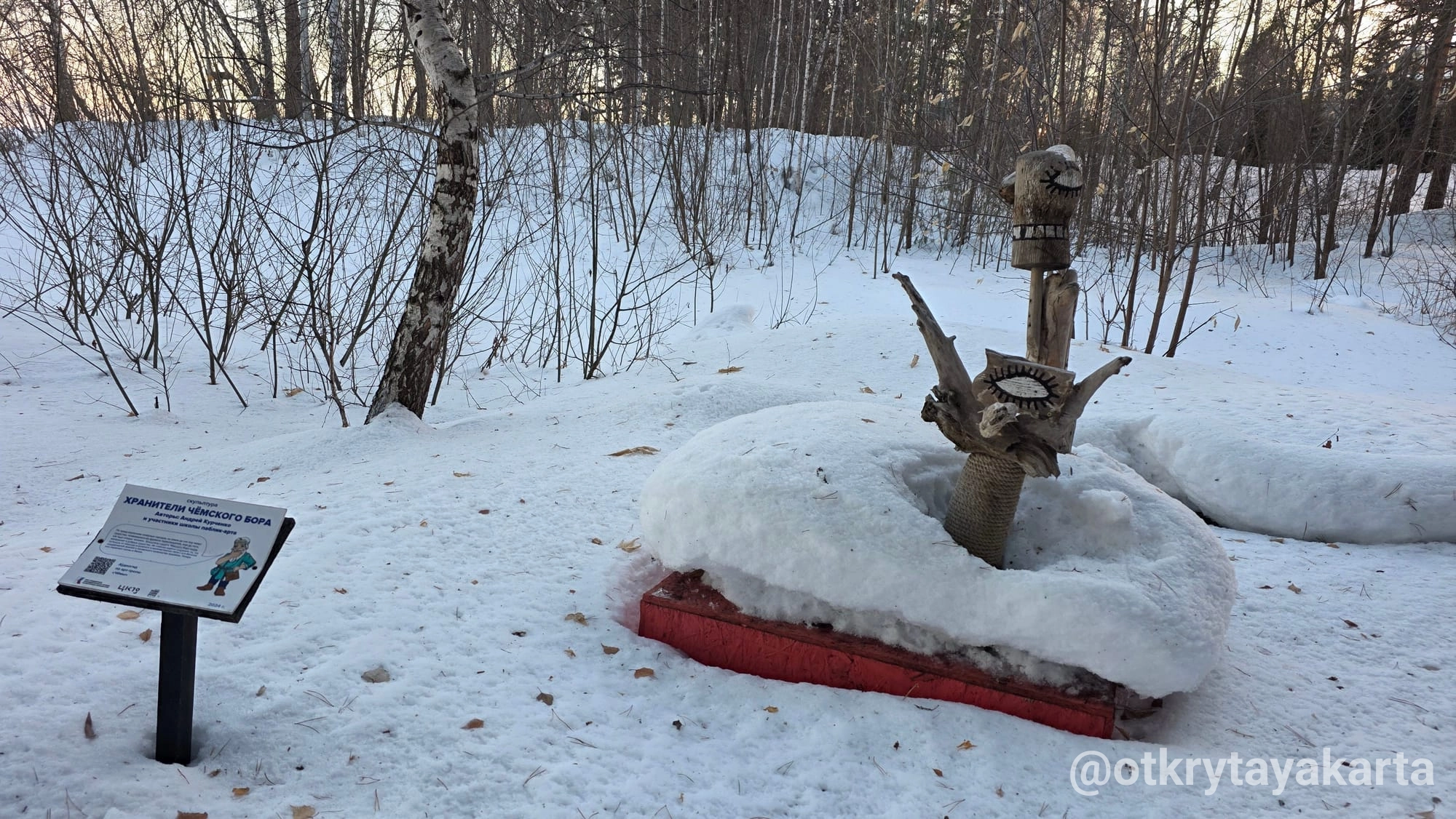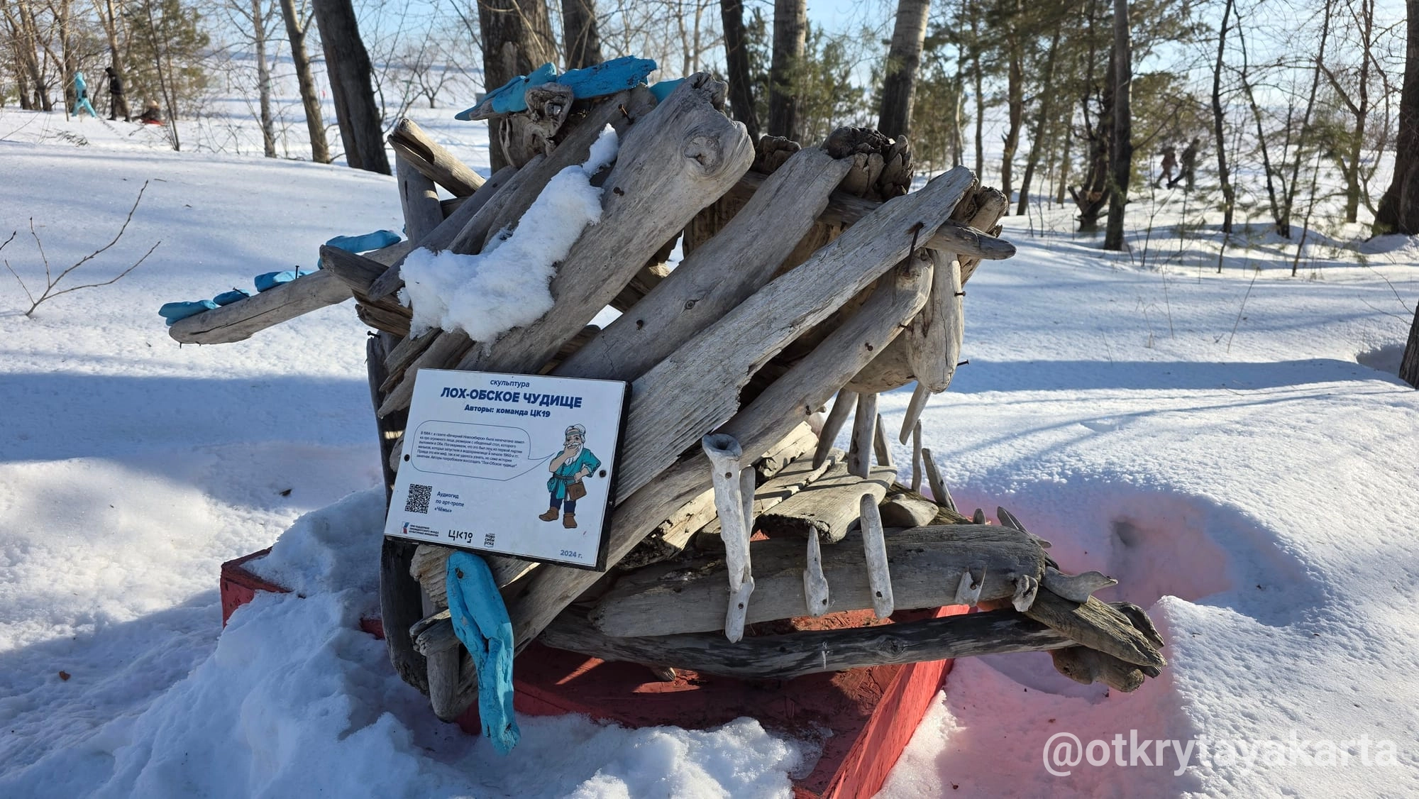 В парке «У моря Обского» уже два года живет удивительный маршрут. Местные проходят мимо, принимая скульптуры за коряги, а любопытные туристы ищут в них глубокий смысл. Я побывала на тропе зимой, по пути на фестиваль иглу. И поняла: сюда обязательно нужно вернуться, когда сойдет снег, чтобы разгадать все 28 загадок.