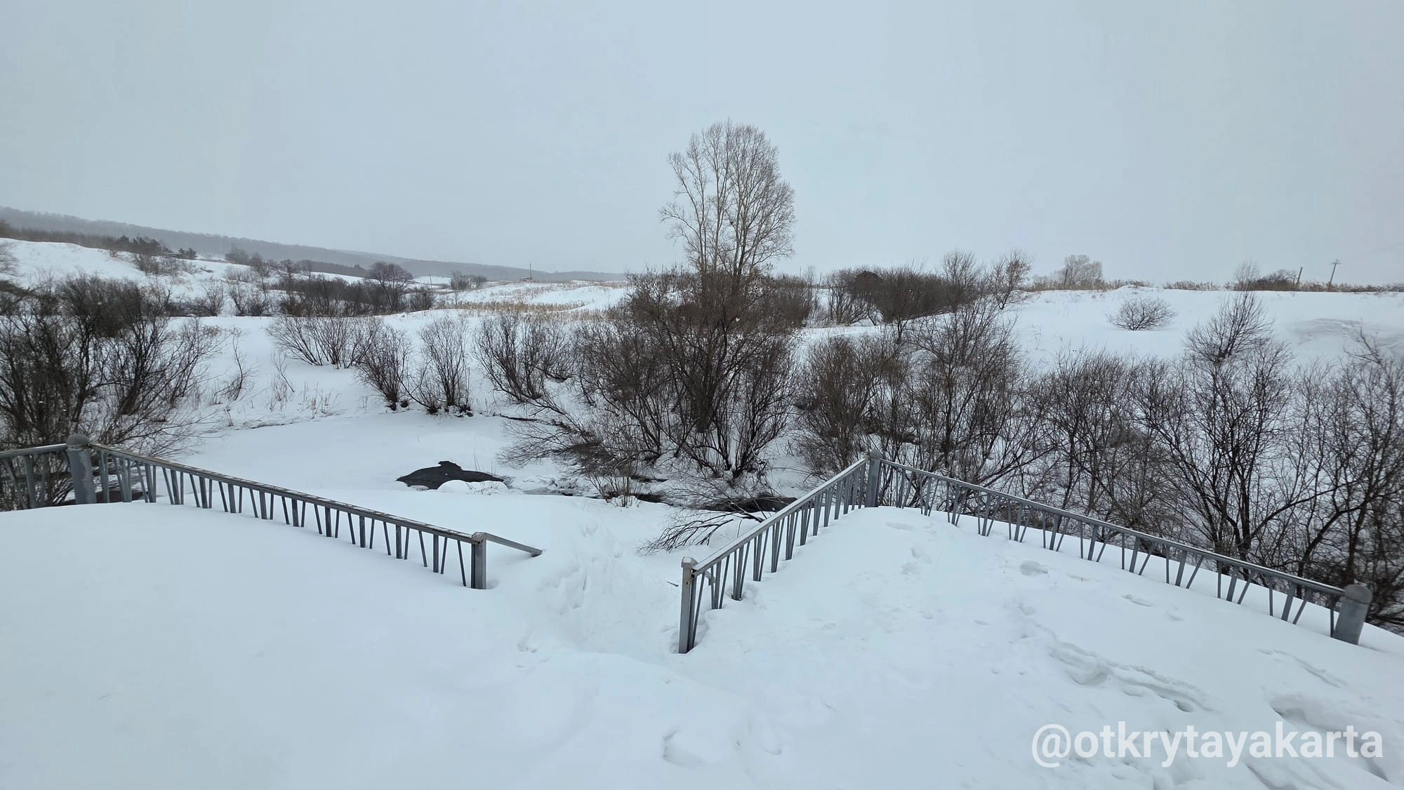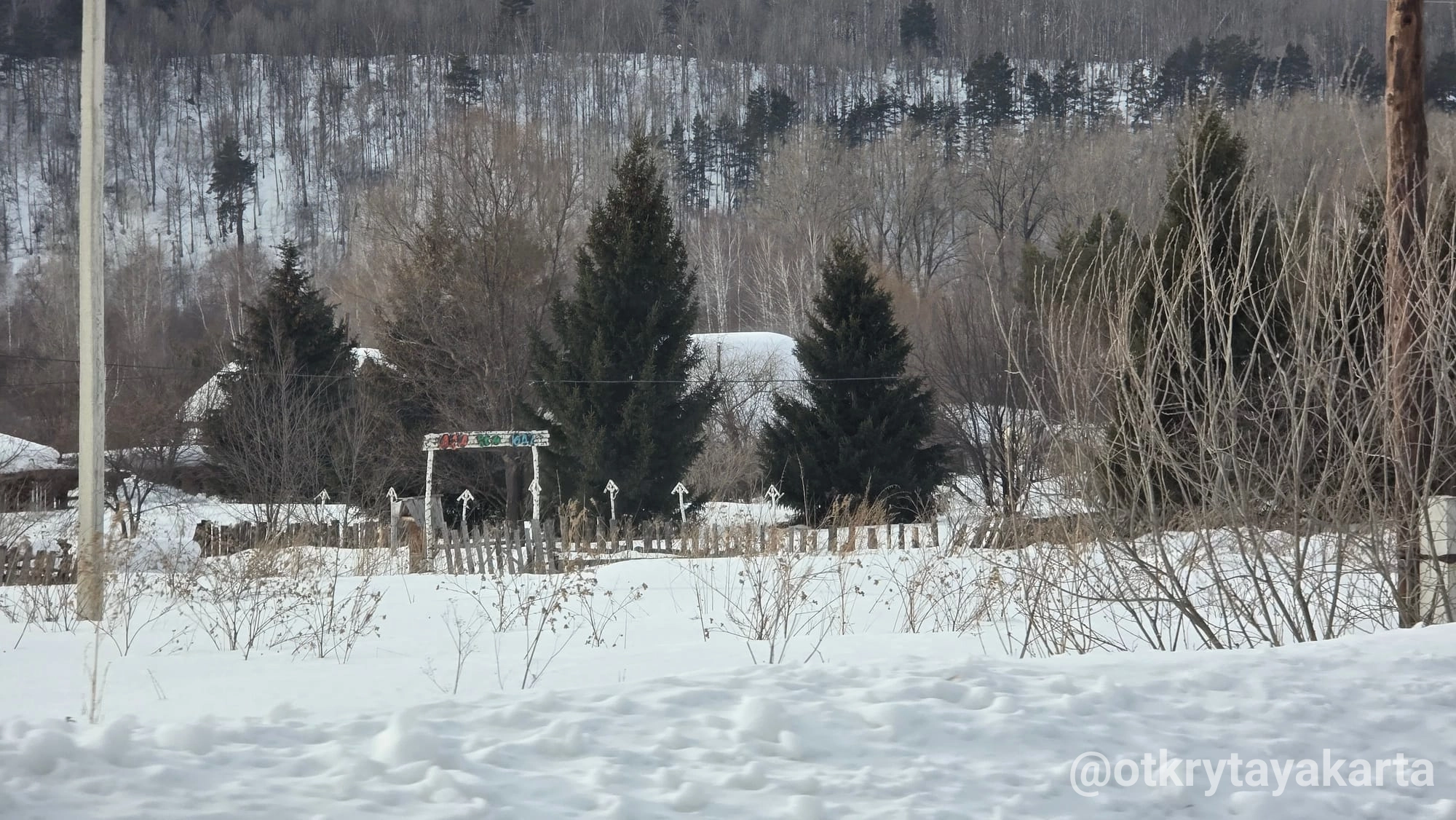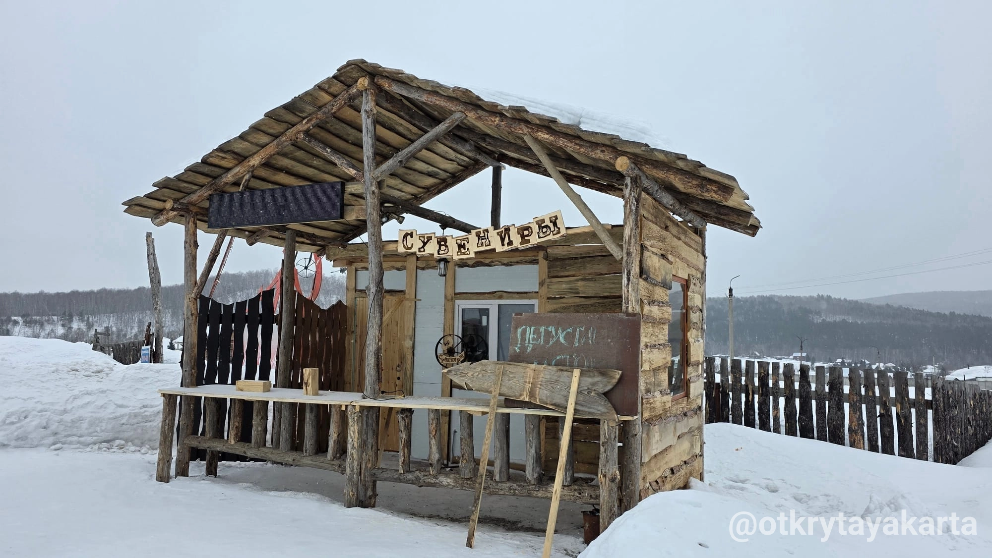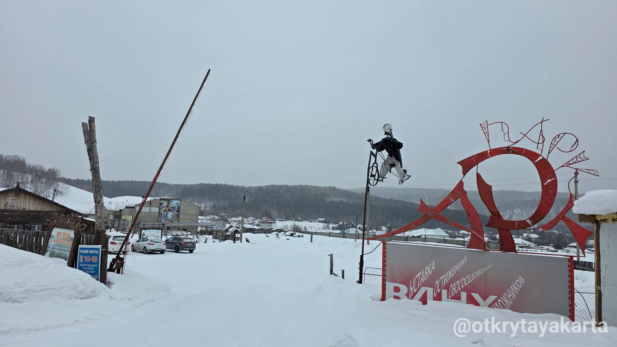 По пути домой проезжали музей. Или арт-парк, если по-новому В нём мы уже были в прошлом году, упоминала в тг-канале. Поэтому только вход посмотрели и поехали дальше. Каменистая степь скрыта под снегом, пещера тоже. Тропинки никакой на гору не было, чтоб на деревню с высоты посмотреть.