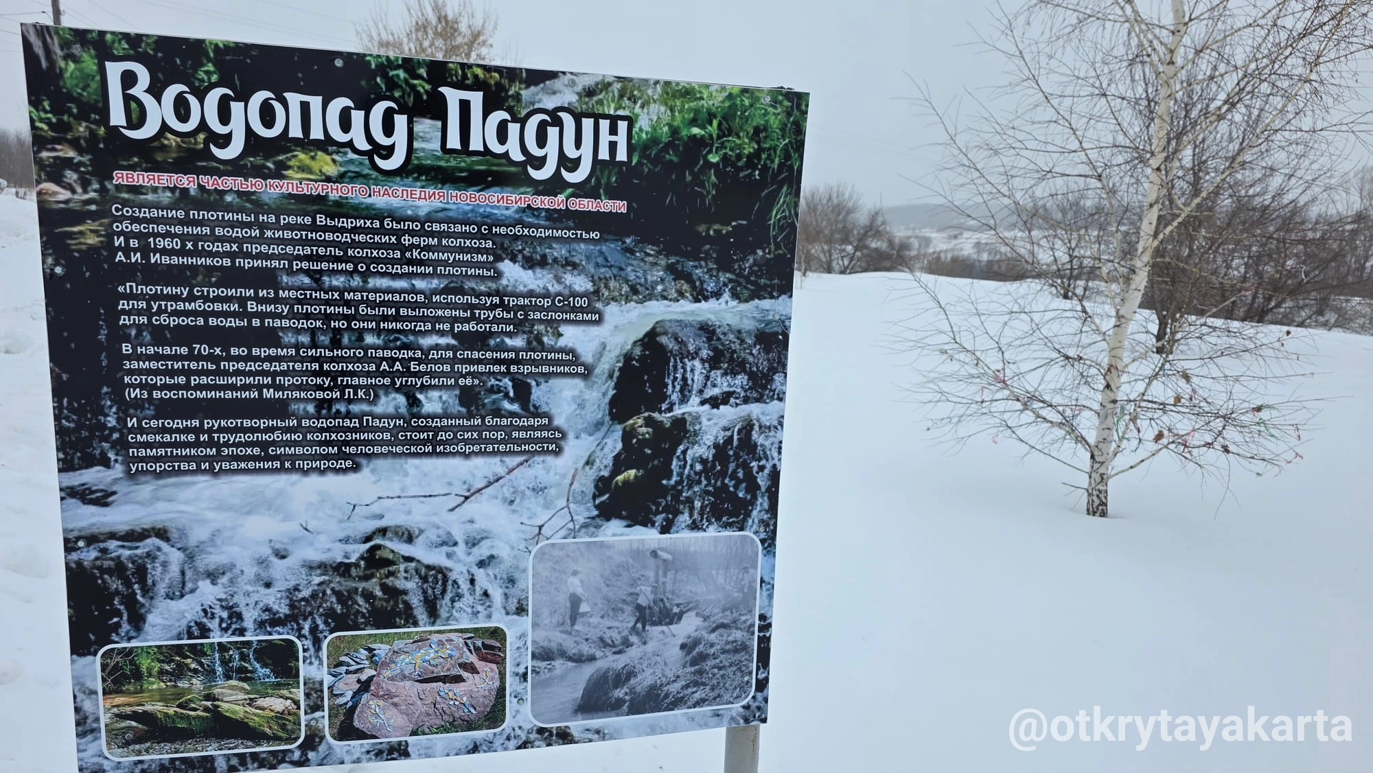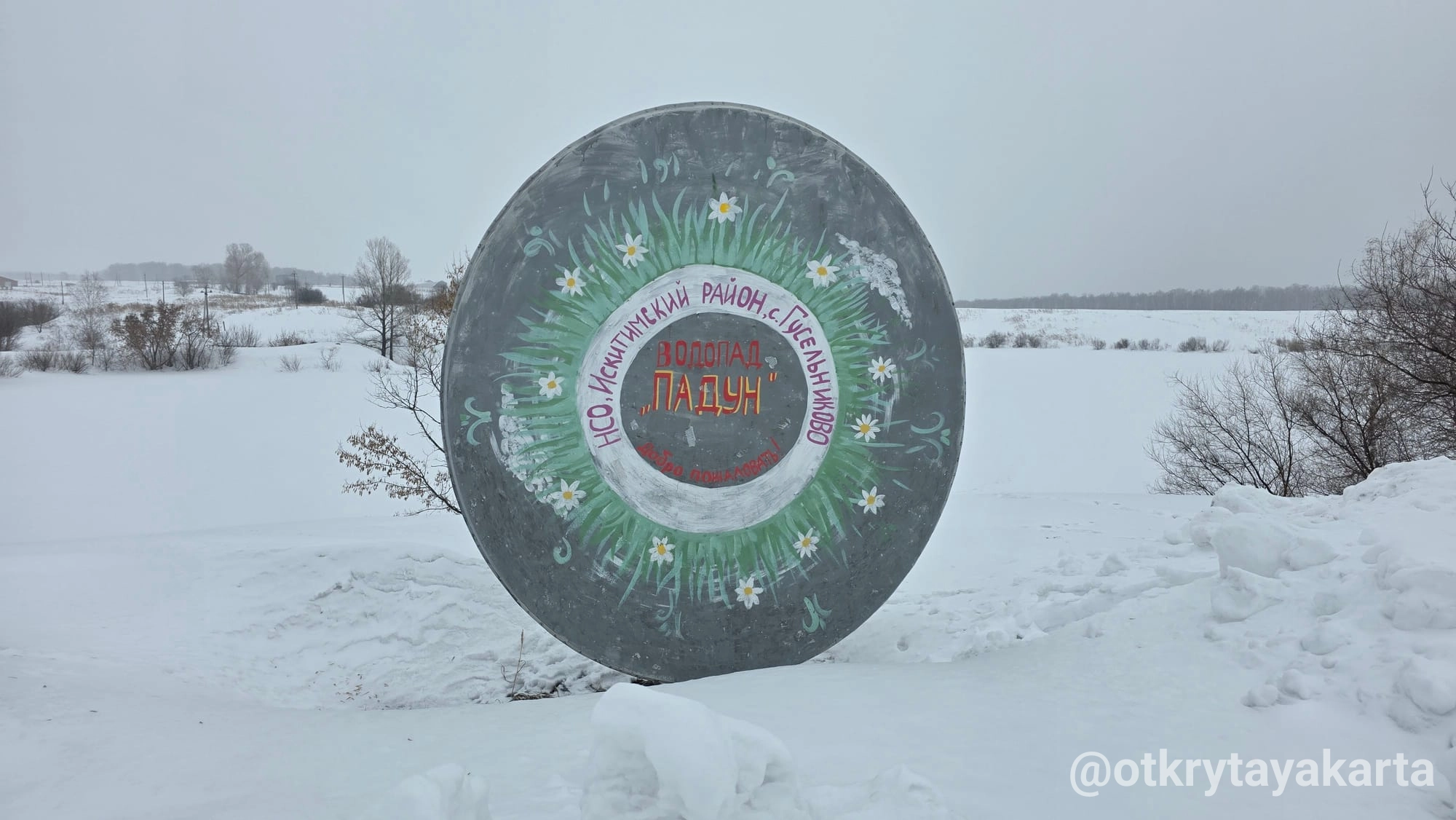 Следующая остановка: Гусельниково, водопад Падун. Про него коротко упоминала в тг. Посещать водопад удобно, дорога до самого озера. Парковка возле спутниковой тарелки — арт-объекта. Когда снег, тропинку надо поискать, она всегда есть. В нашем случае была немного дальше парковки. К Падуну круглый год возят организованные группы туристов, это одна из обязательных точек на маршруте. Поэтому протоптали неплохо.