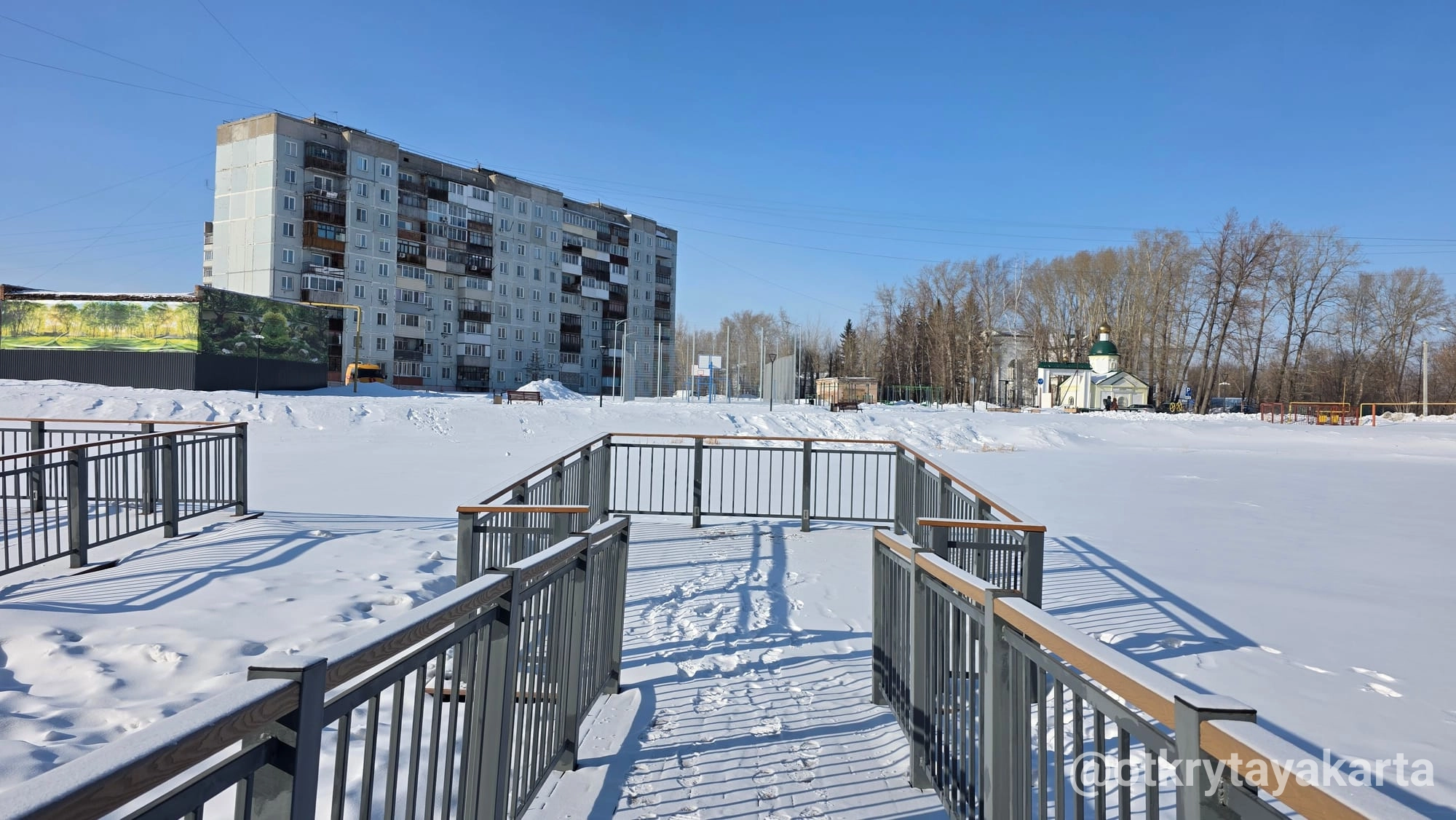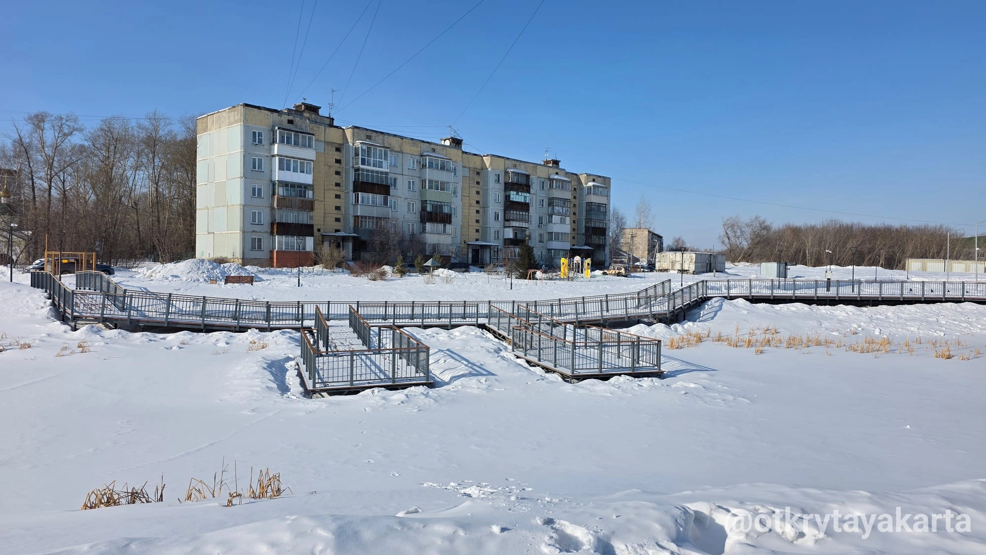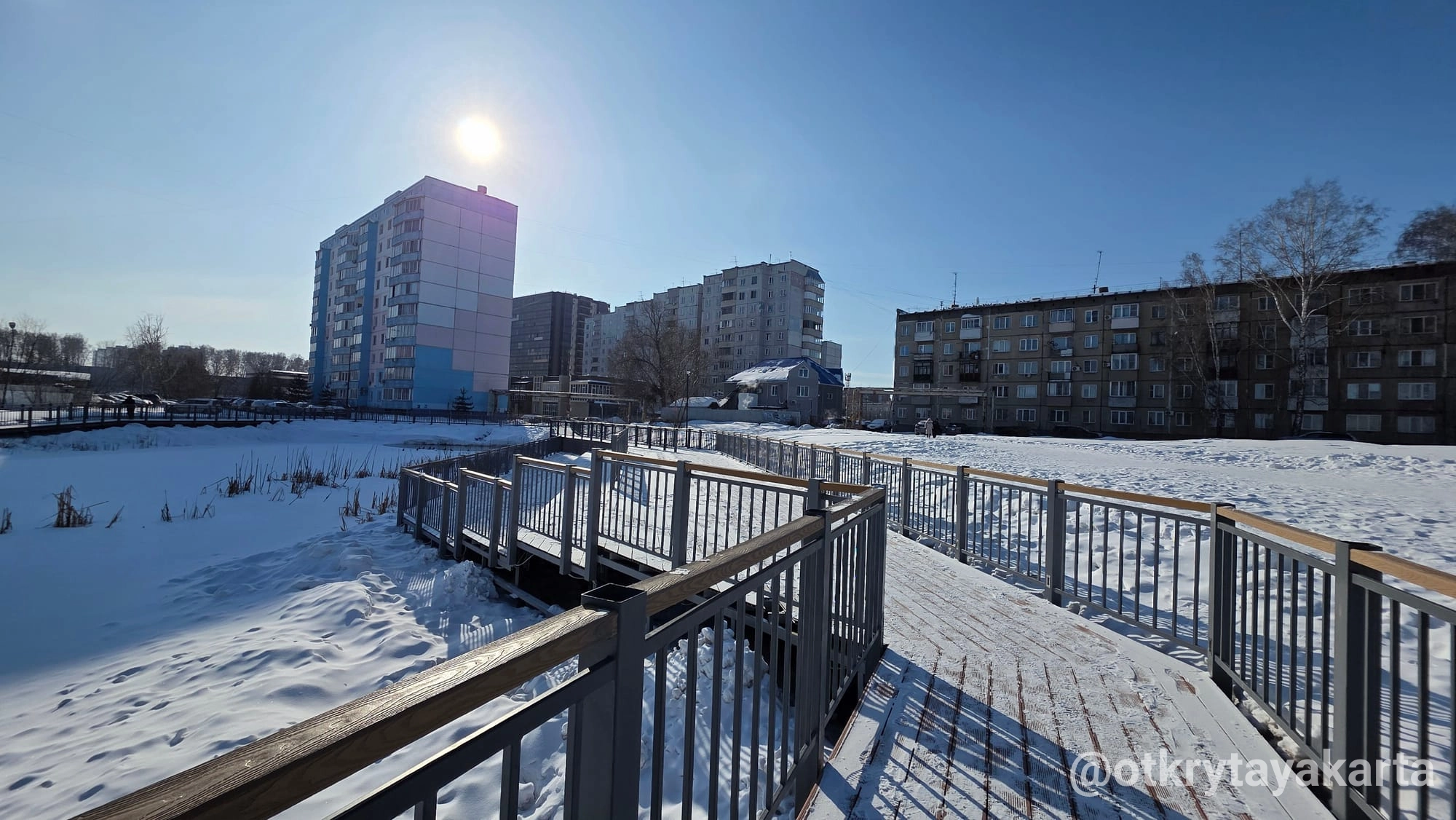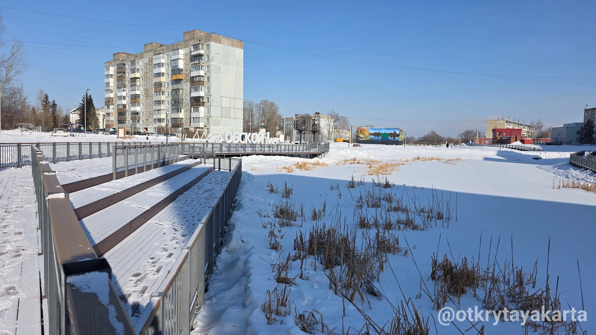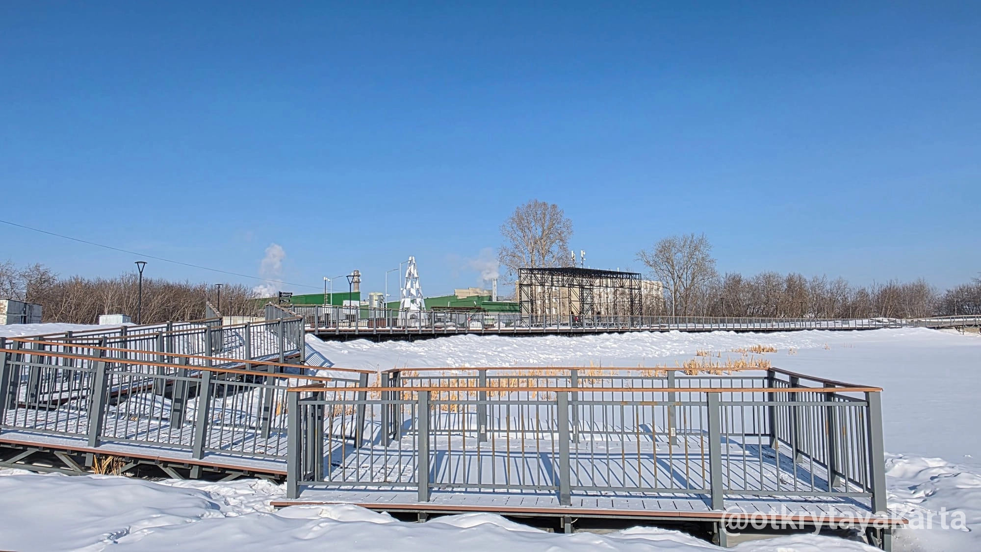 Теперь это современный парк с понтонами для рыбаков, домиками для уток, амфитеатром и световой стелой. Зимой стела становится главной ёлкой, весной превращается в ракету.