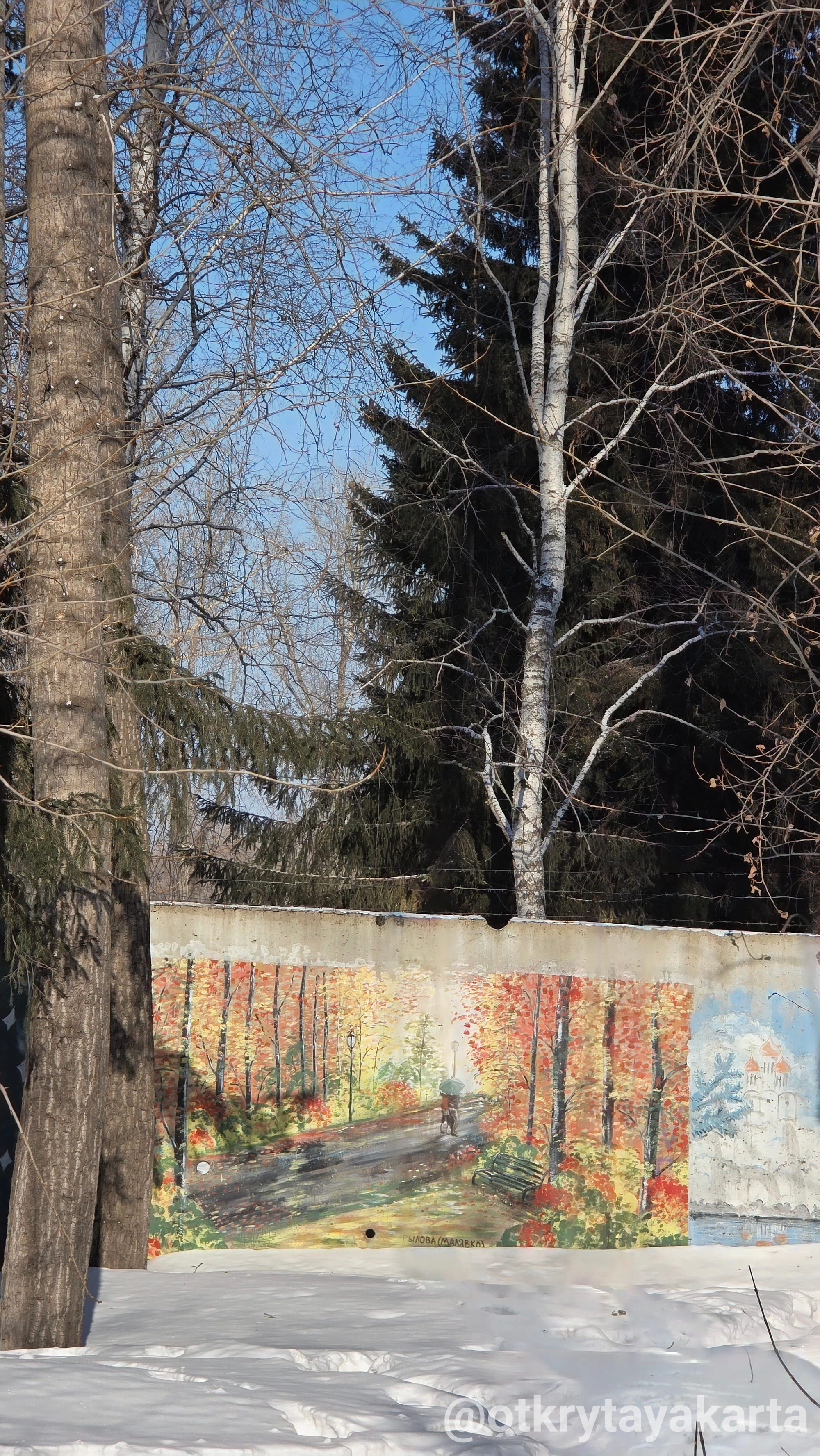 Сквер граничит с воинской частью. Забор части расписан разными картинками и сюжетами. А над забором возвышается, как в музее, разная военная техника.