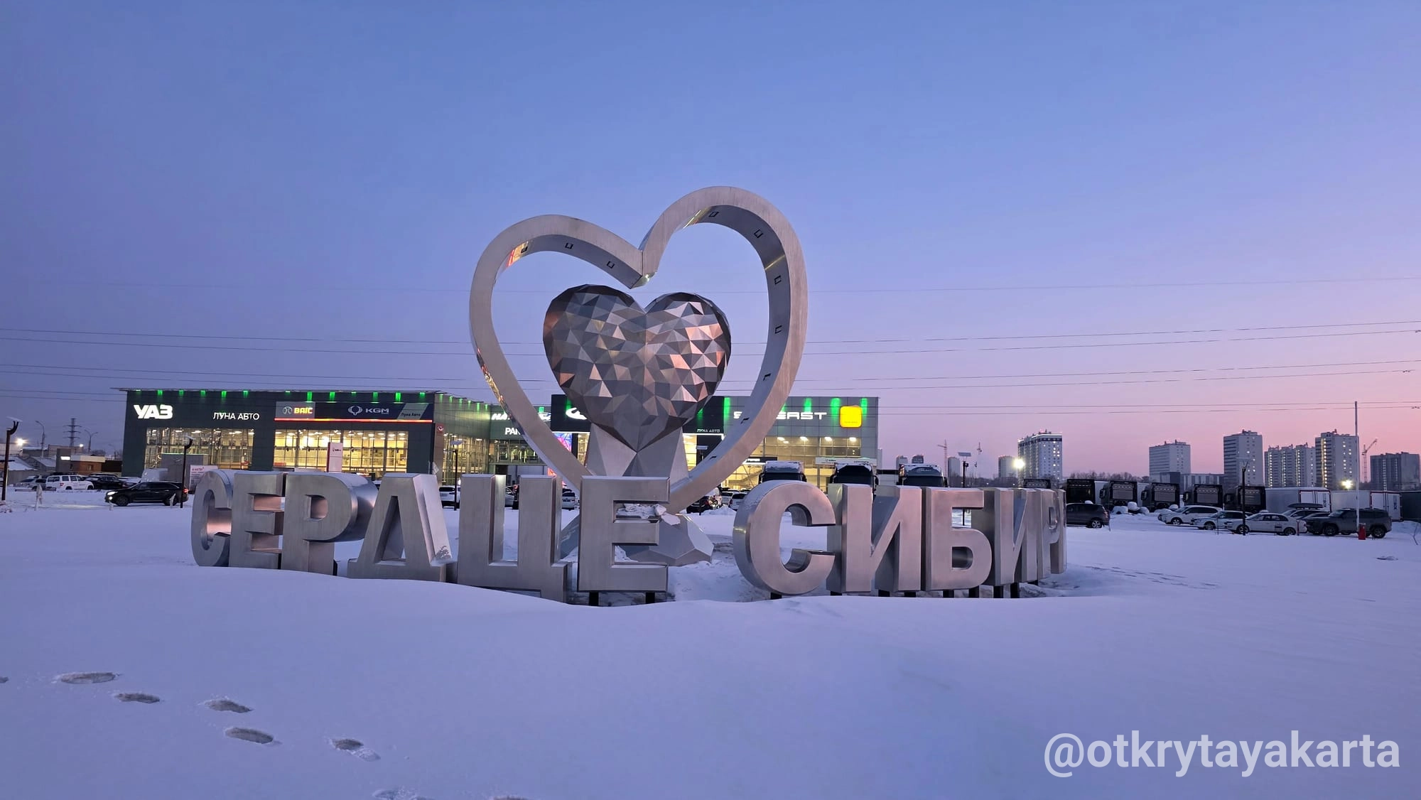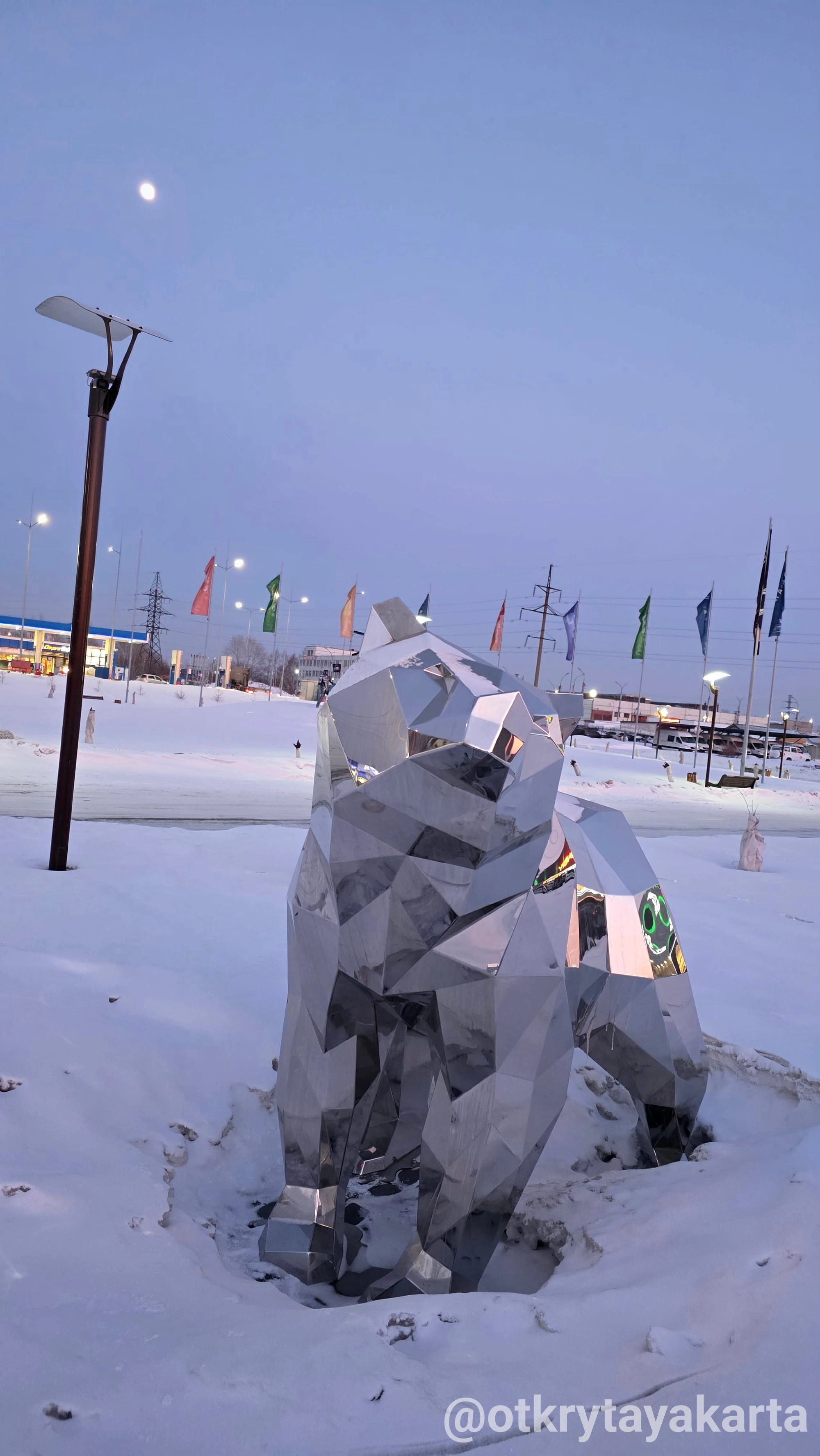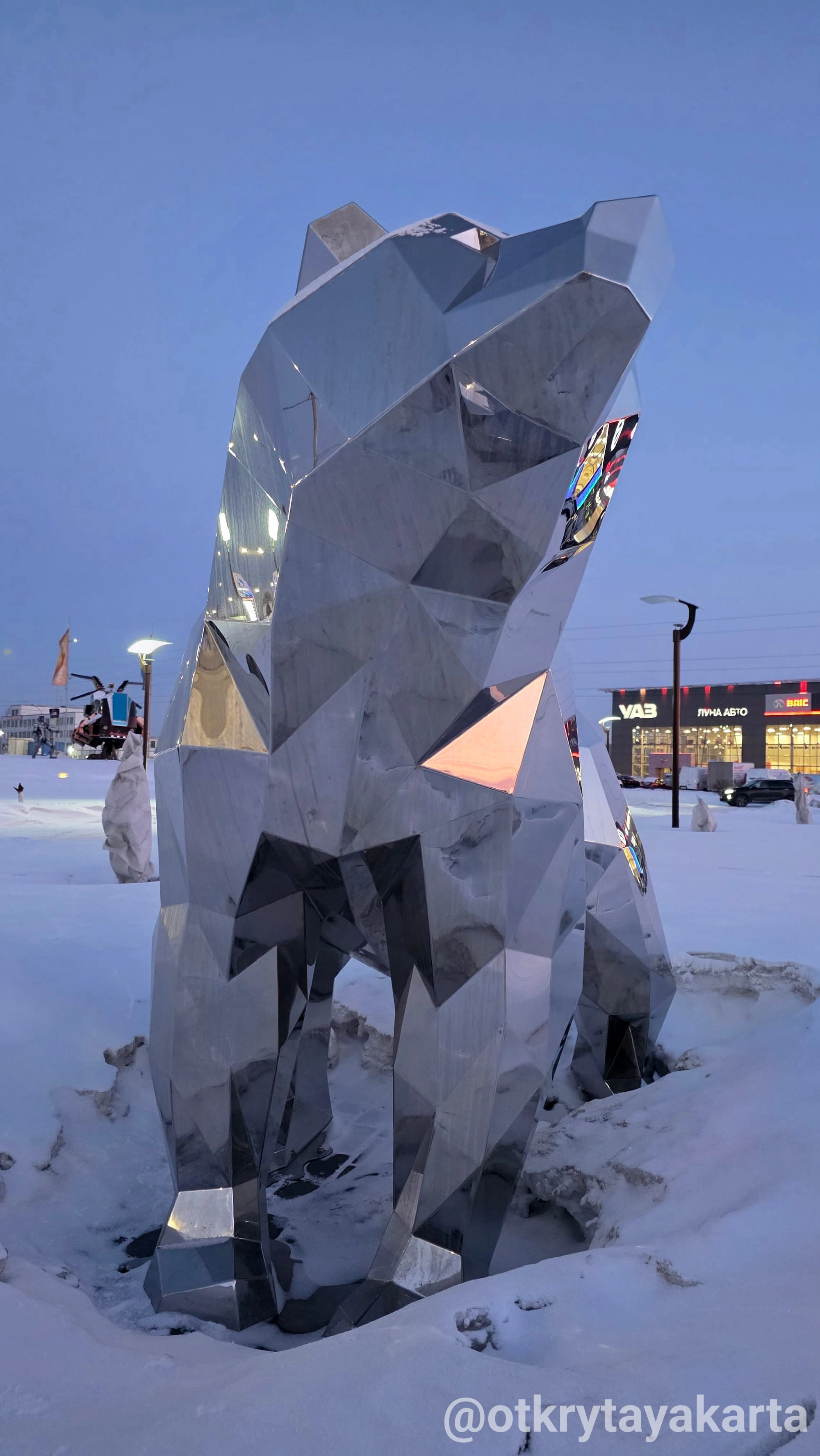 - Стелла «Сердце Сибири» – огромная хромированная конструкция в стиле полигональной архитектуры, окружённая фигурами медведей и оленей.