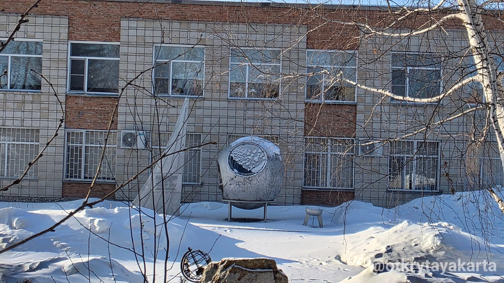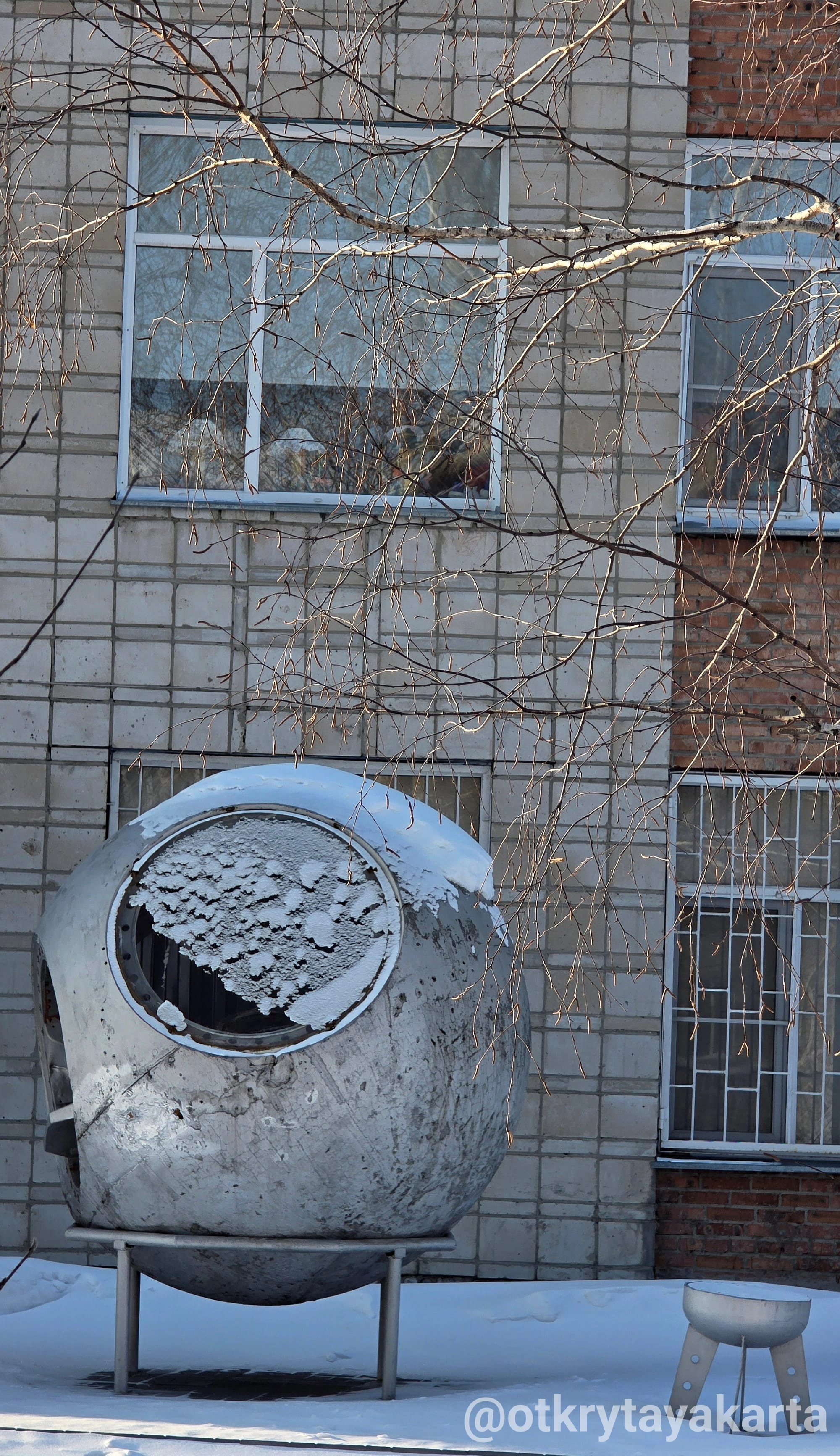 Под открытым небом возле краеведческого музея стоят два символа космической эры: стела с ракетой и главная гордость — настоящая спускаемая капсула космического корабля.