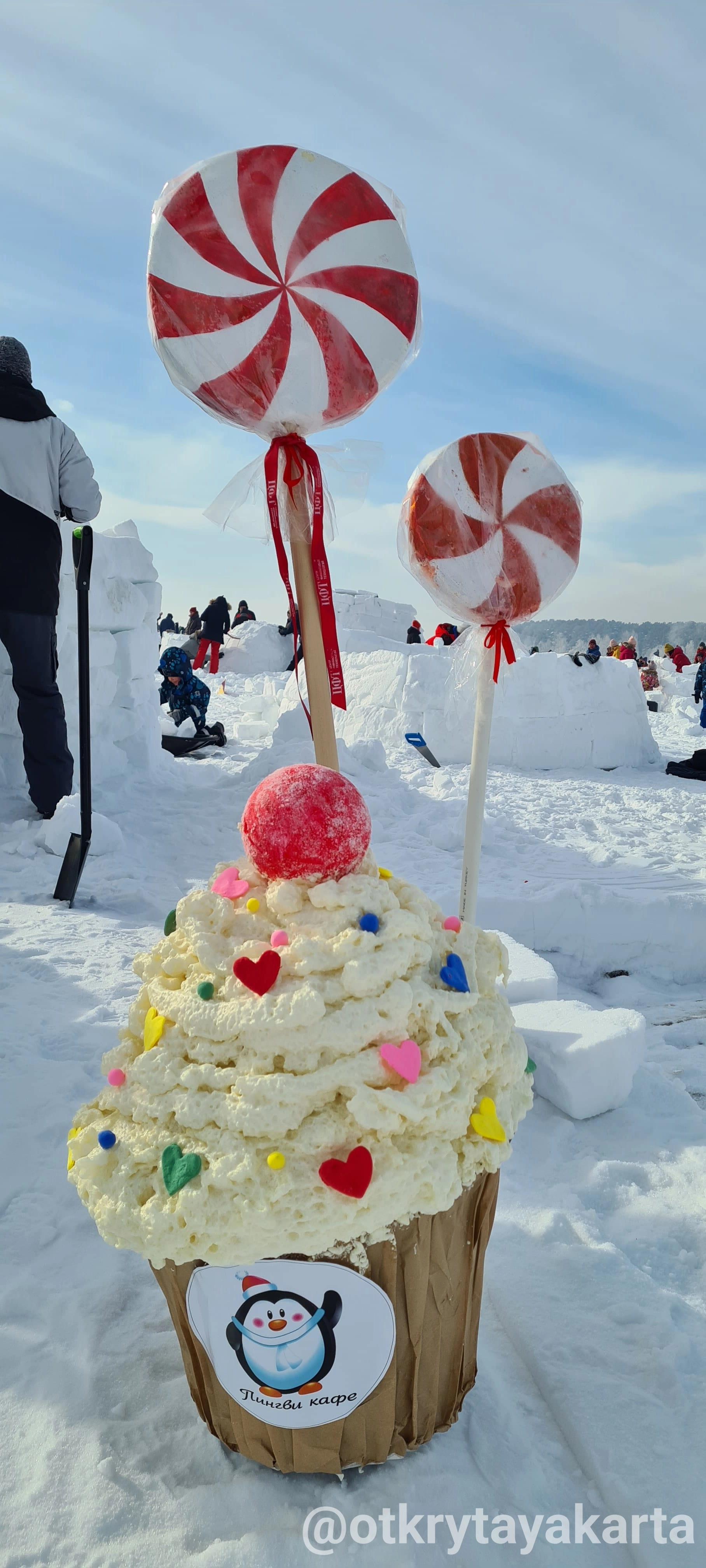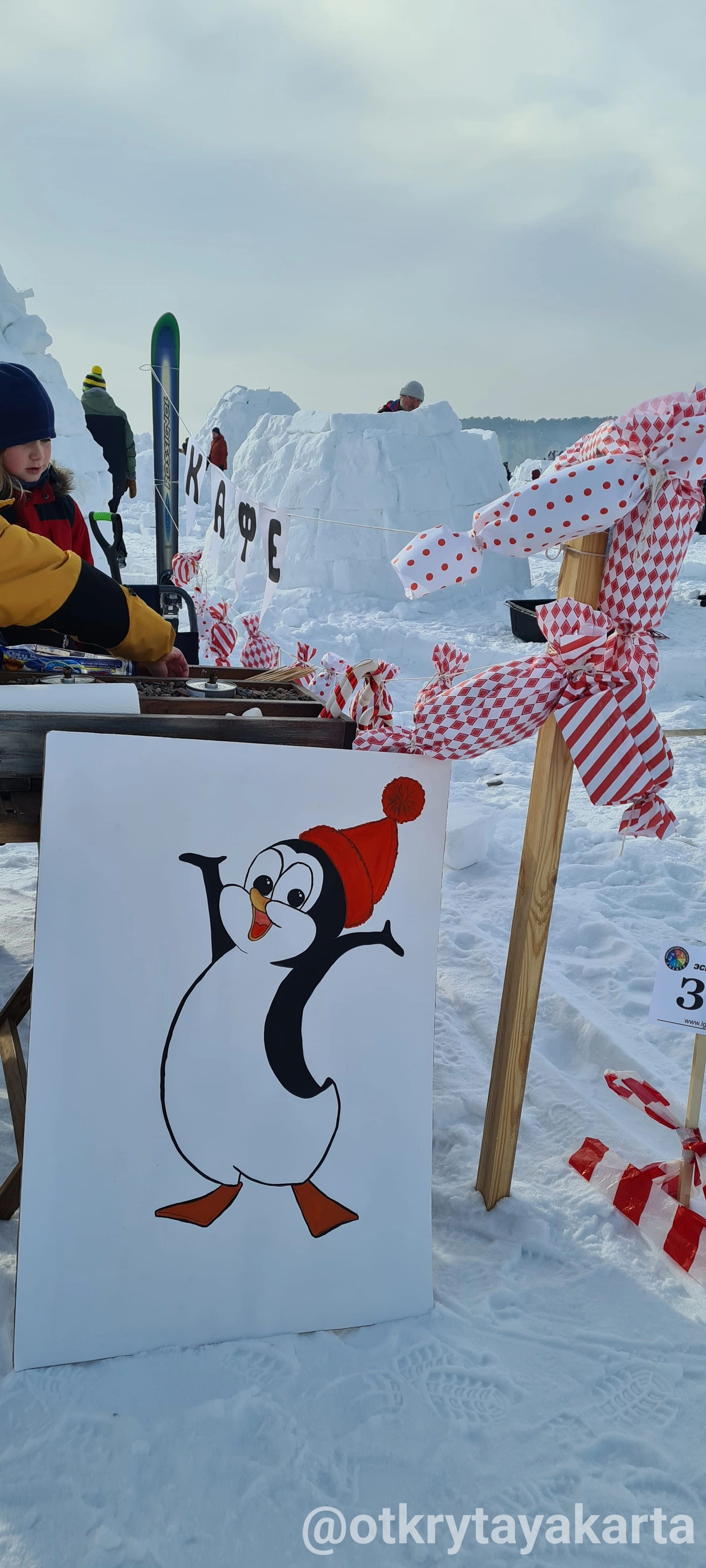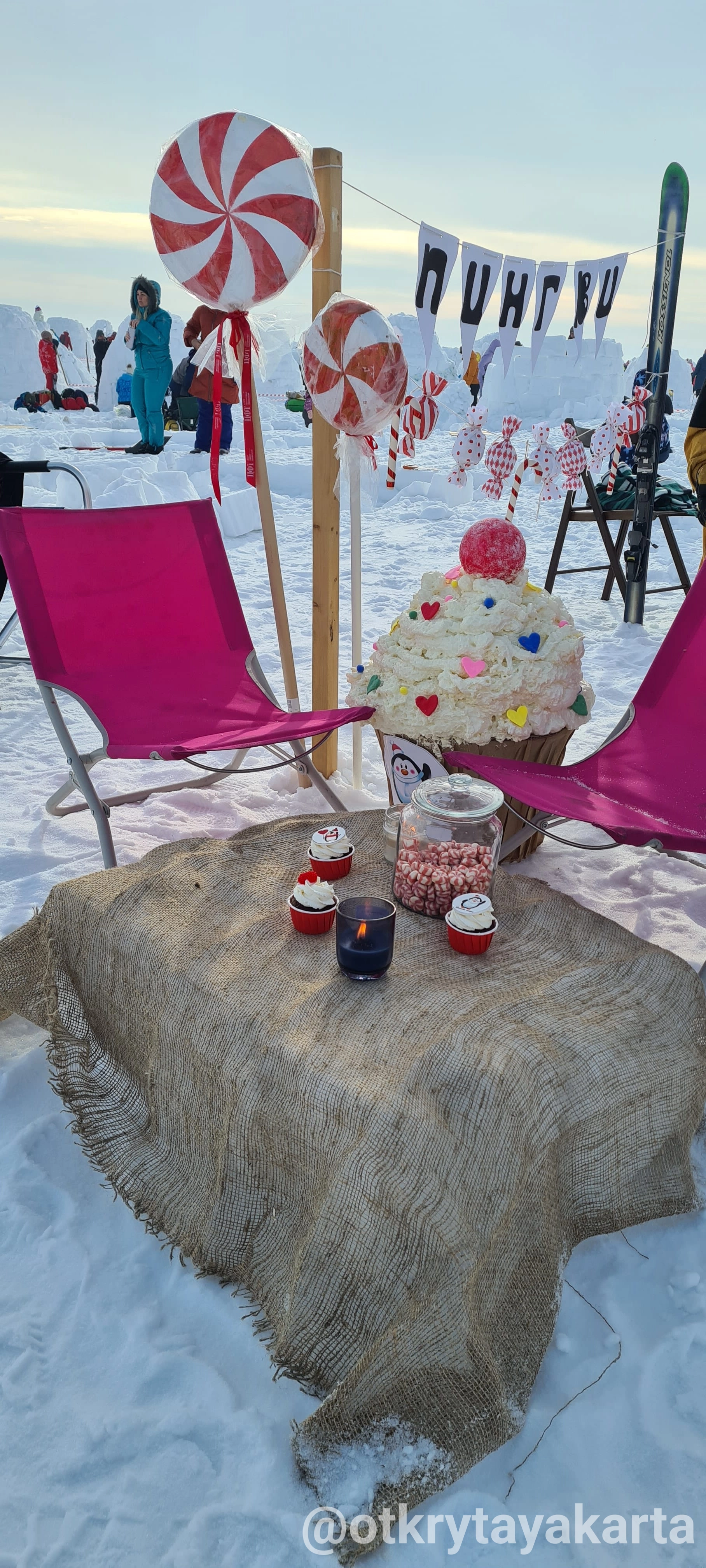 У наго иглу обвалилась крыша (зато небо видно, красиво) и никакое место мы не заняли. Зато у нас были самые красивые и вкусные соседи - кафе Пингви. Они прикольно строили своё иглу и все вокруг с замиранием следили, как ребята пирожное-купол устанавливают.
