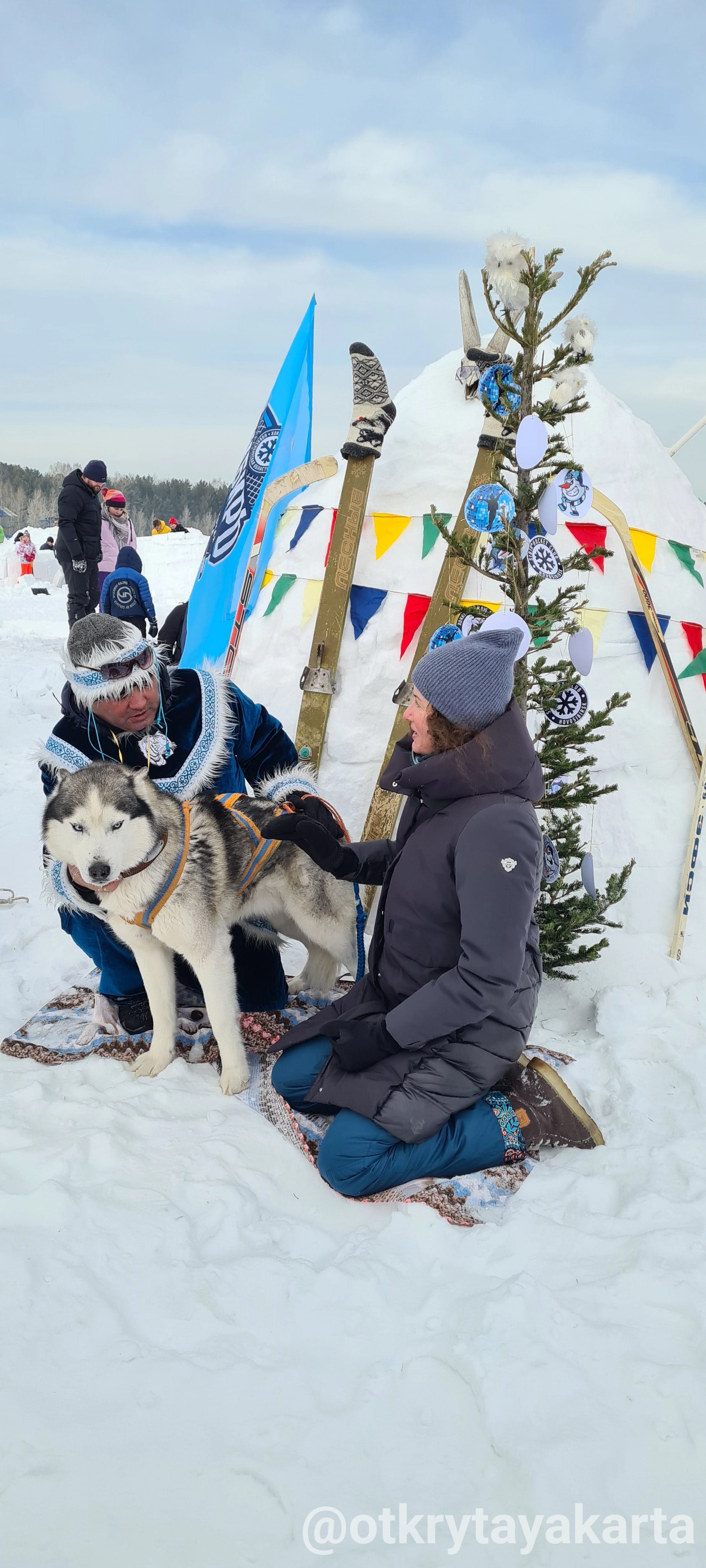 А кто-то оформлял своими фотоработами домик, в украшениях попадались валенки деревянные лыжи. Оригинальное решение с фотозоной, где главные персонажи: хозяин в национальном костюме и его сибирский хаски.