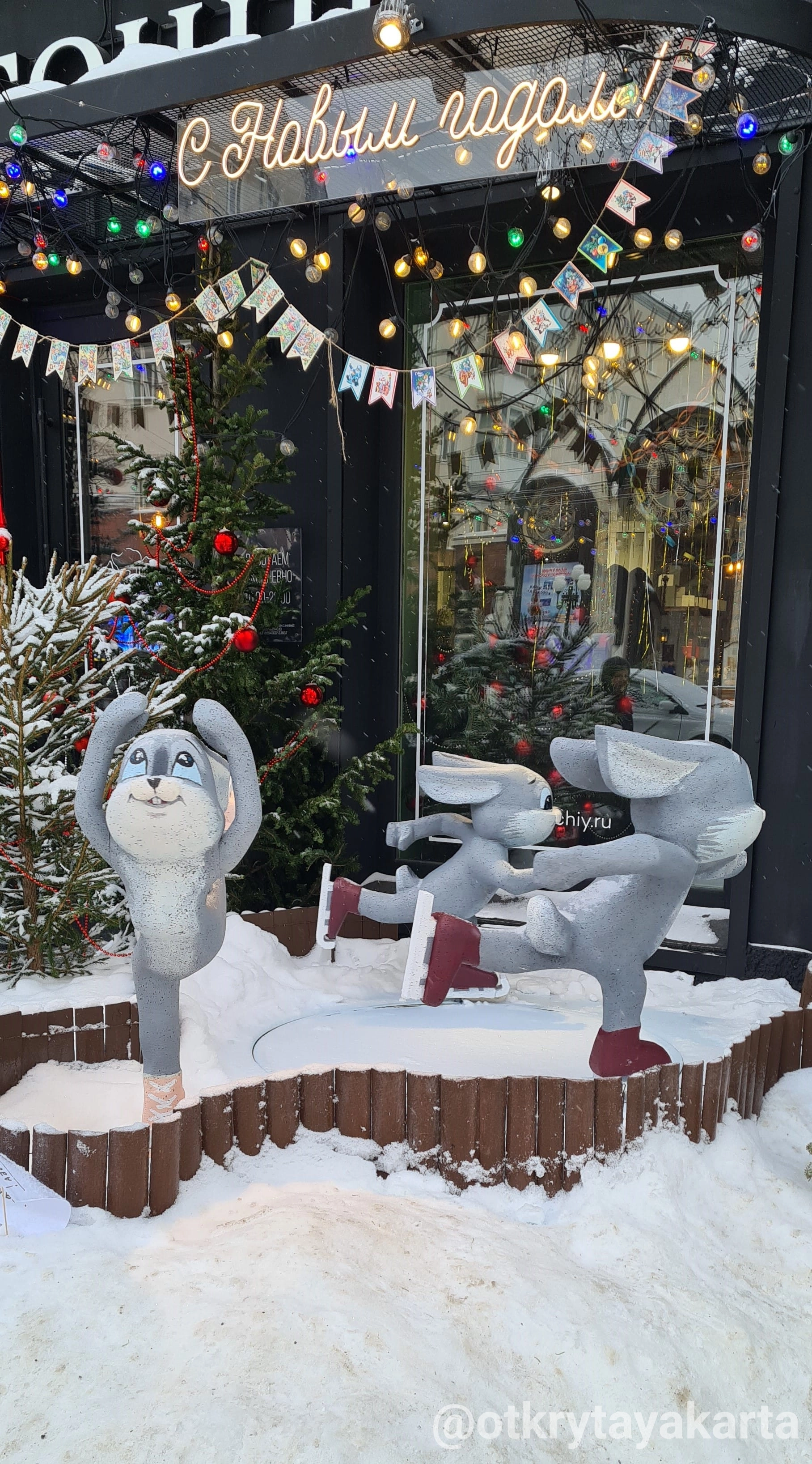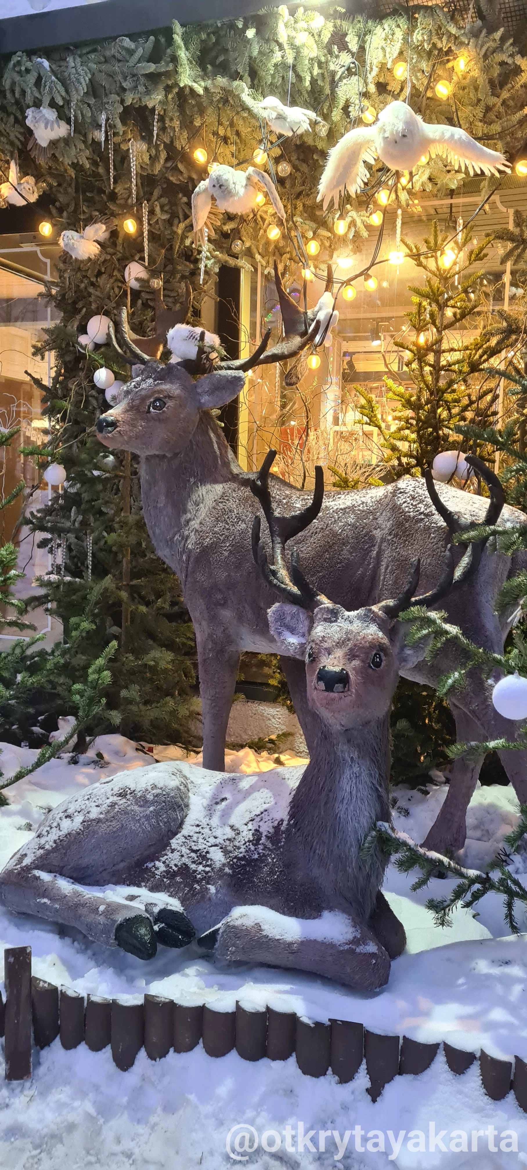 Пряничный Цветочный в декабре 2021, выступления зайцев-фигуристов в 2022, пара оленей в 2023 (они же в 2025 переместились к Коробку в Академе), волшебные часы в 2024