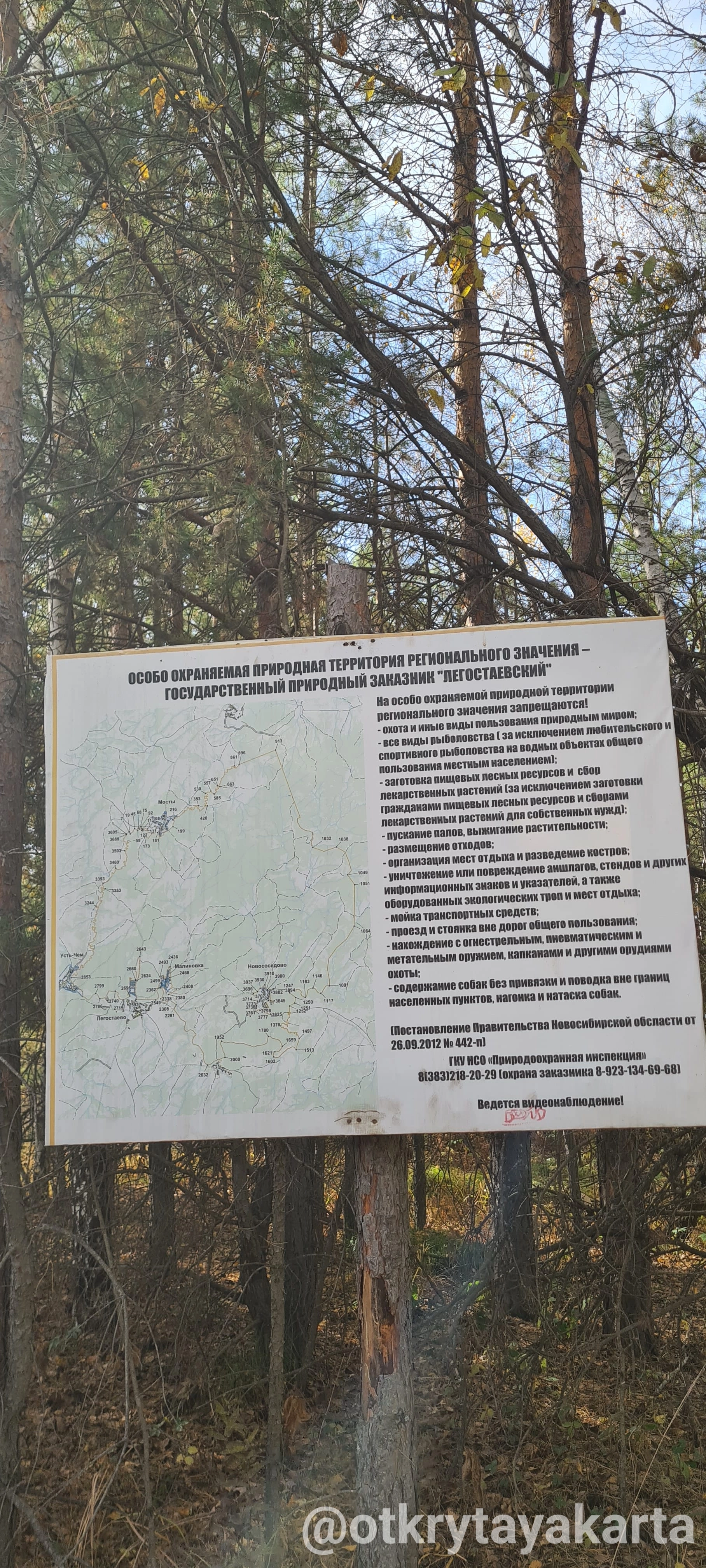 Маршрут: проезжаете Легостаево до конца, за мостом через Бердь поворачиваете направо на Новососедово. После Малиновки — ещё 4 км, и вот он, поворот в лес с указателями и информационным стендом.