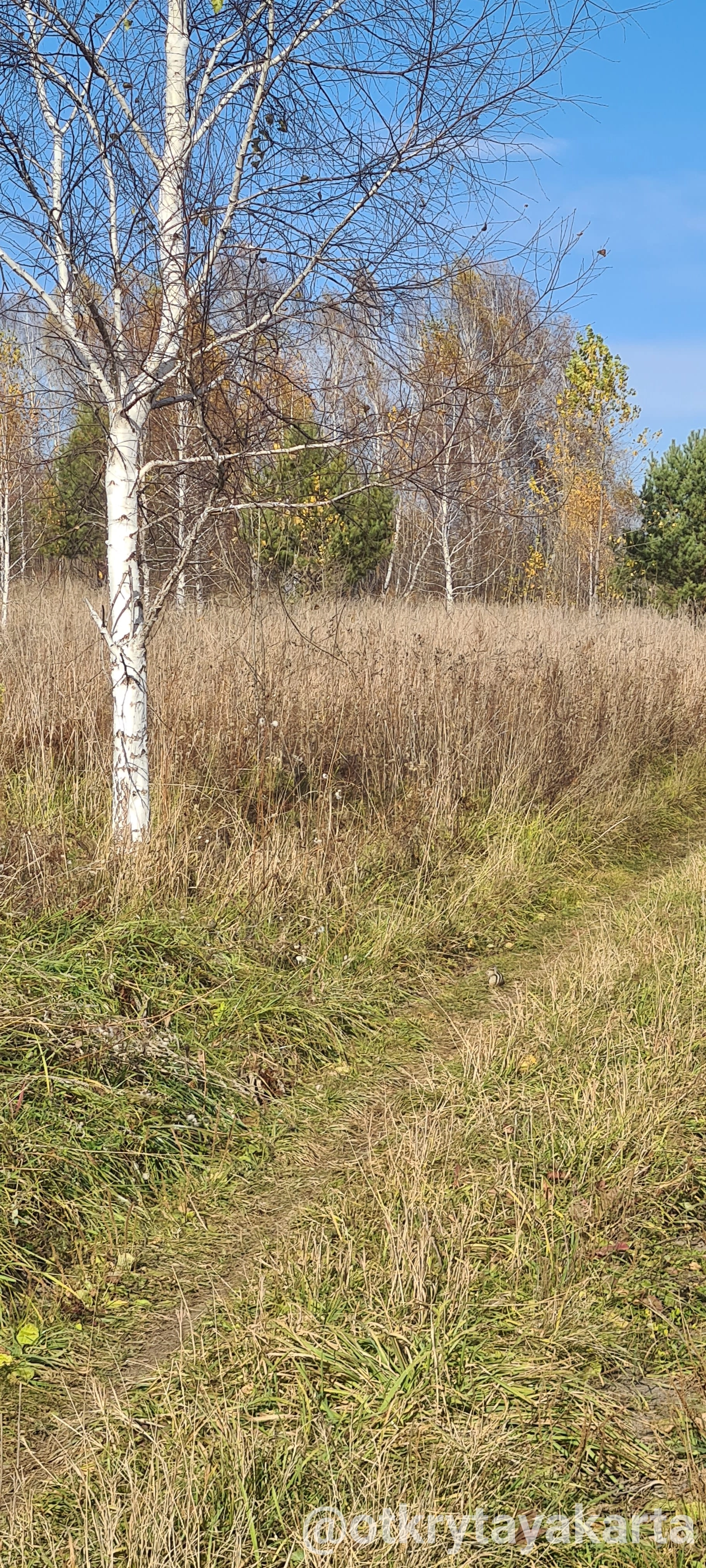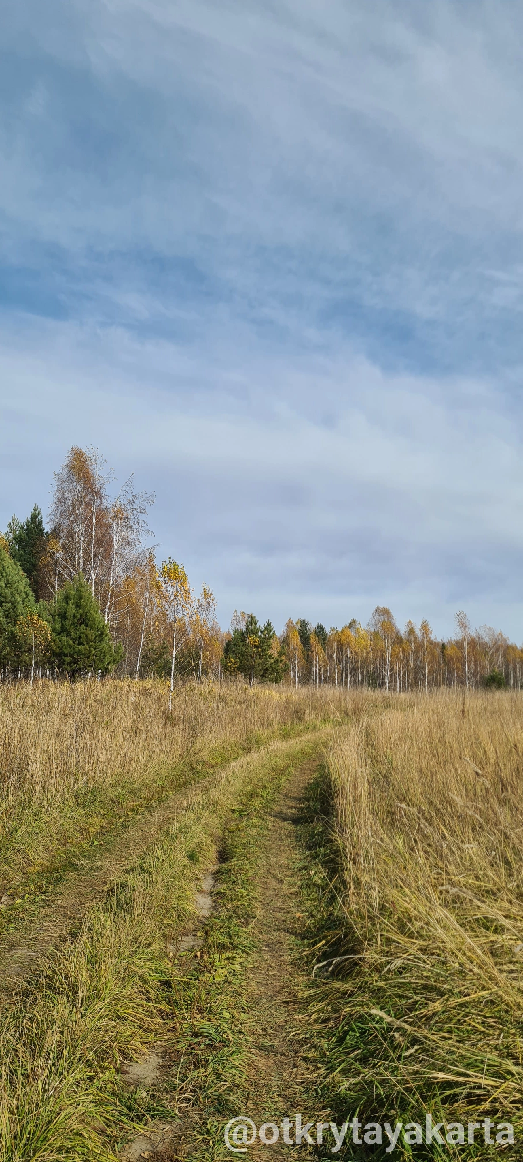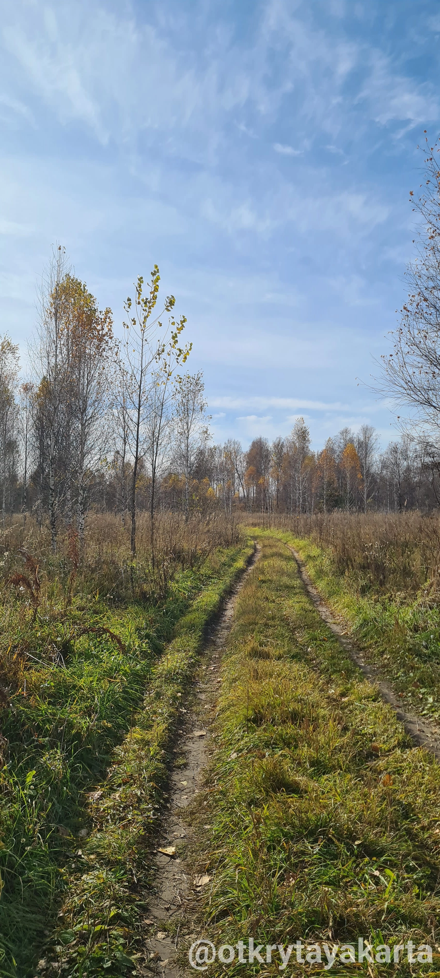 Тропа начинается от информационного щита. Идти нужно прямо по хорошей полевой дороге, никуда не сворачивая, даже если кажется, что вы «в чистом поле». Маршрут совпадает с началом экотропы «Зверобой», но здесь дорога ровная, без крутых подъёмов — идти намного проще.