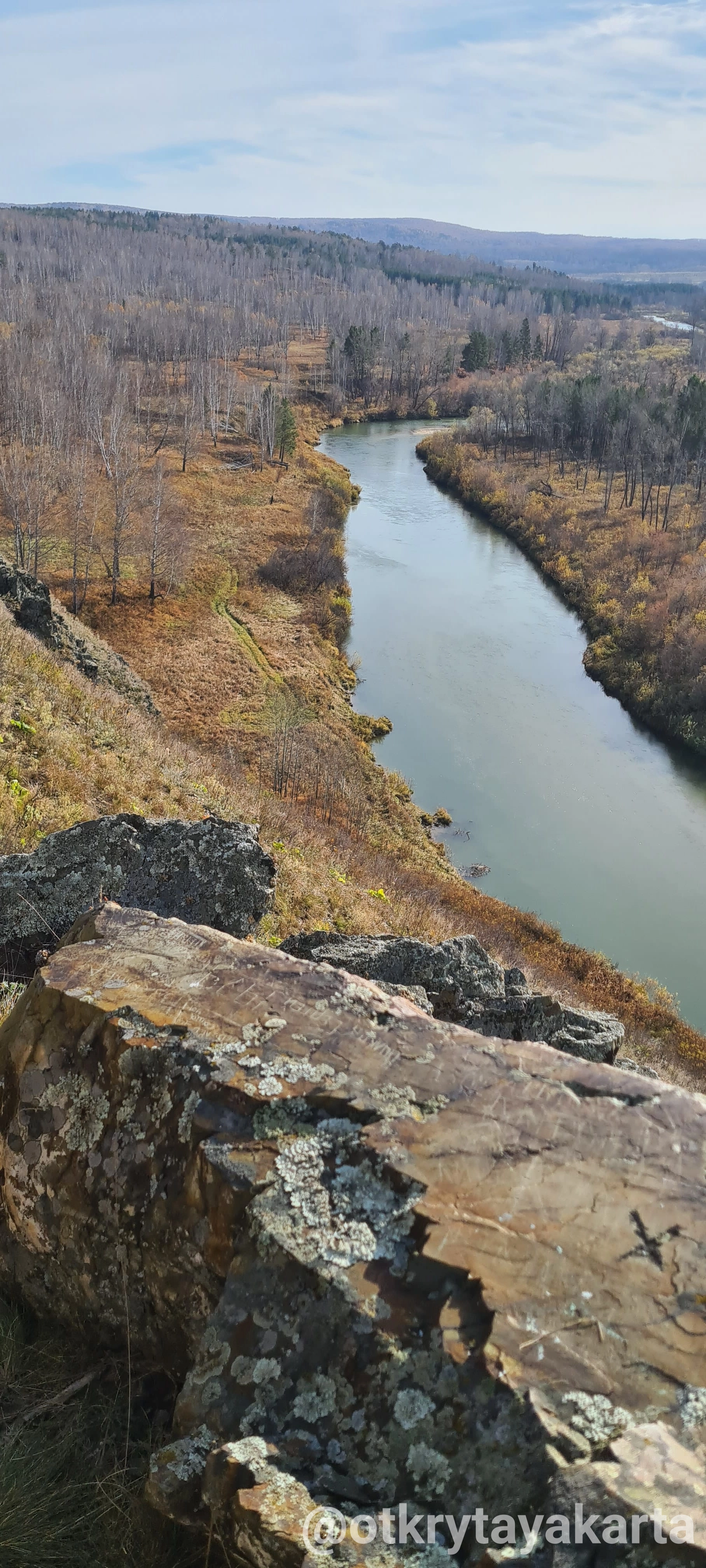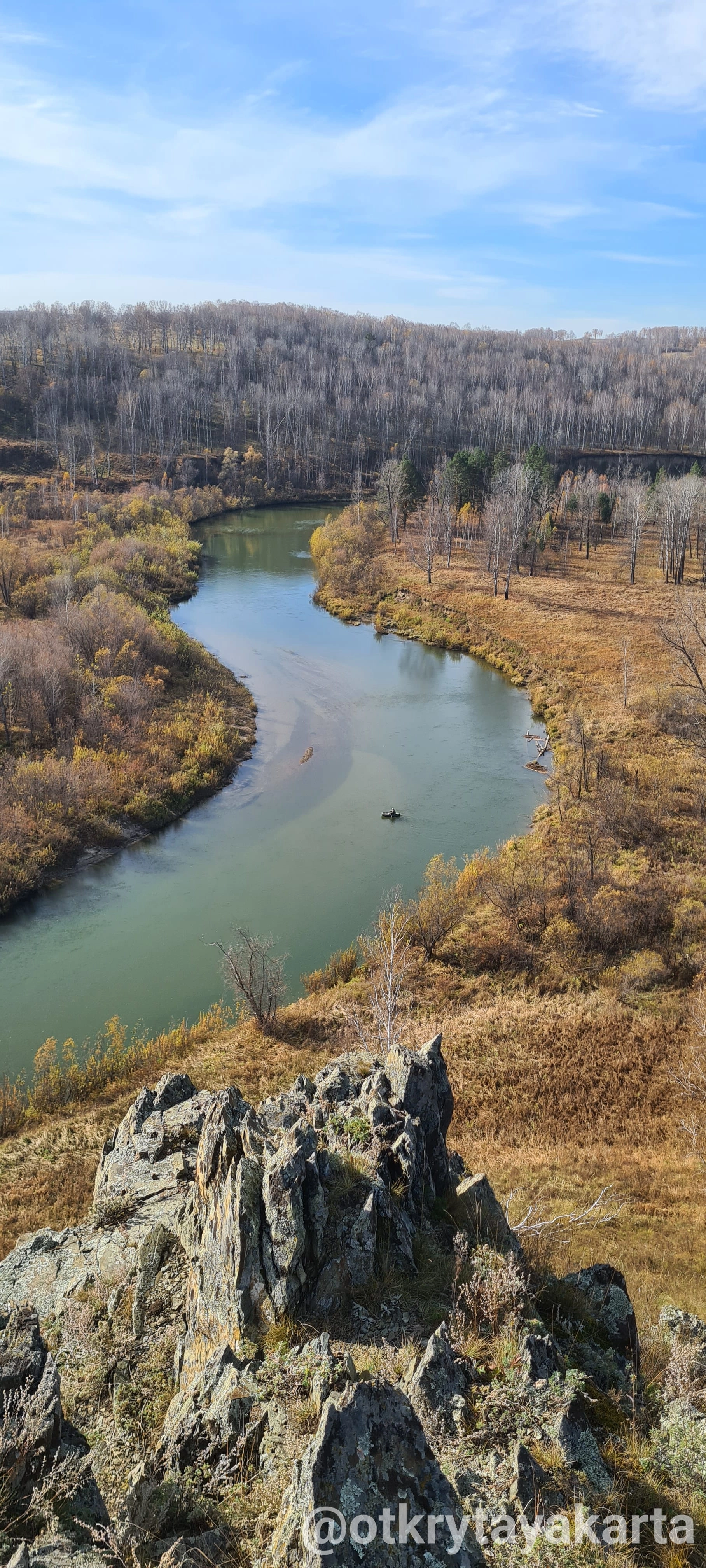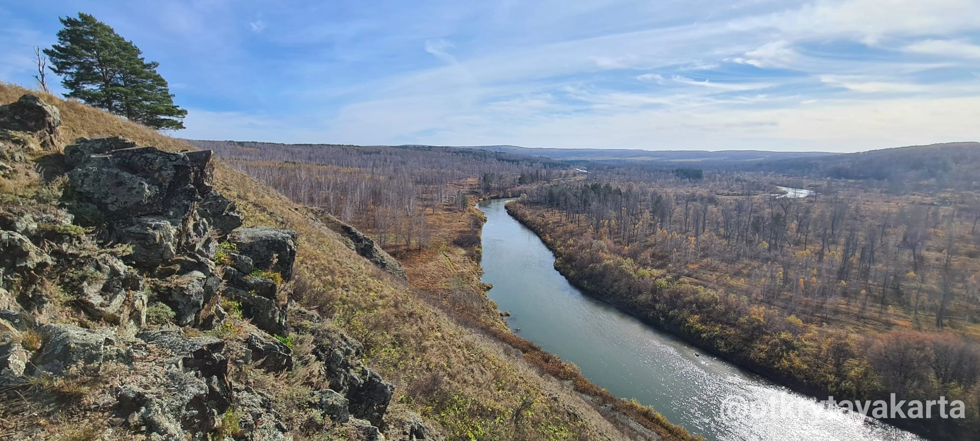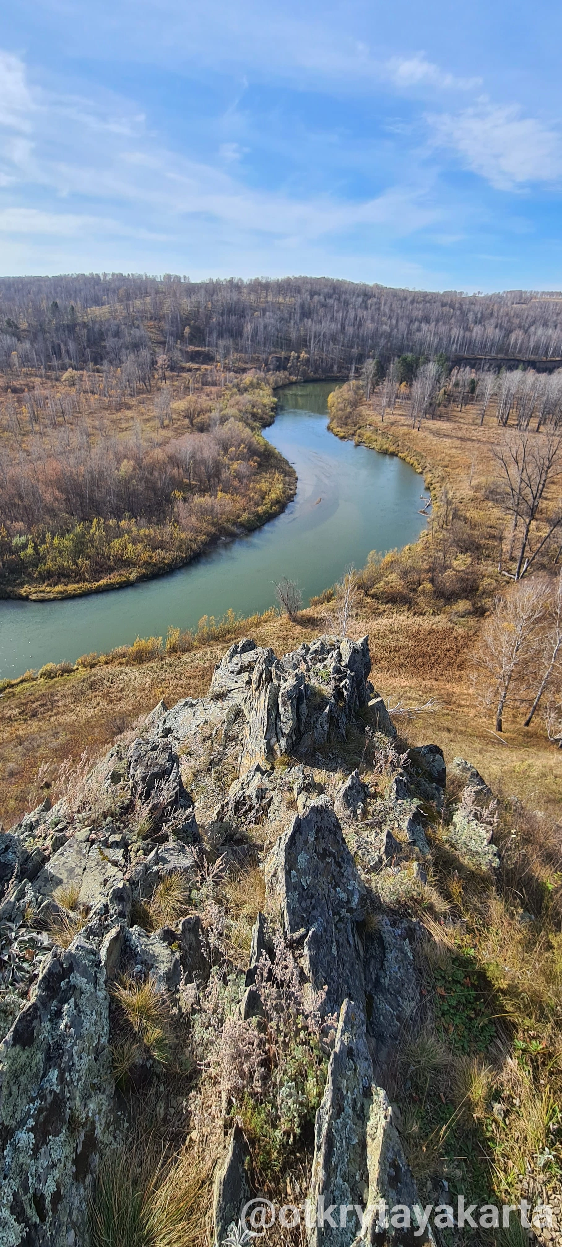 Лучшая точка для фото — единственный камень с плоским верхом, отполированный до блеска тысячами туристов. С него получаются самые эффектные кадры: вы словно стоите на краю земли, а внизу петляет Бердь и уходит вдаль сибирская тайга.