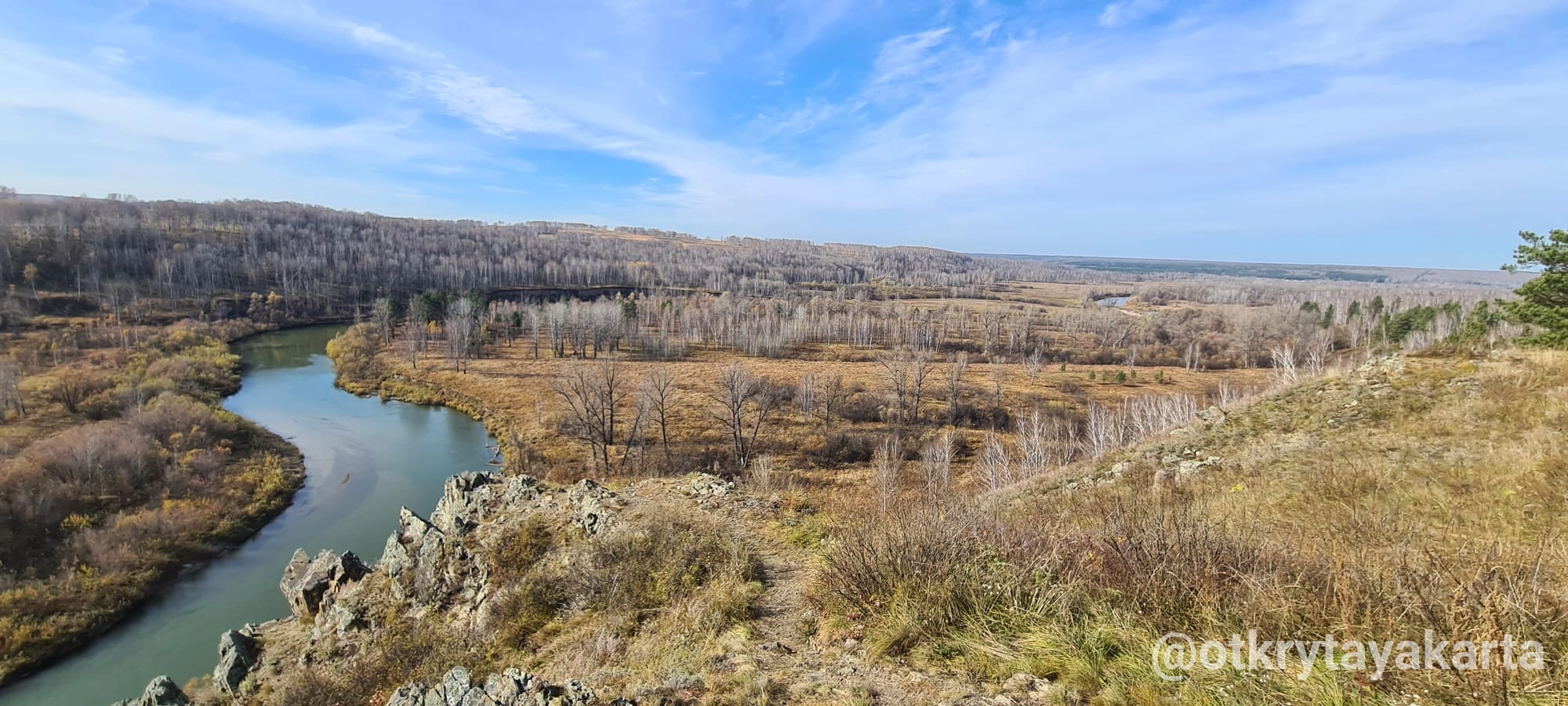 С вершины скалы река Бердь видна гораздо шире, чем со смотровой площадки «Зверобой». Сравнивать эти два места бессмысленно — они совершенно разные. Здесь нет деревянных настилов и скамеек (благоустройство отсутствует), но именно это дарит ощущение дикой, нетронутой природы.