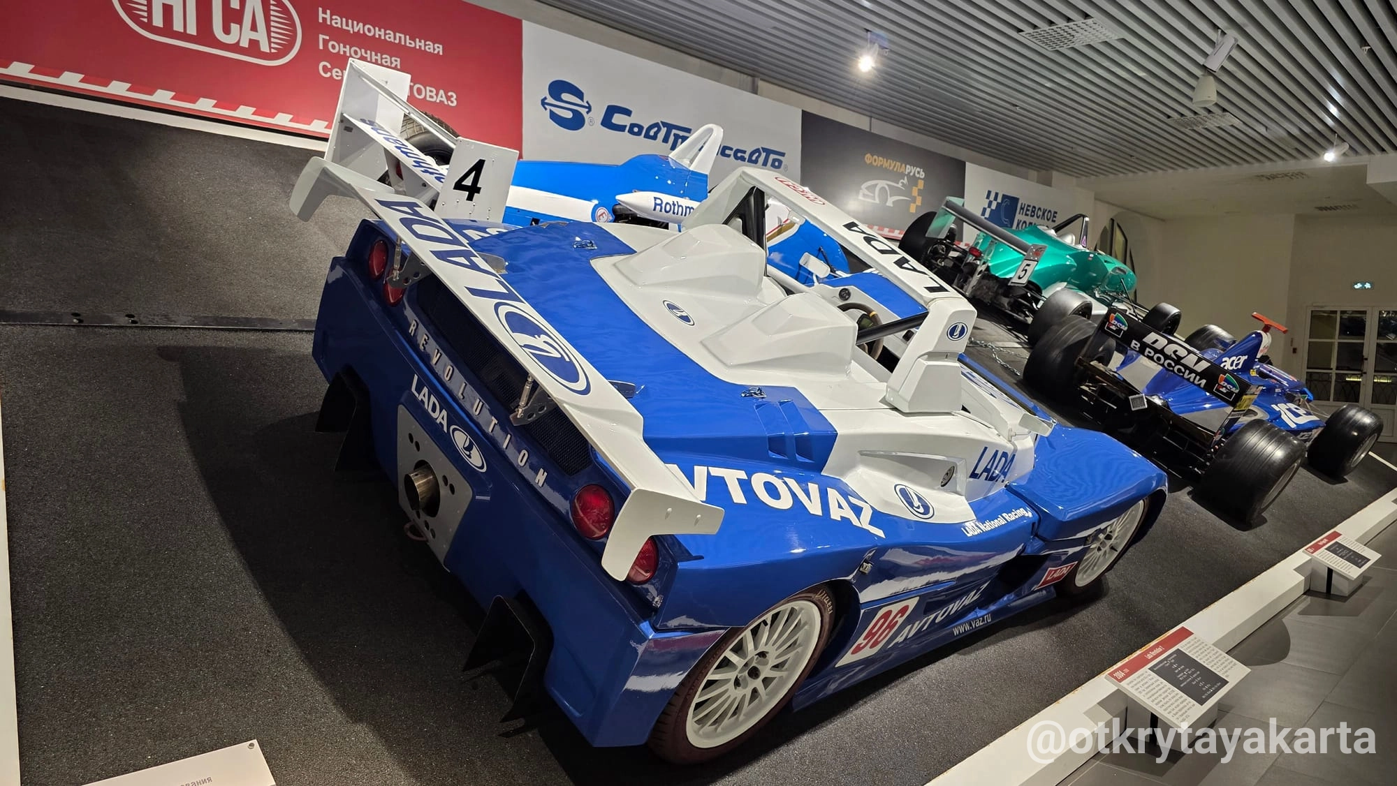 Отдельного внимания в экспозиции заслуживает яркий спортпрототип LADA Revolution — смелый проект АвтоВАЗа начала 2000-х, попытка создать настоящий гоночный автомобиль с российскими корнями.