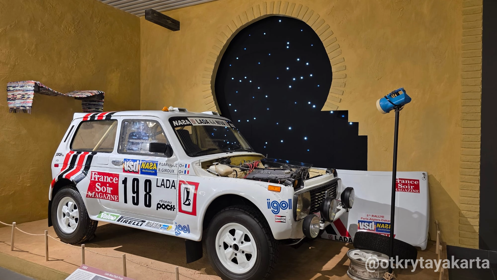К «Дакару-86» подготовились серьезнее. Под капотом появились форсированные моторы ROC мощностью 310 лошадиных сил — почти в пять раз больше, чем у серийной Нивы. Кузовные панели остались родными только внешне: на самом деле это были облегченные и усиленные прототипы, способные выдержать тысячи километров африканского бездорожья.