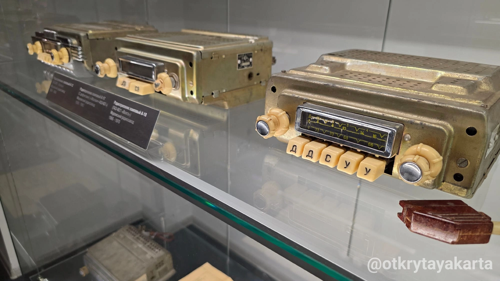 Кстати, за «моргуновкой» стеллажи с автомагнитолами разных эпох. На фото продукция Муромского радиозавода. А-12 для Волги, А-17 для Москвича 403/407 и А-18 для тоже Волги.