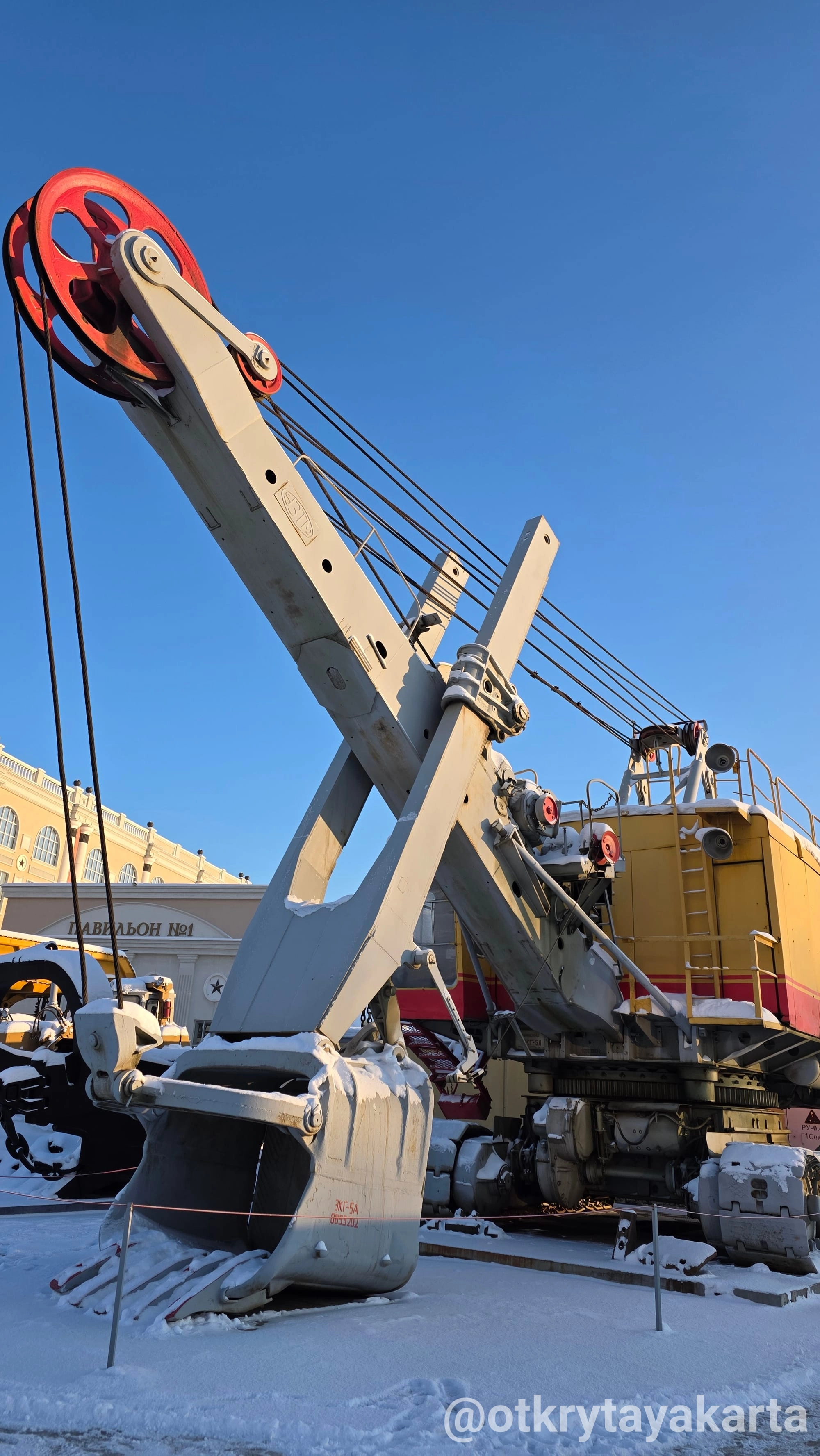 По другую сторону БелАЗ-75710 скромно, но достойно стоит экскаватор ЭКГ-5. Легендарный «пятак», как ласково называют его горняки. Он не пытается быть красивым — он пытается работать. И работал десятилетиями.