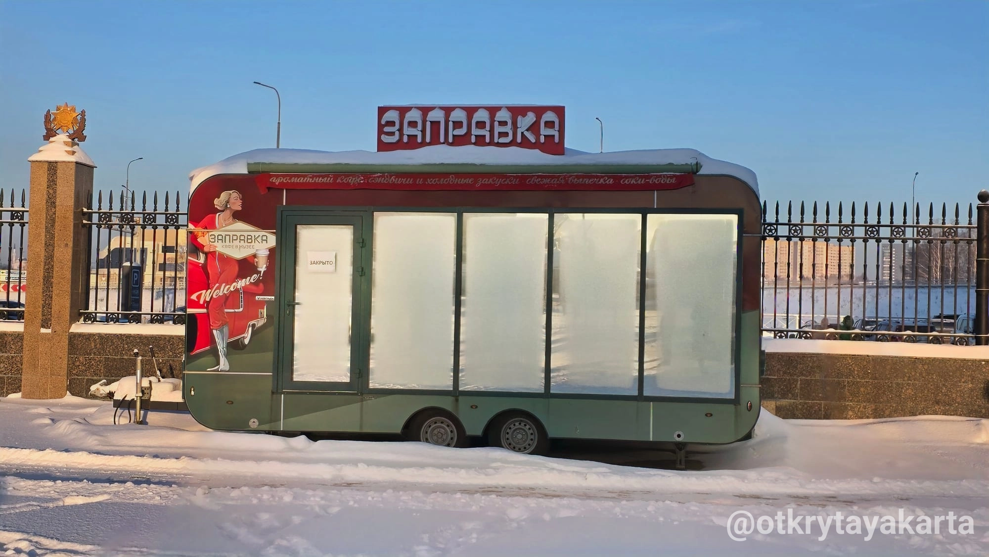 Среди автомобильной техники на улице нашлось и вот такое мобильное кафе «Заправка» с панорамными окнами. Ждёт тёплого времени года.