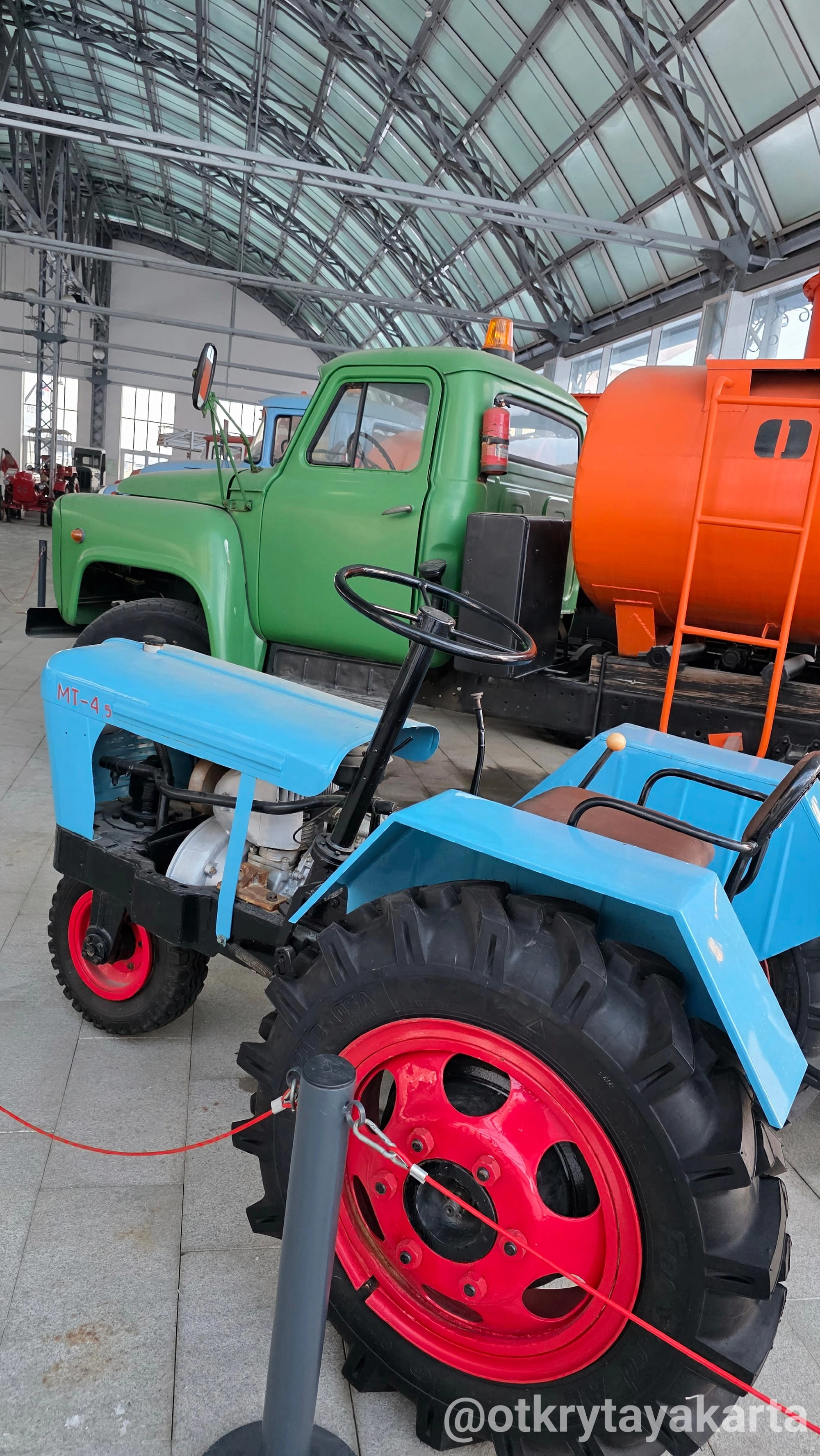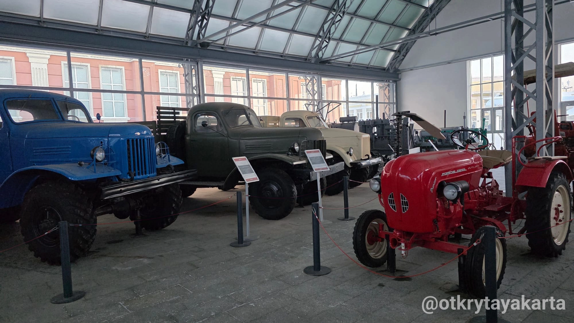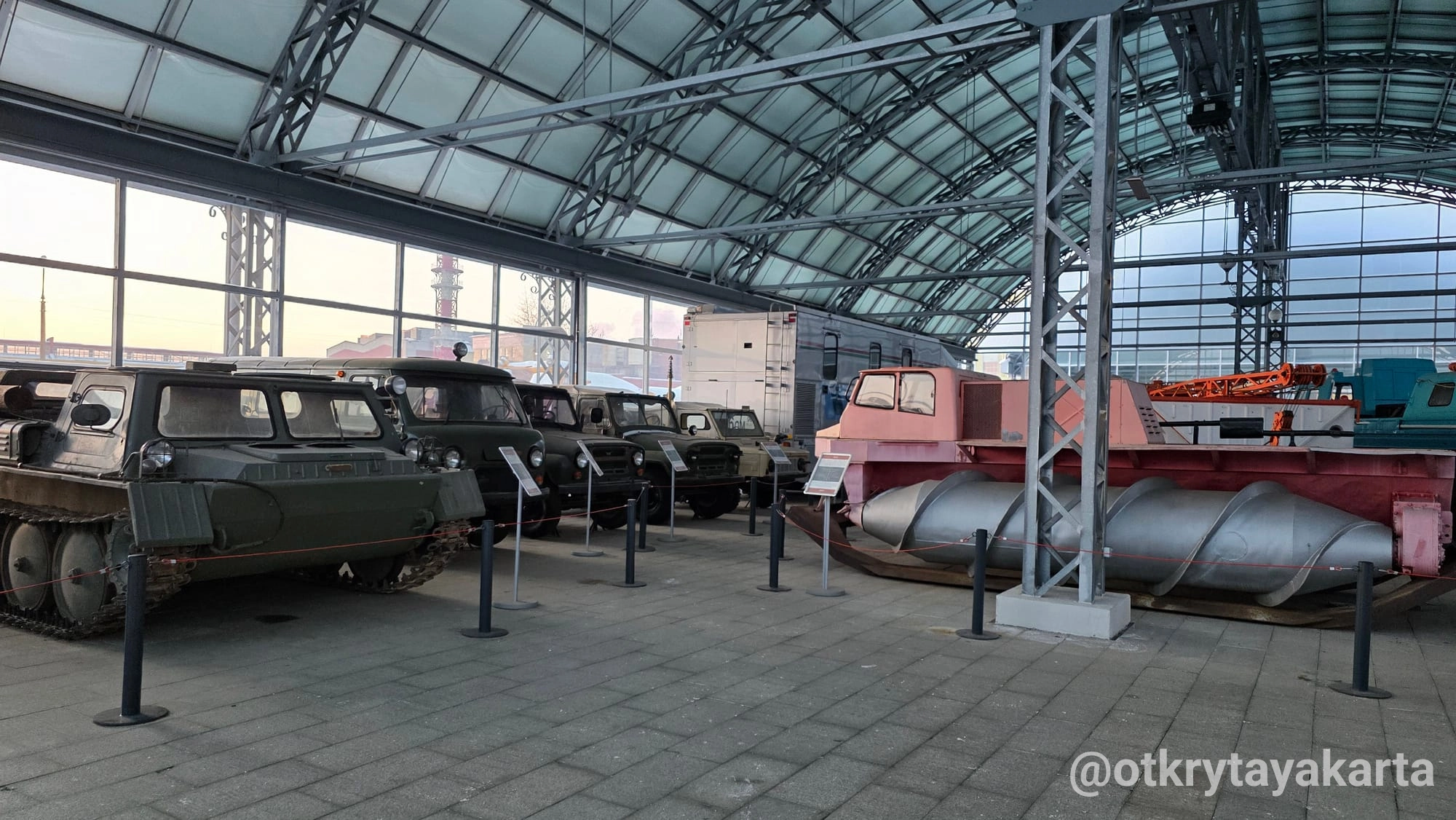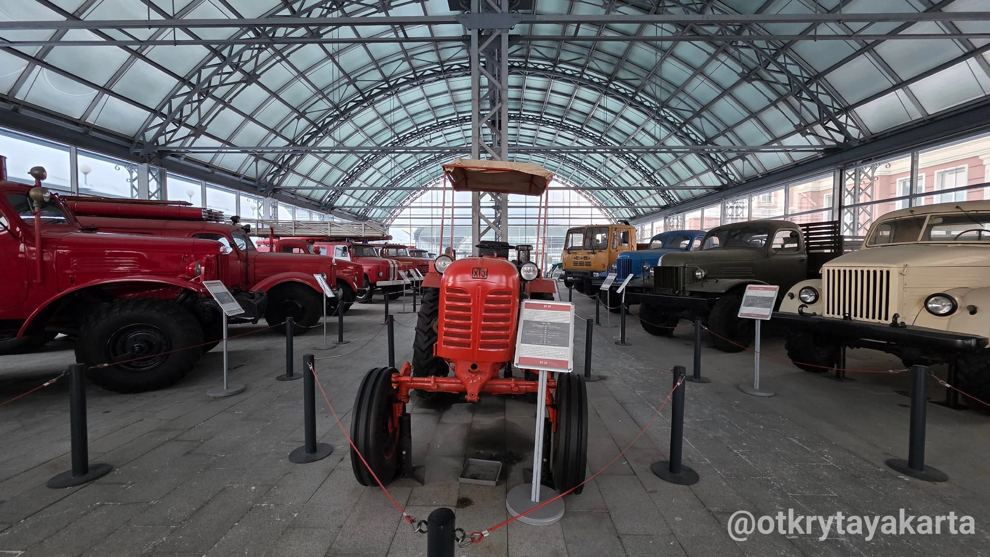 Экспозиция в стеклянных павильонах продолжает формироваться, однако уже сейчас она даёт представление о разнообразии советской колёсной техники — от сельскохозяйственных тракторов до массовых моделей автобусов и вездеходов.