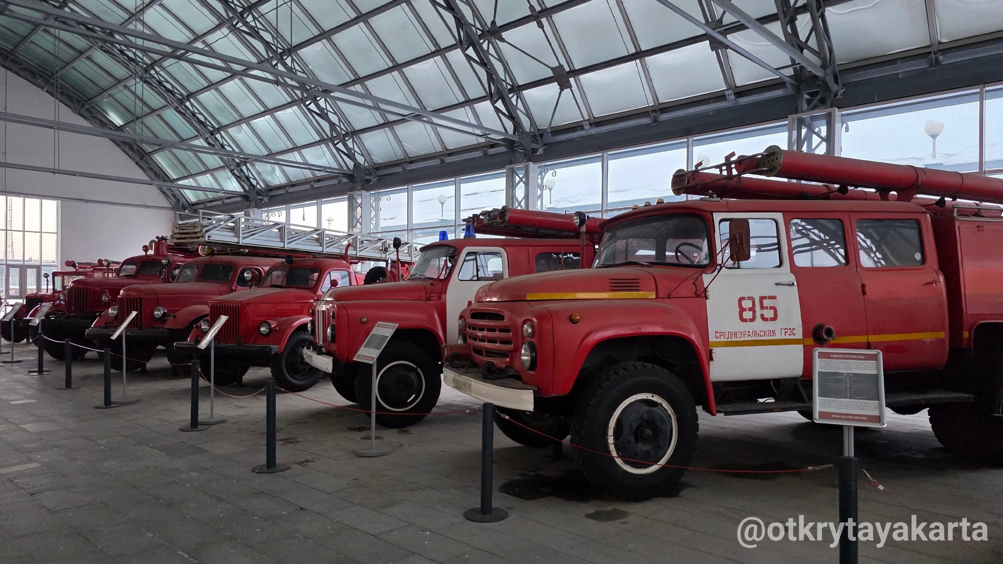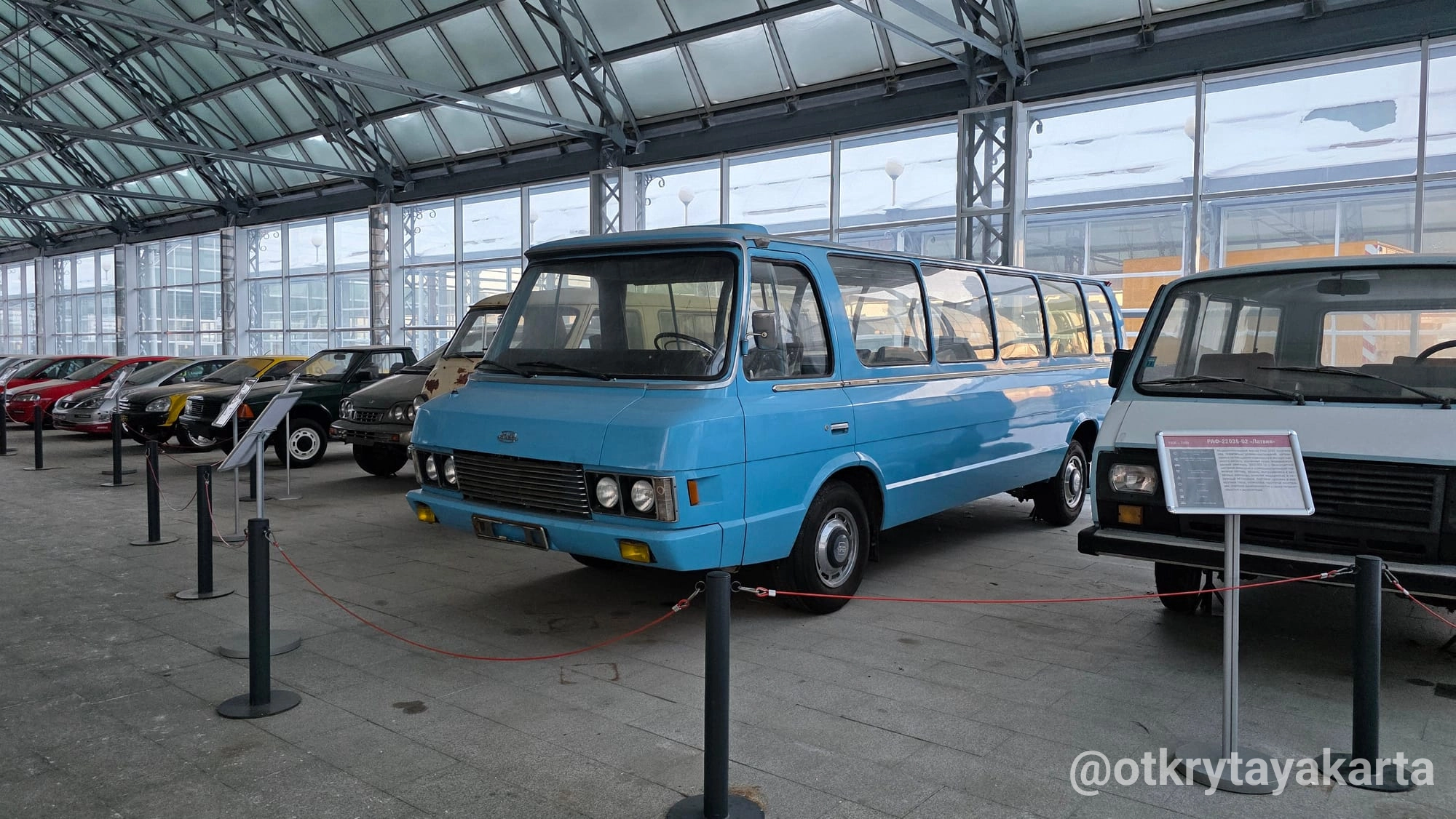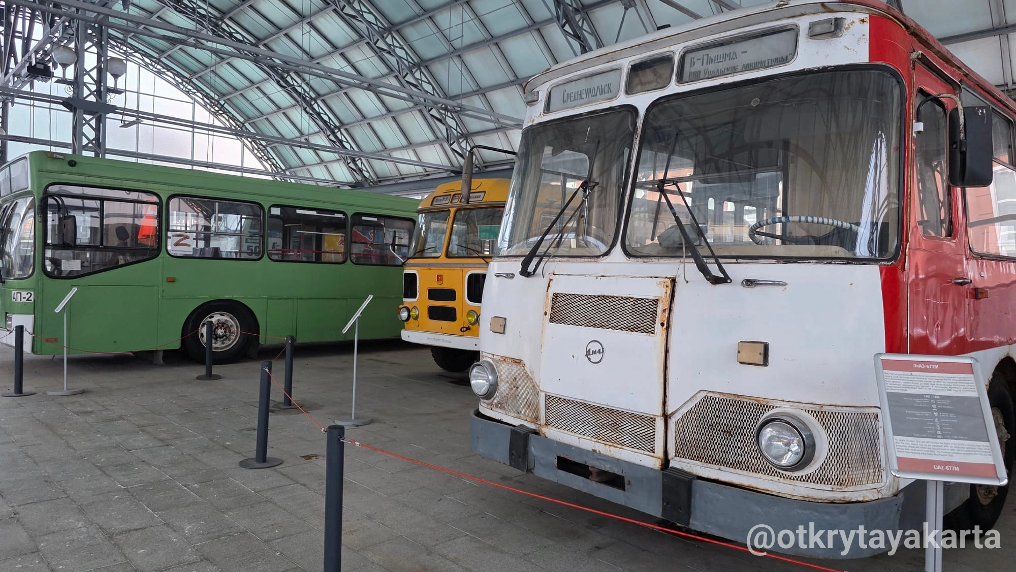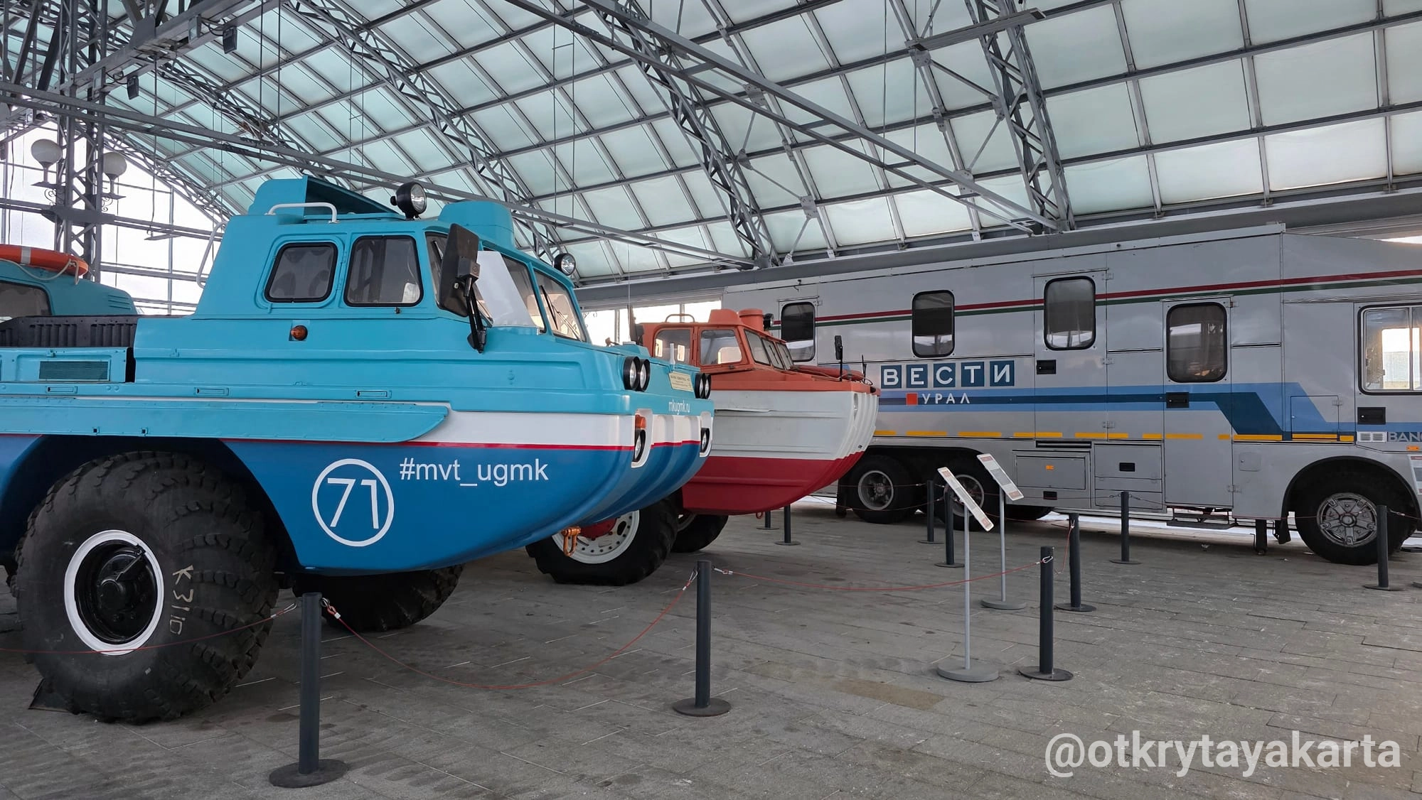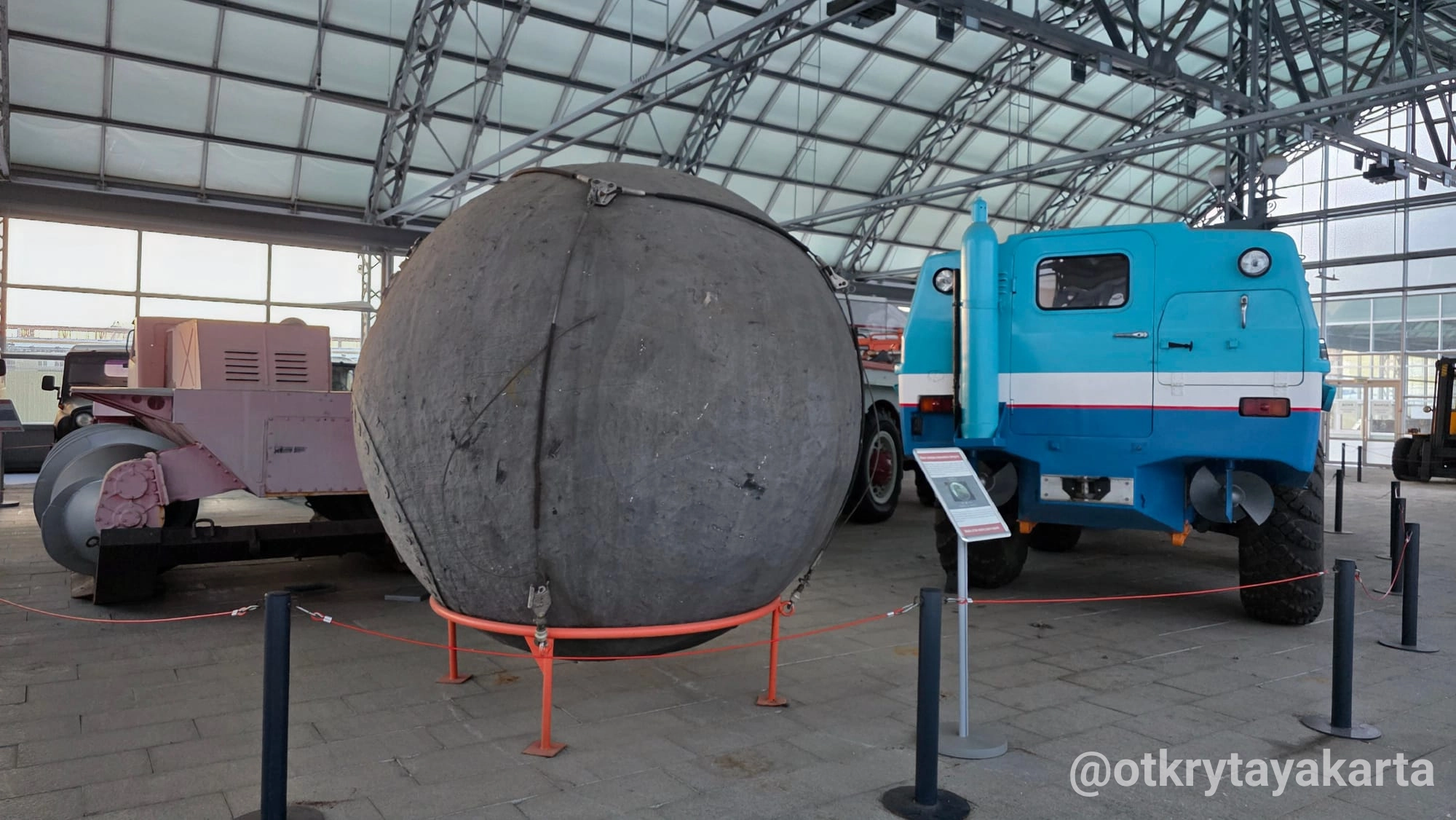 Экспозиция в стеклянных павильонах продолжает формироваться, однако уже сейчас она даёт представление о разнообразии советской колёсной техники — от сельскохозяйственных тракторов до массовых моделей автобусов и вездеходов.